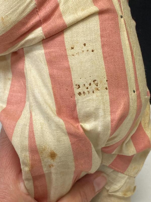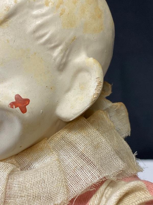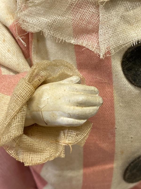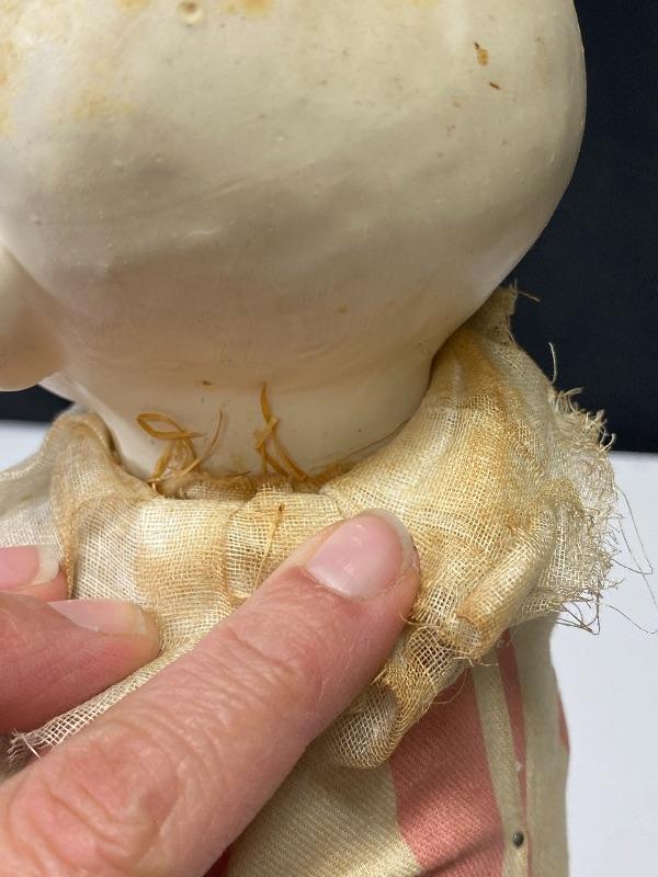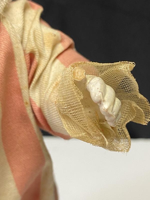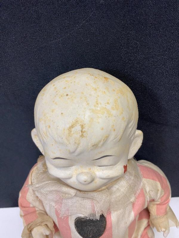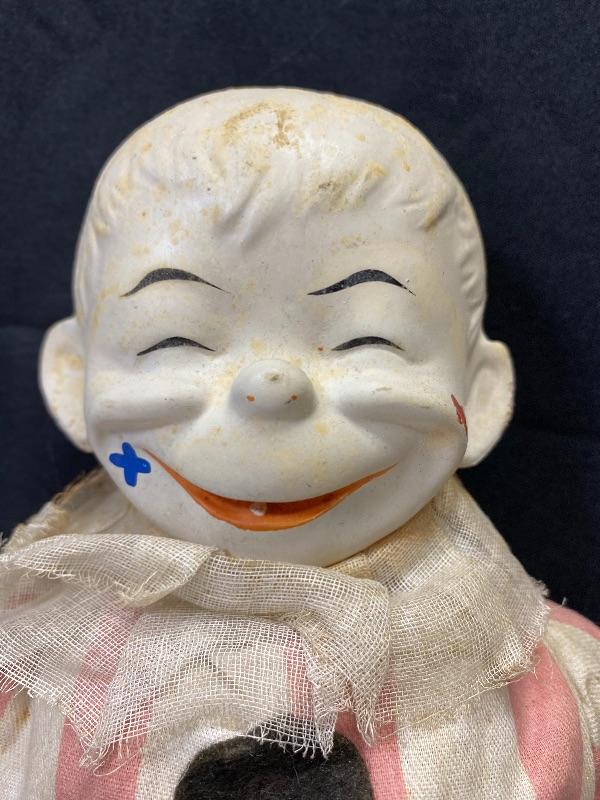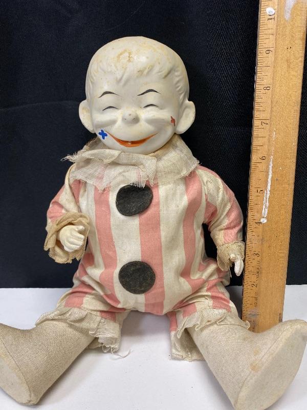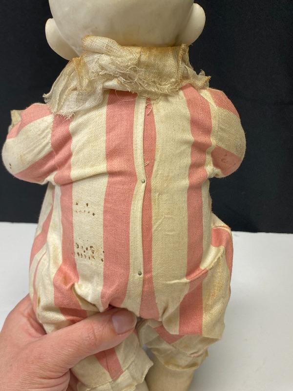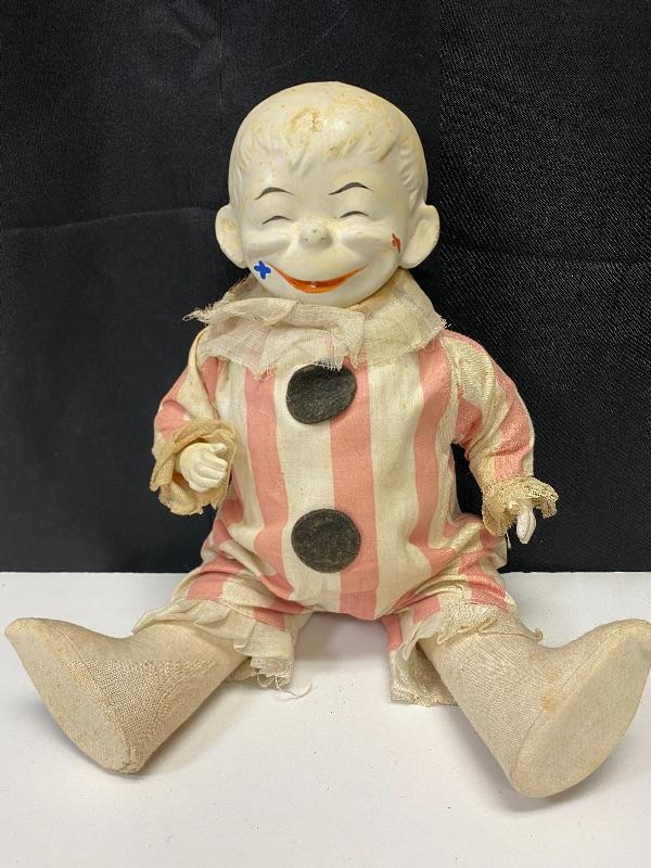 Vintage happy faced composite clown. Cloth body filled with straw. Composite head and hands. Pink and white outfit is tacked into the body on the back. A lot of discolor spots, broken thumb. Jointed limbs.