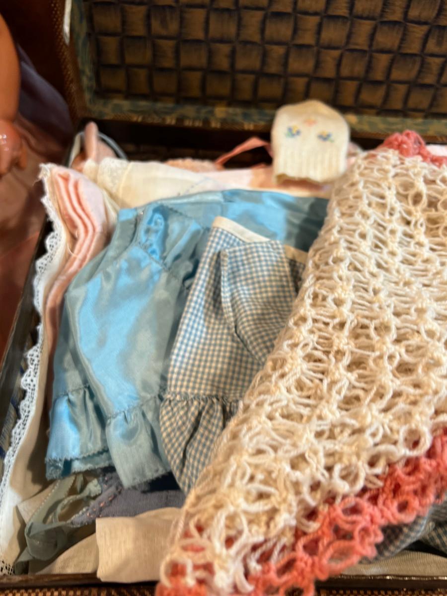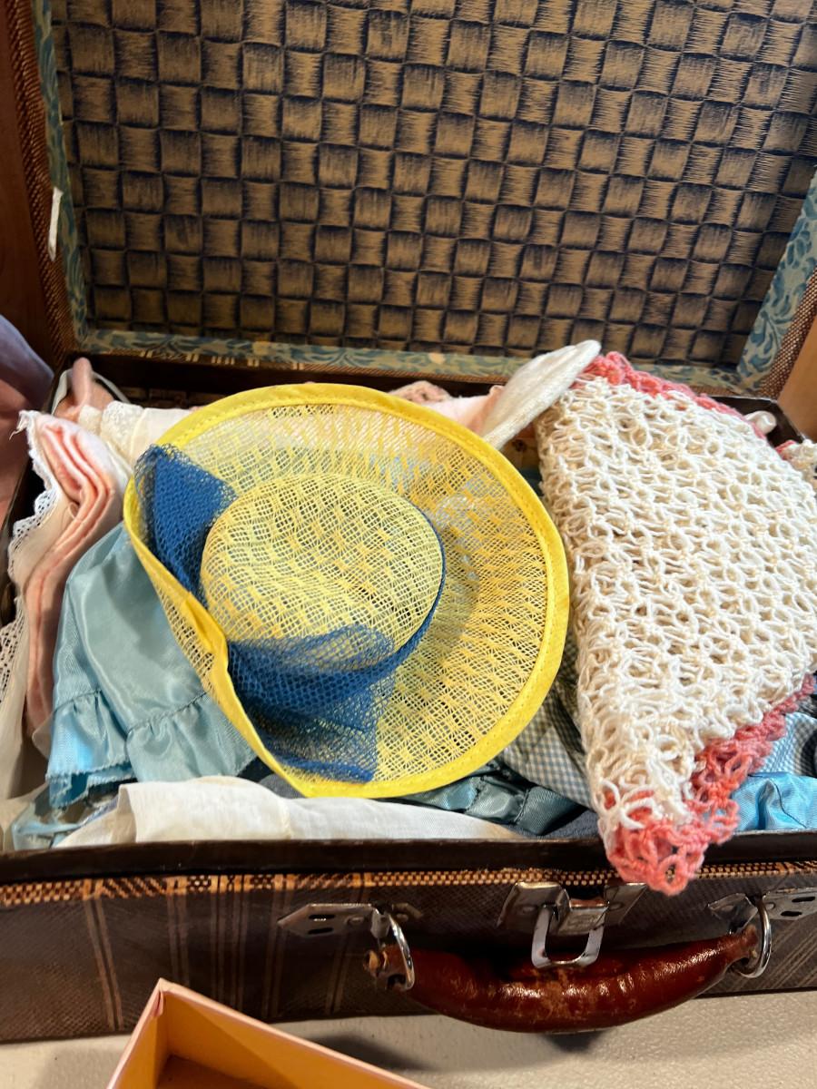 20" Long. Case is full of Clothing and Accessories. Clothing appears to be the size of the doll. Used.