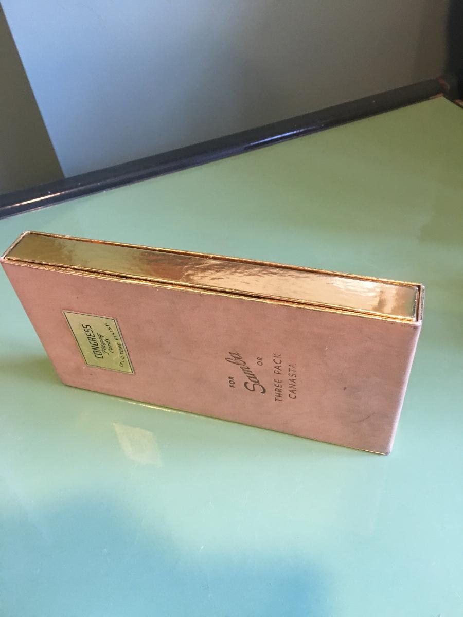 Vintage three decks of Congress playing cards with cat design. The cards are stored in a gold flocked box with gold trim. The cards have silver trim and gilding around edge. Instructions for card games are included. Cards and box show signs of use and age as shown in photos.