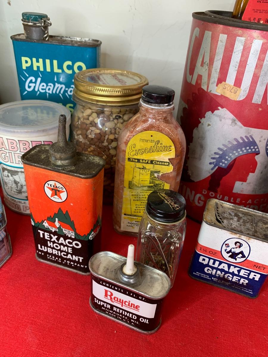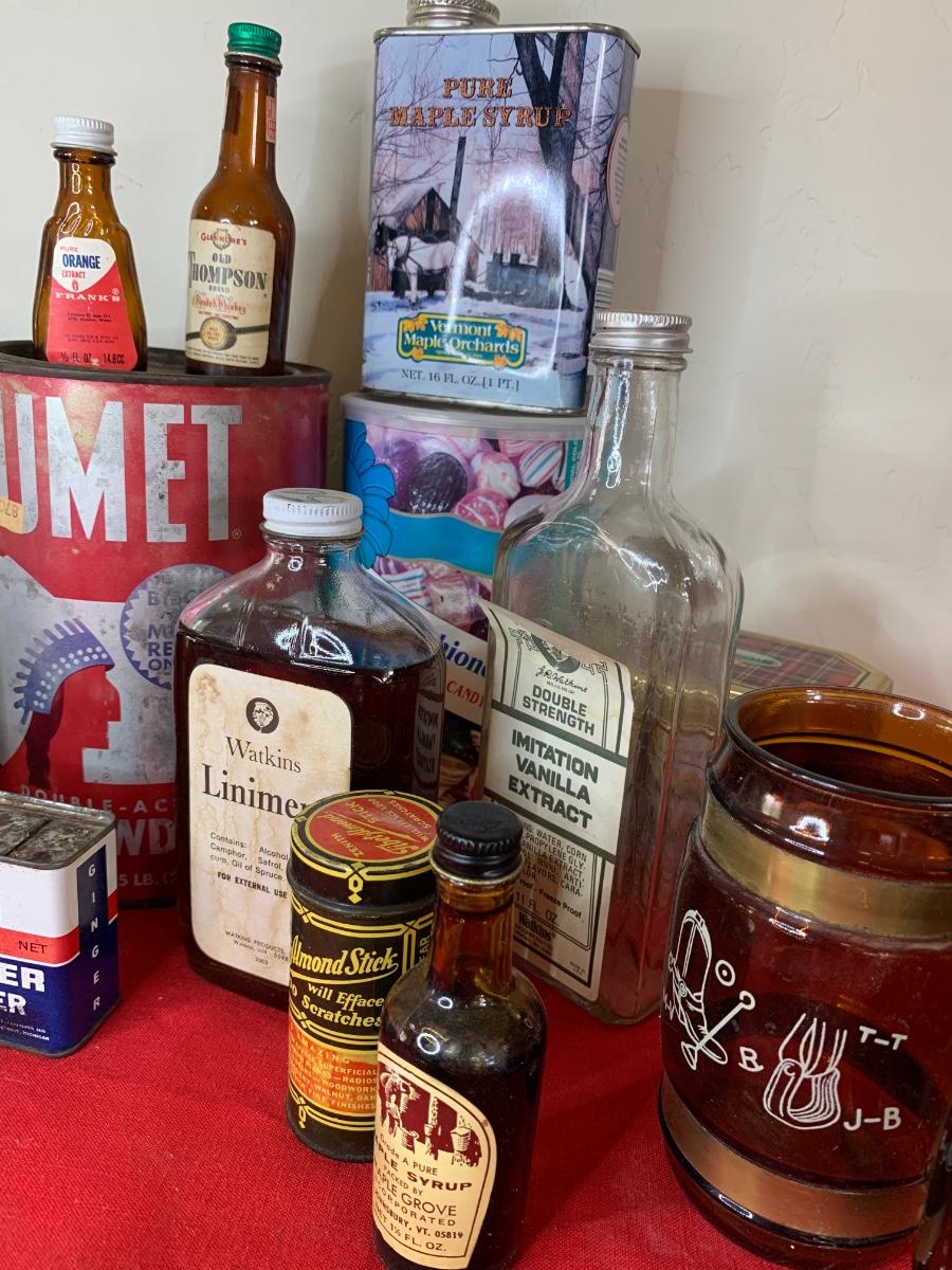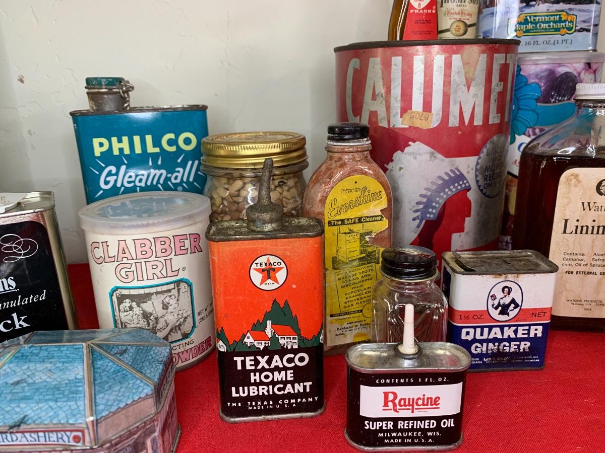 An assortment of vintage containers including, vanilla, Quaker ginger, Texaco home lubricant, Watkins granulated black pepper, Watkins liniment, Philco polish, Claumet baking powder and more
