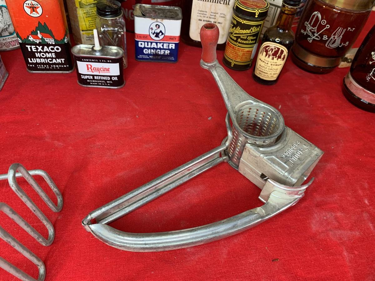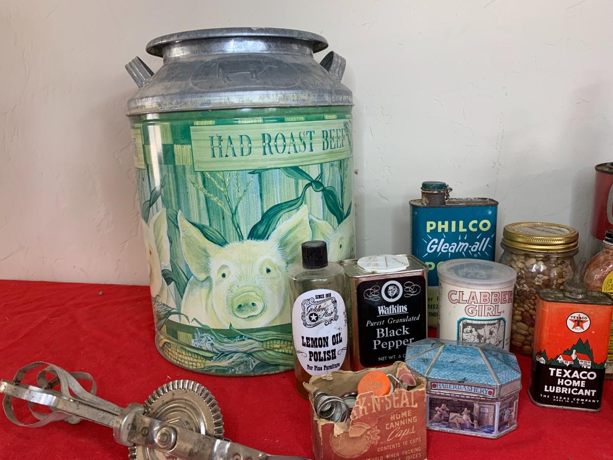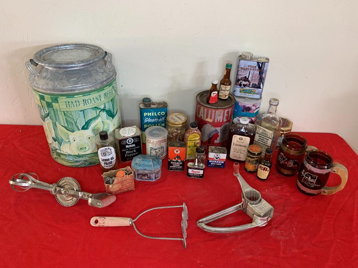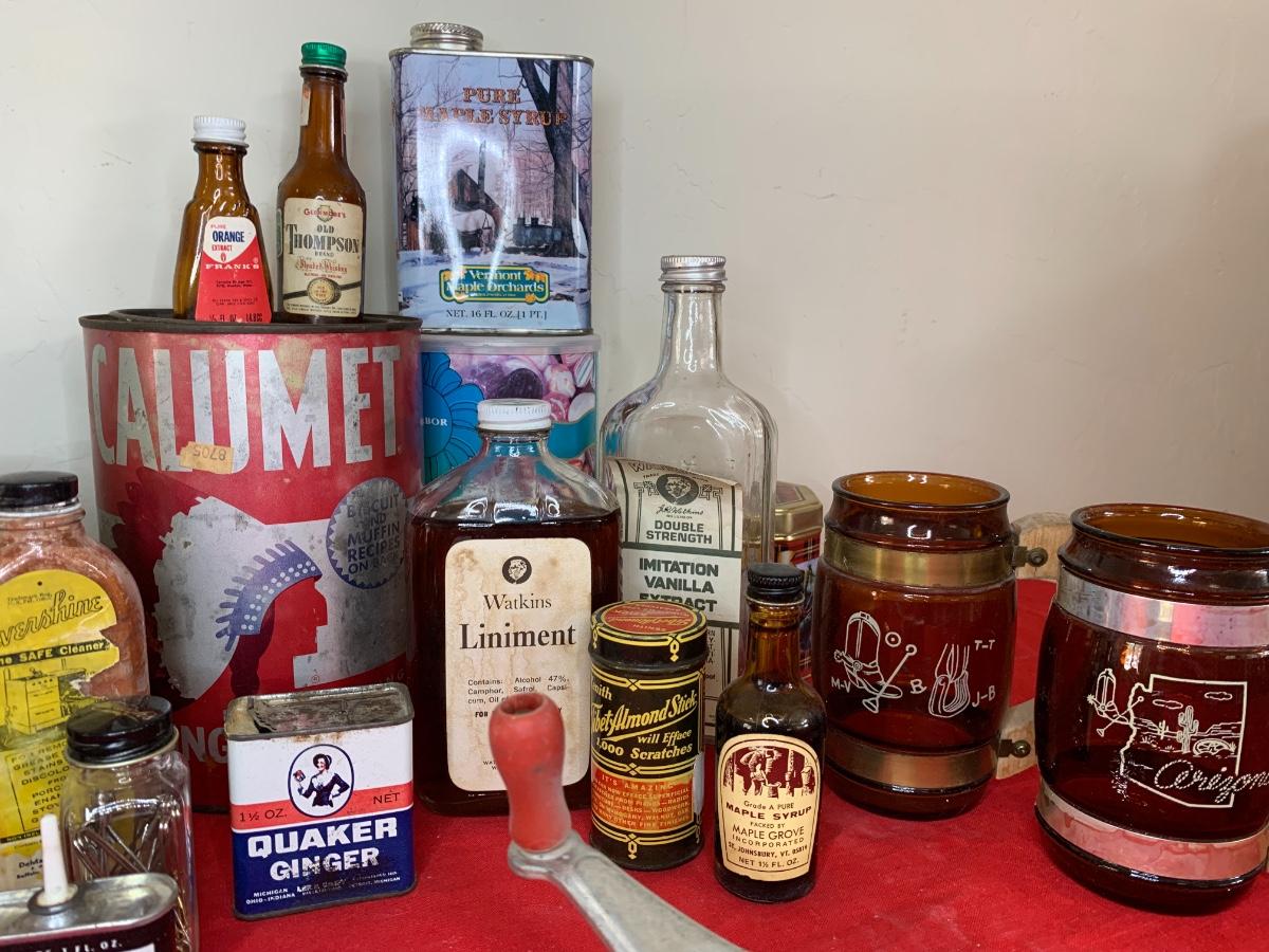 An assortment of vintage containers including, vanilla, Quaker ginger, Texaco home lubricant, Watkins granulated black pepper, Watkins liniment, Philco polish, Claumet baking powder and more
