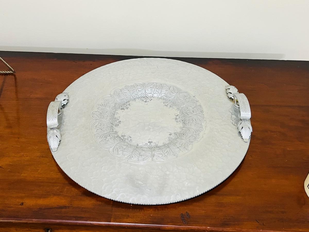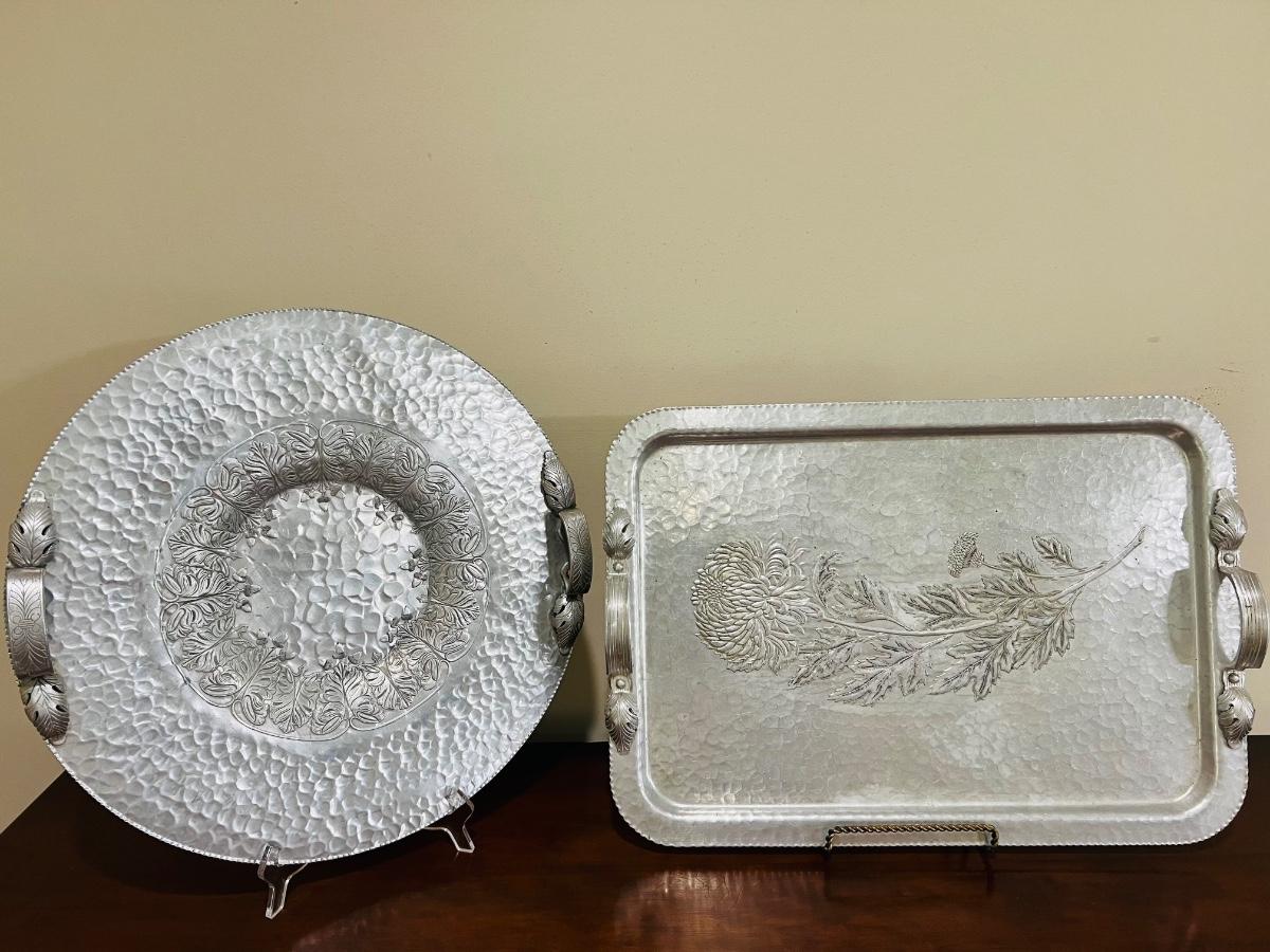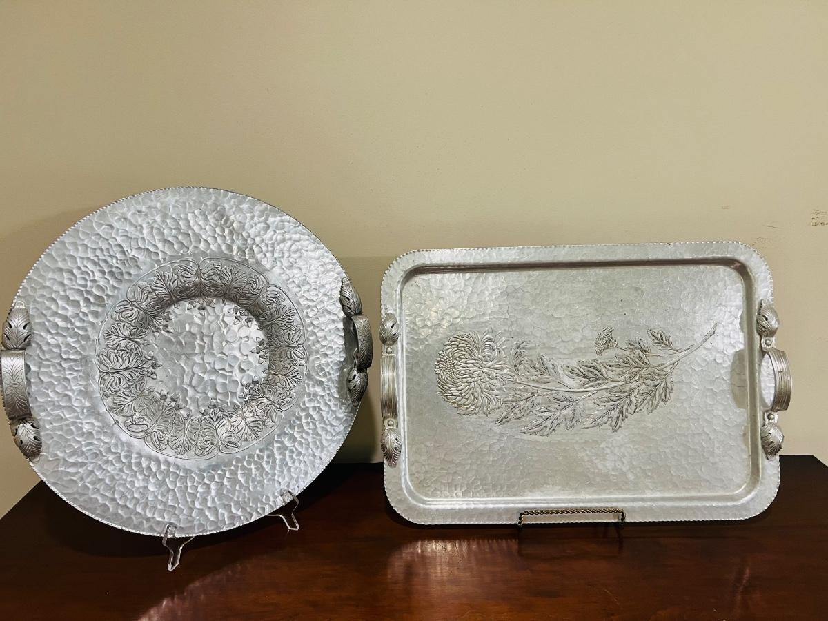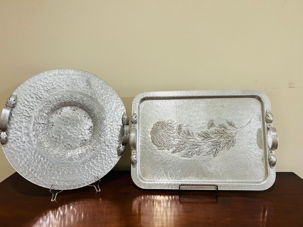 Vintage Continental Hand Wrought Round Hammered Aluminum Tray Platter rectangular server with flower number 574 and round server number 582