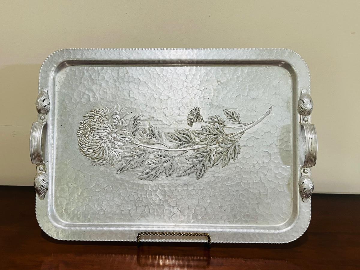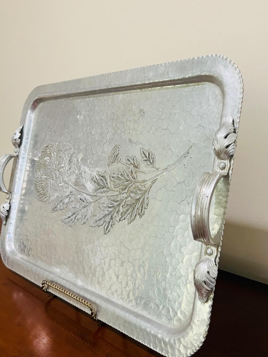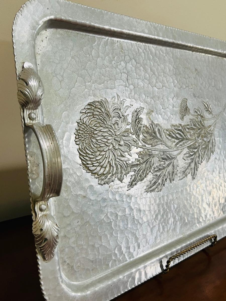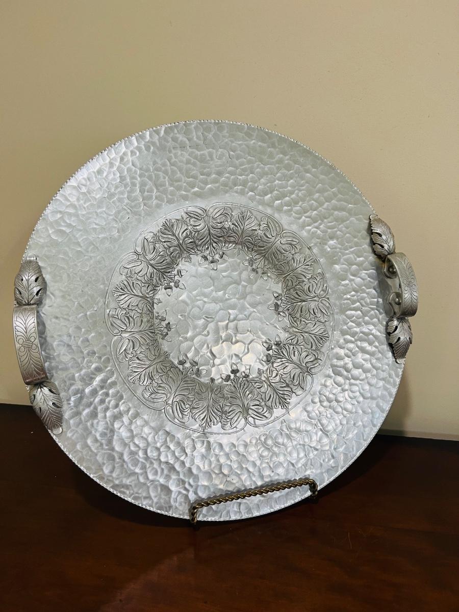 Vintage Continental Hand Wrought Round Hammered Aluminum Tray Platter rectangular server with flower number 574 and round server number 582