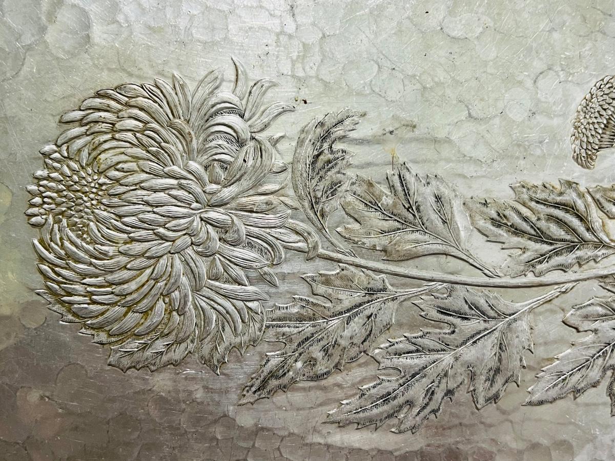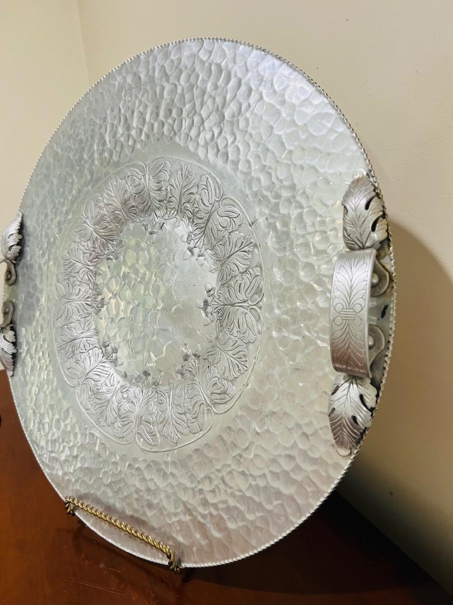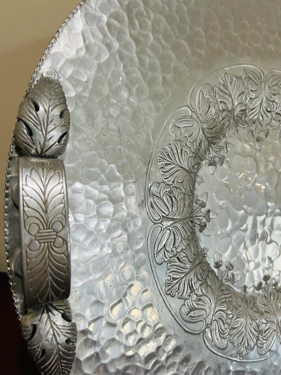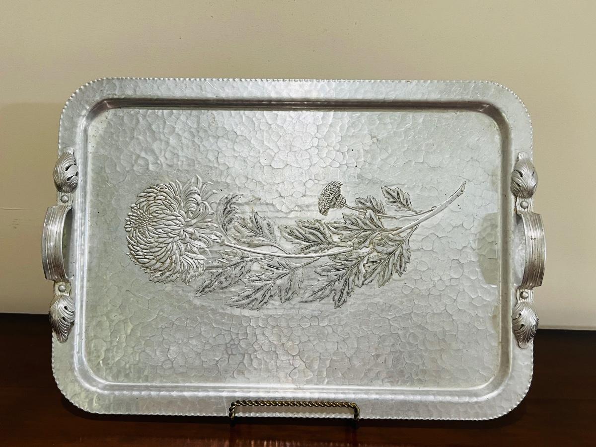Vintage Continental Hand Wrought Round Hammered Aluminum Tray Platter rectangular server with flower number 574 and round server number 582