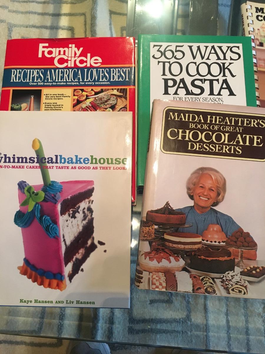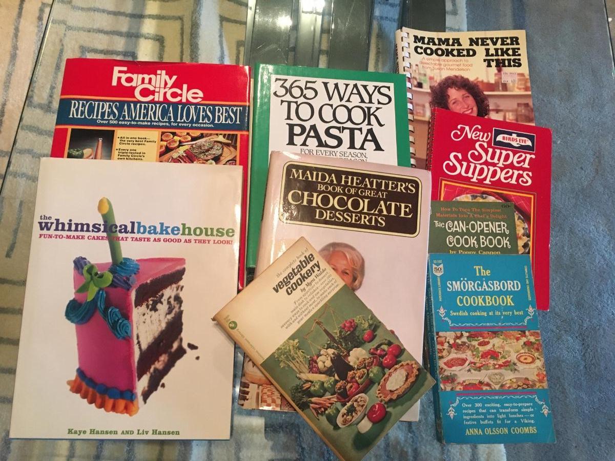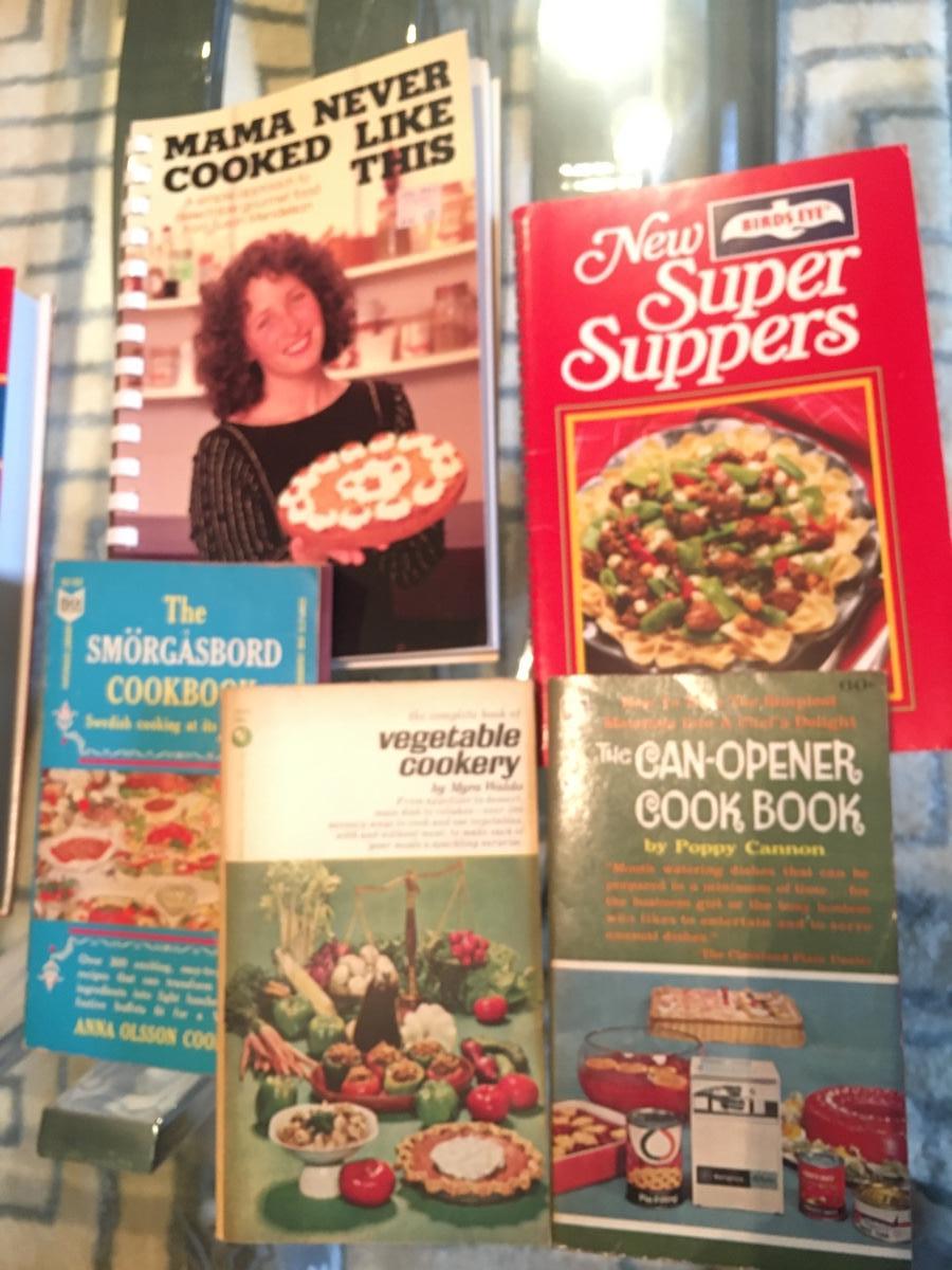 Assorted cookbooks with long forgotten recipes begging to be prepared once again!