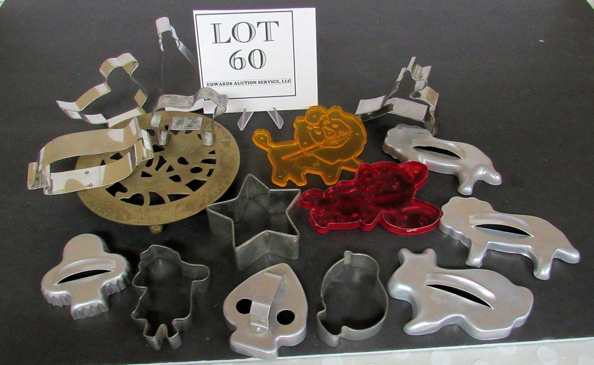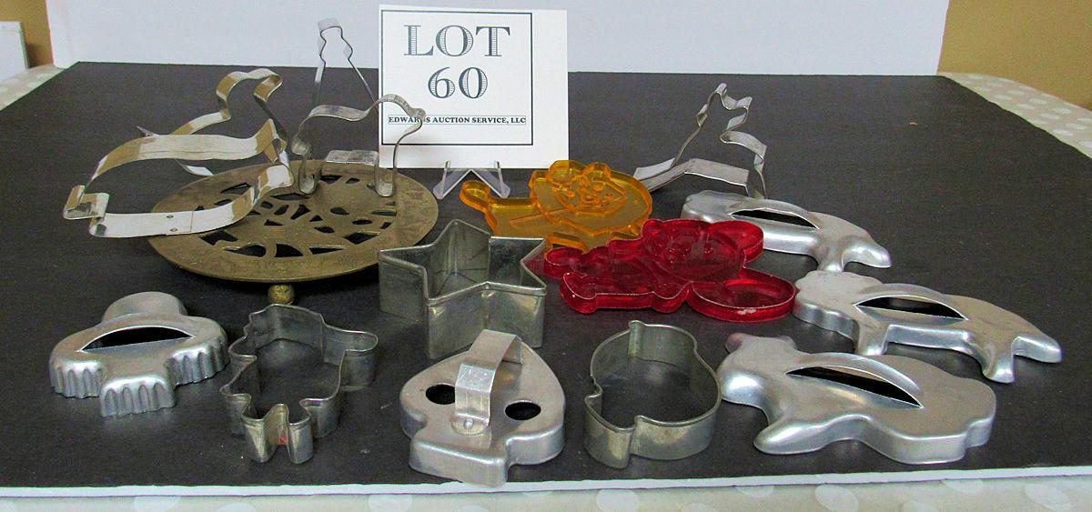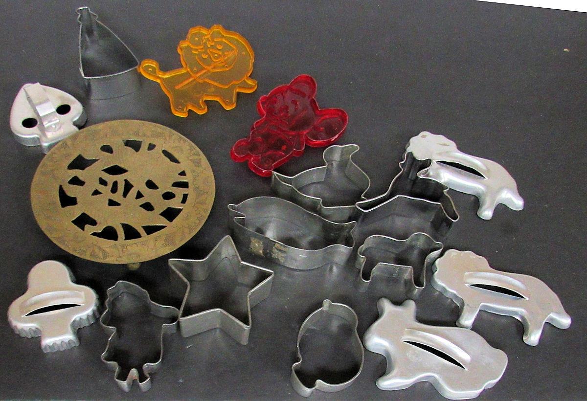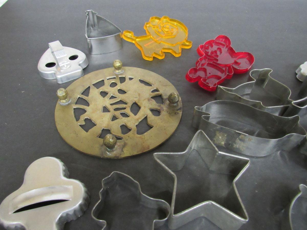 Vintage Aluminum and Plastic Cookie Cutters and Brass Trivet