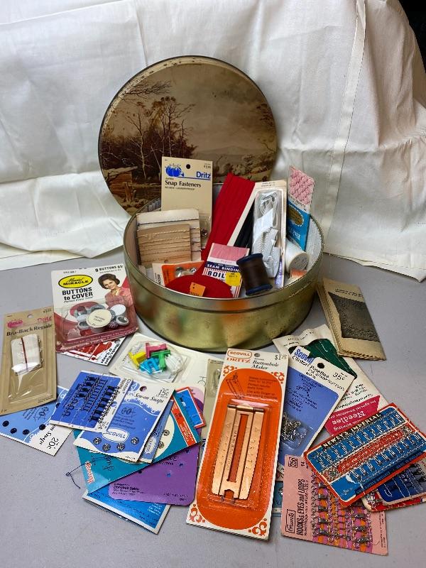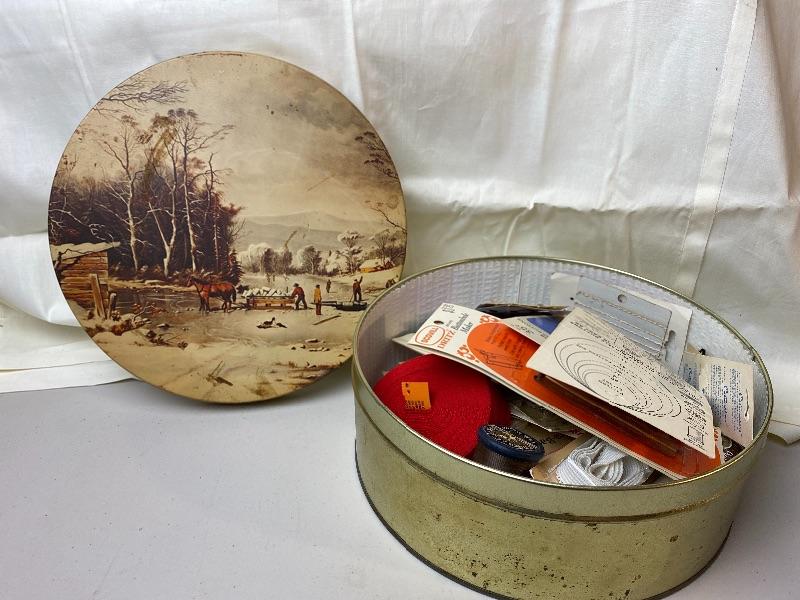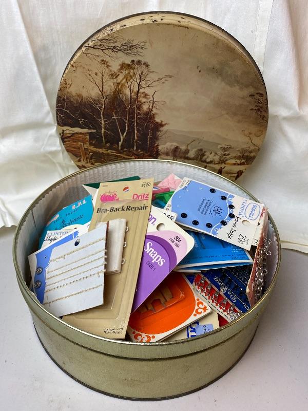 Vintage Cookie Tin with Sewing Notions Spools Bobbin Fasteners Buttons