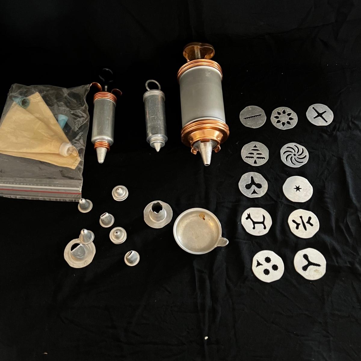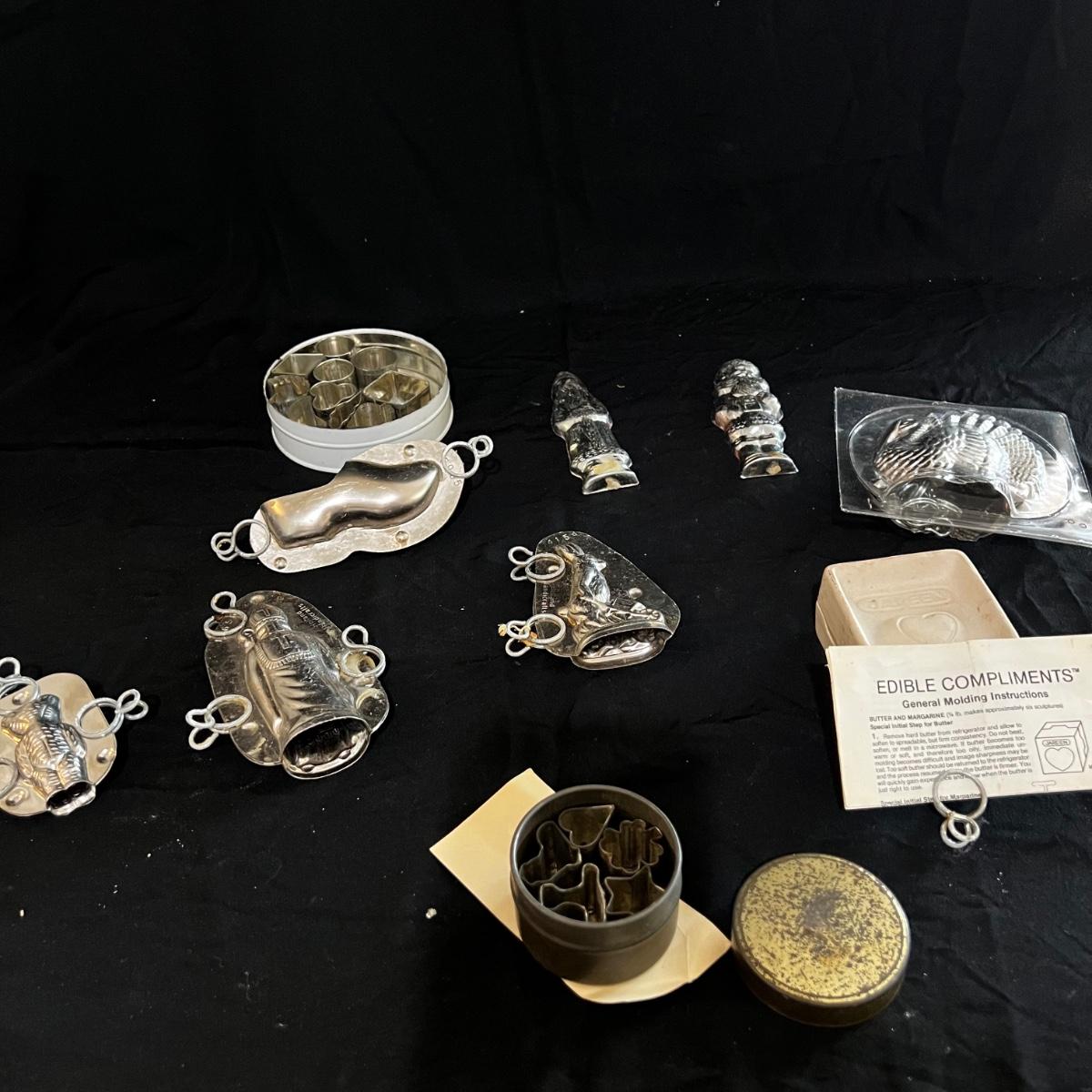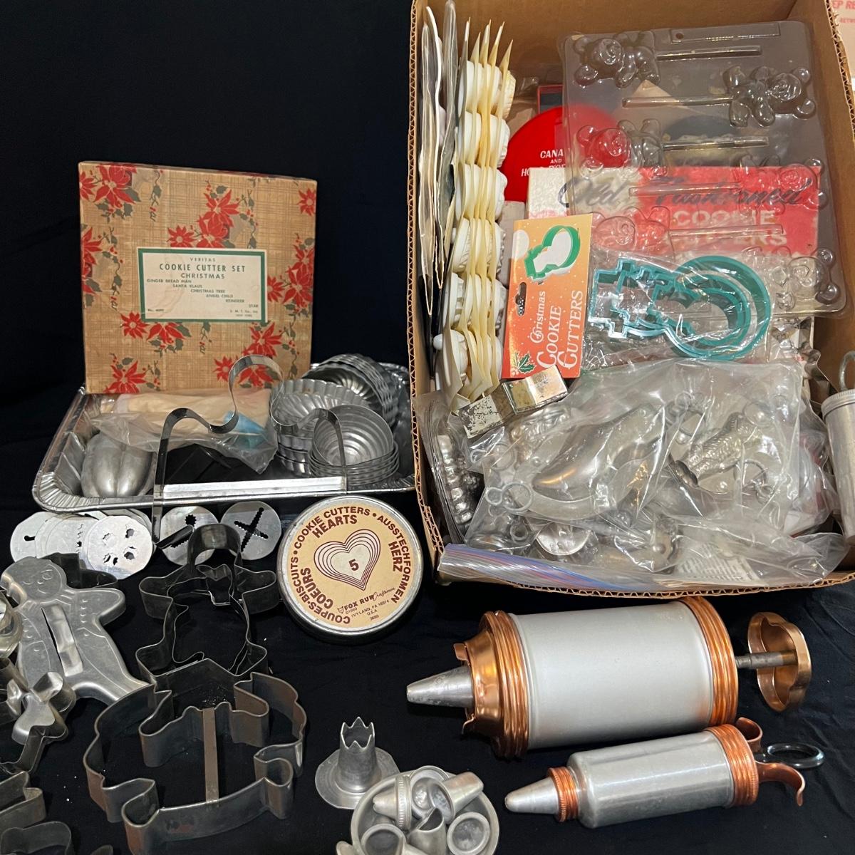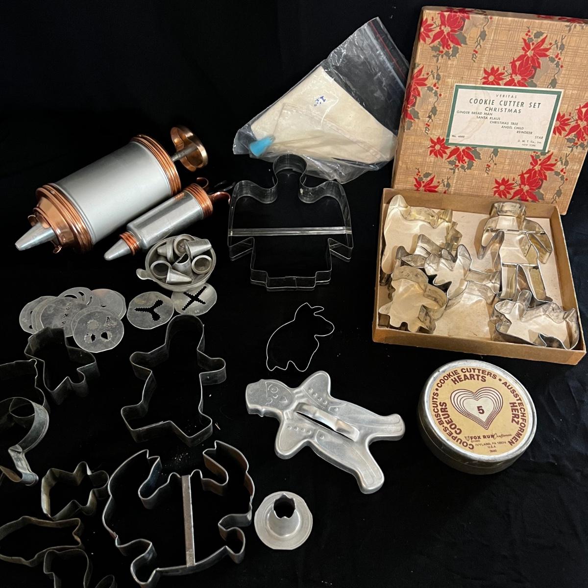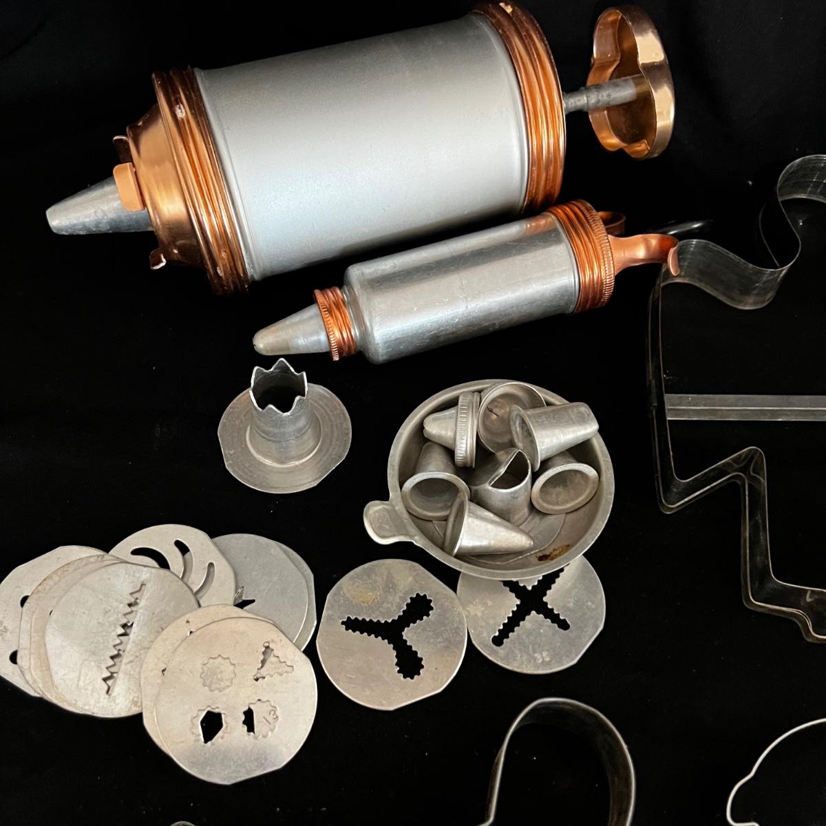 130+ vintage cookie cutters of all sizes, for all occasions and many, many shapes. Three piping cookie presses with 11 shapes and eight tips as well as a bag. Also included are 60+ tartlet tins. Butter molds and candy molds as shown.