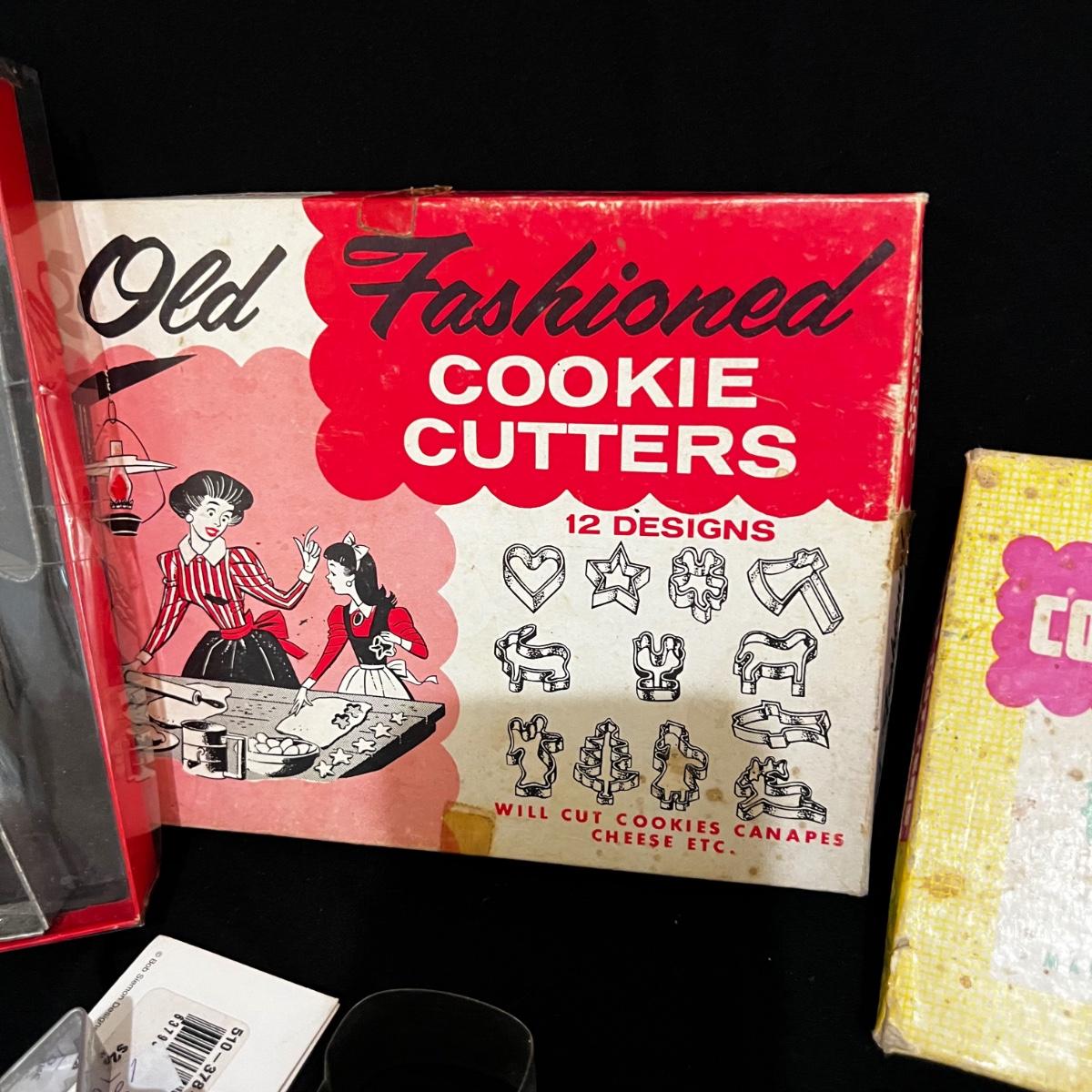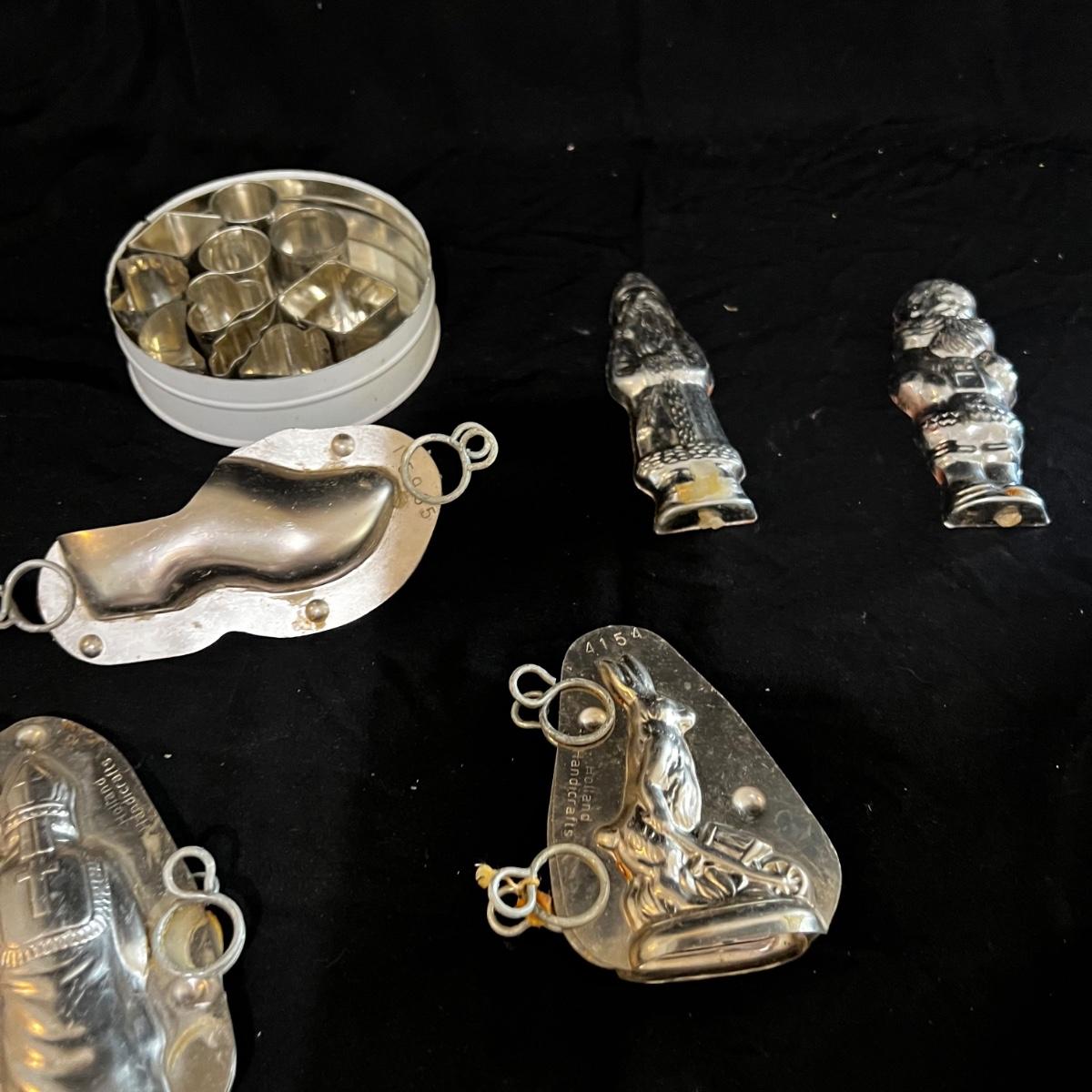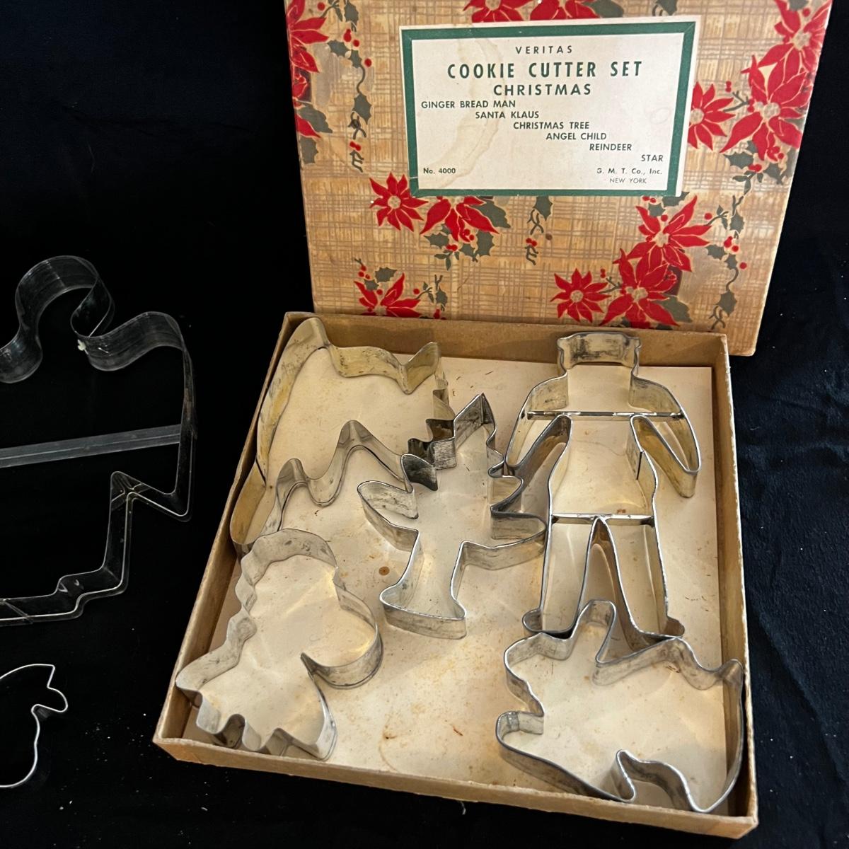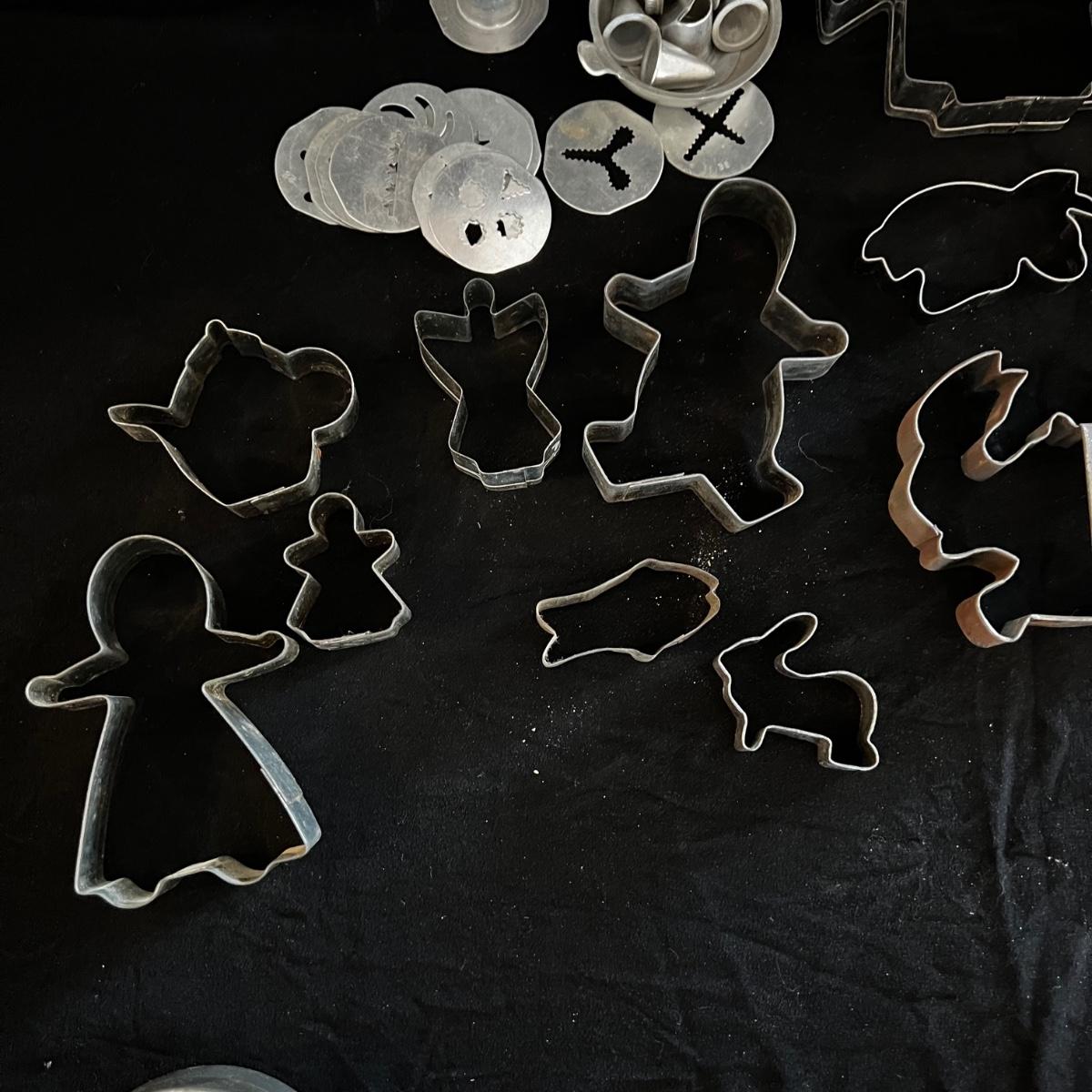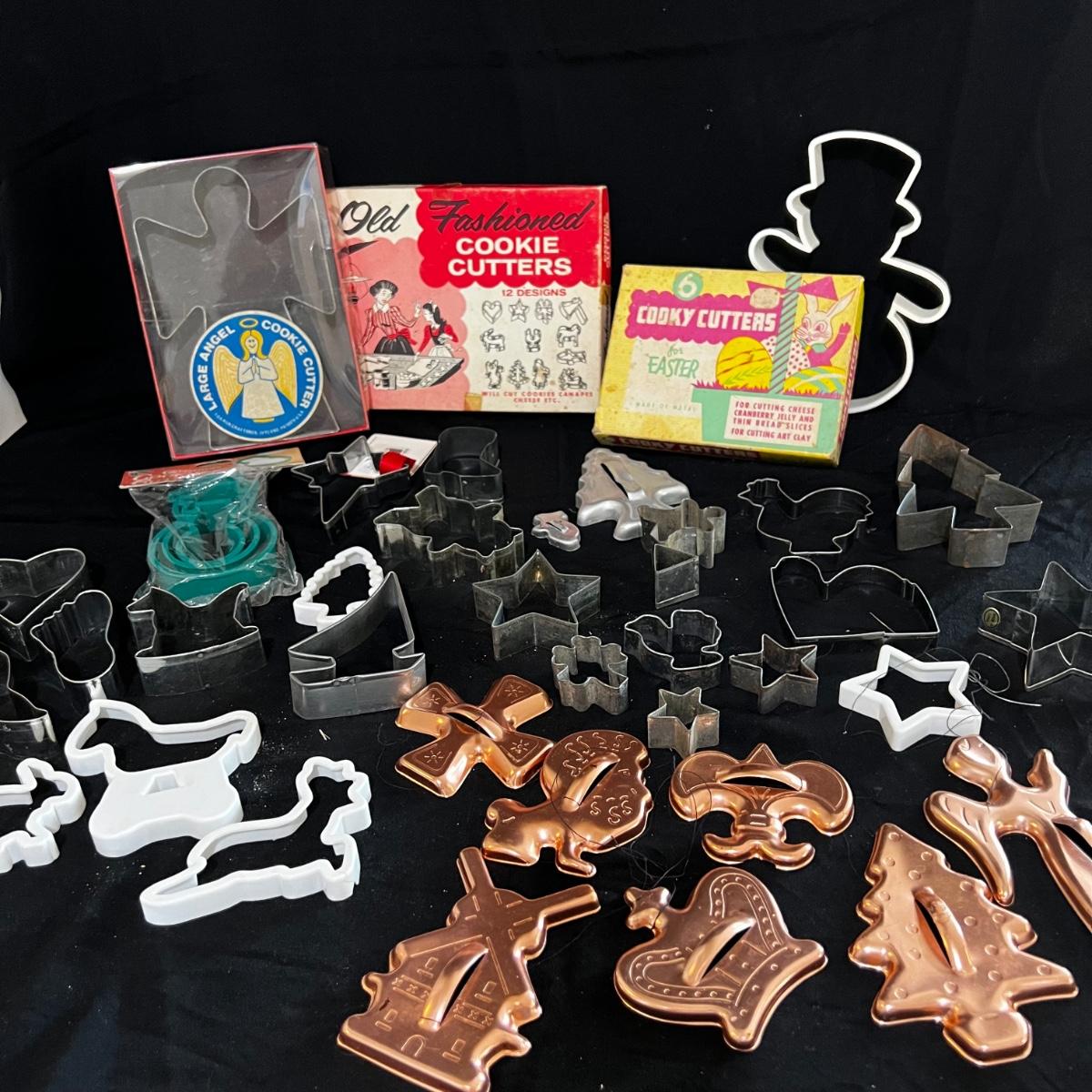 130+ vintage cookie cutters of all sizes, for all occasions and many, many shapes. Three piping cookie presses with 11 shapes and eight tips as well as a bag. Also included are 60+ tartlet tins. Butter molds and candy molds as shown.
