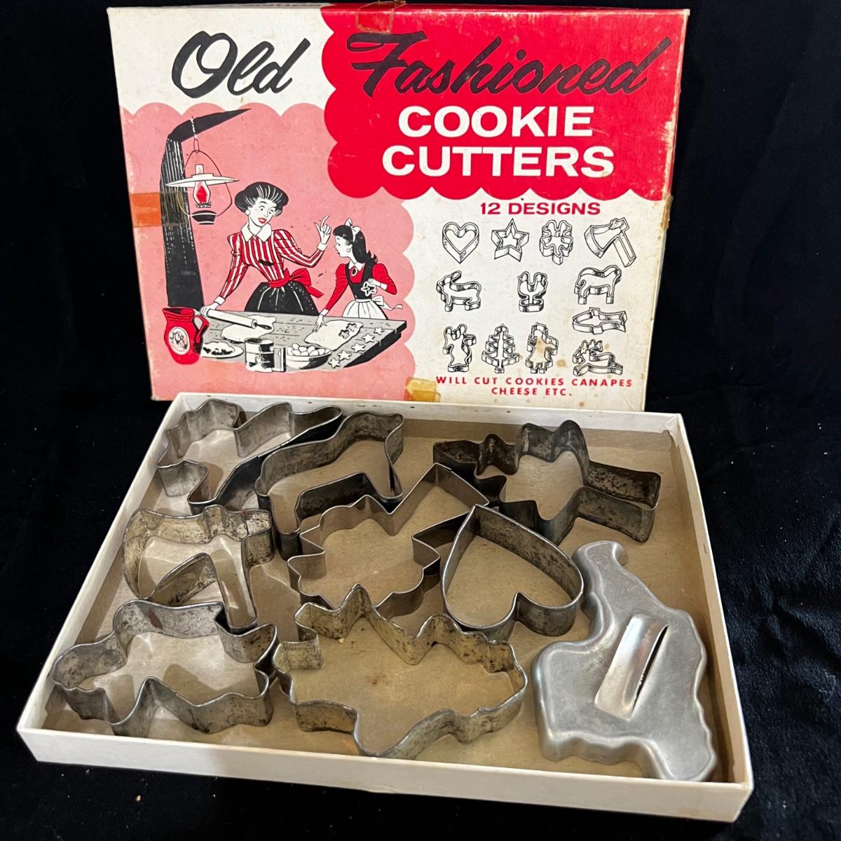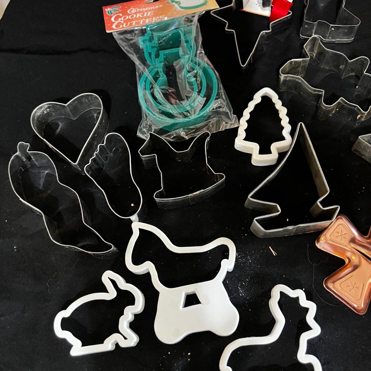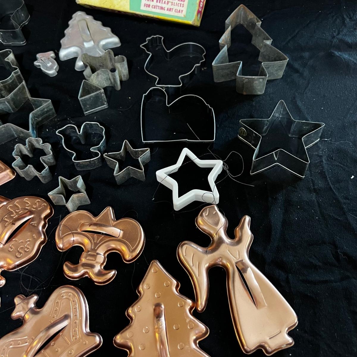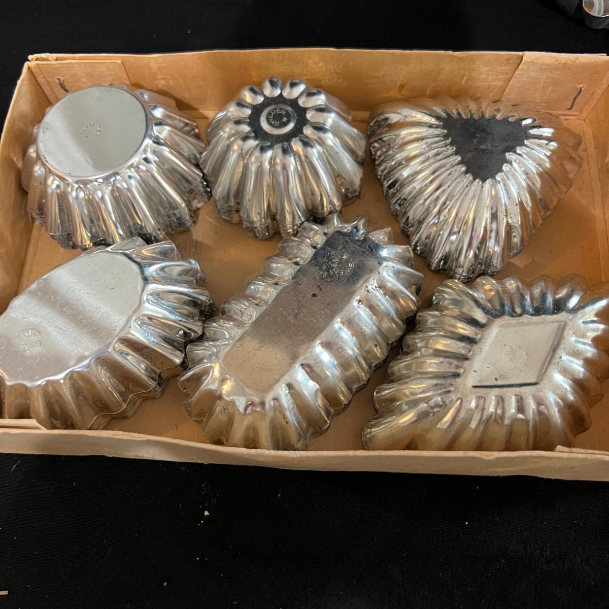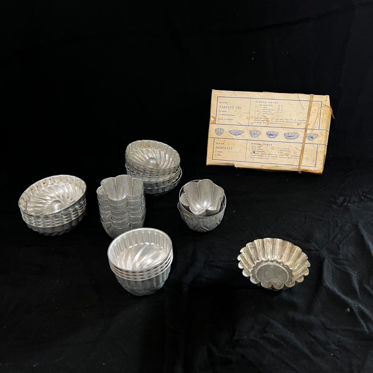 130+ vintage cookie cutters of all sizes, for all occasions and many, many shapes. Three piping cookie presses with 11 shapes and eight tips as well as a bag. Also included are 60+ tartlet tins. Butter molds and candy molds as shown.