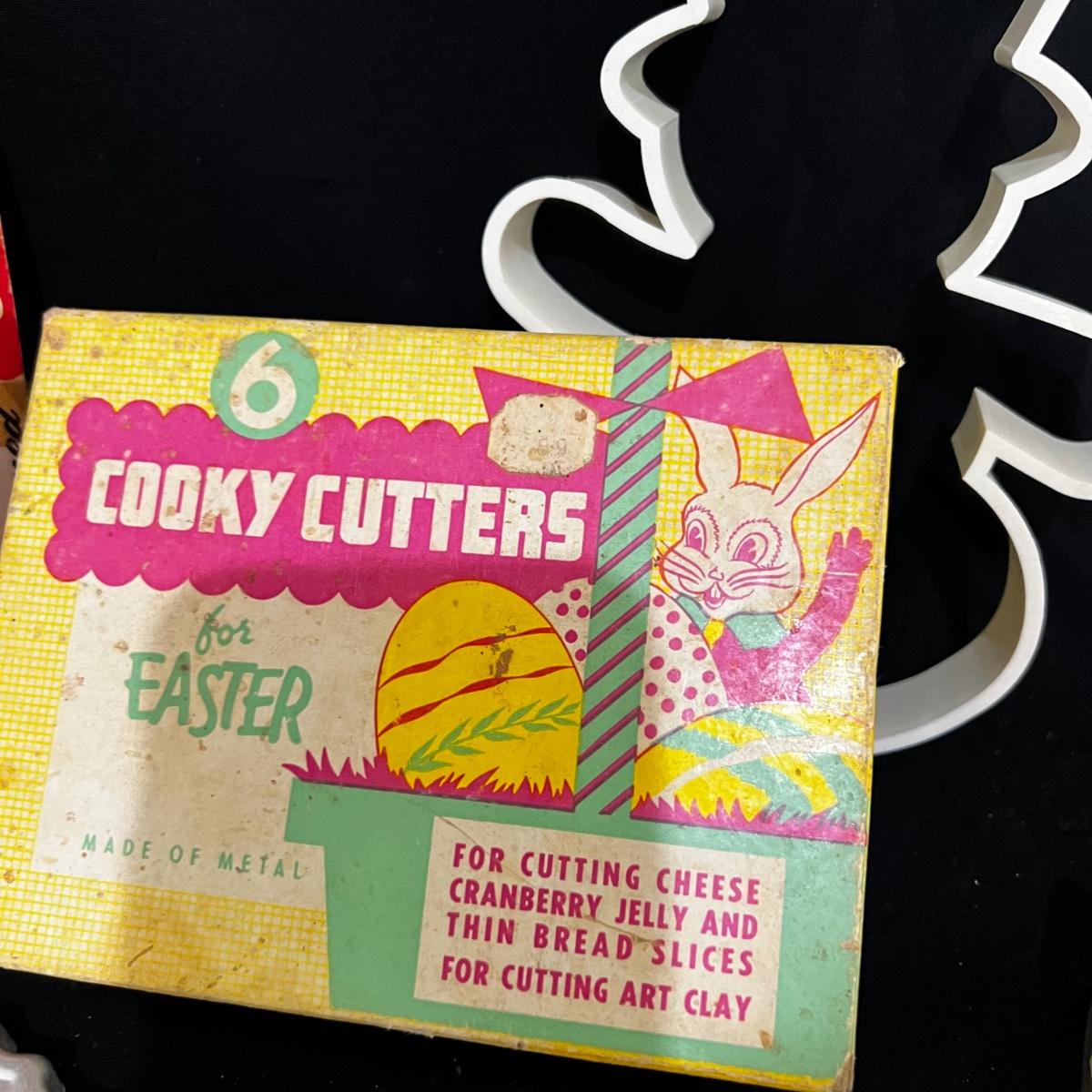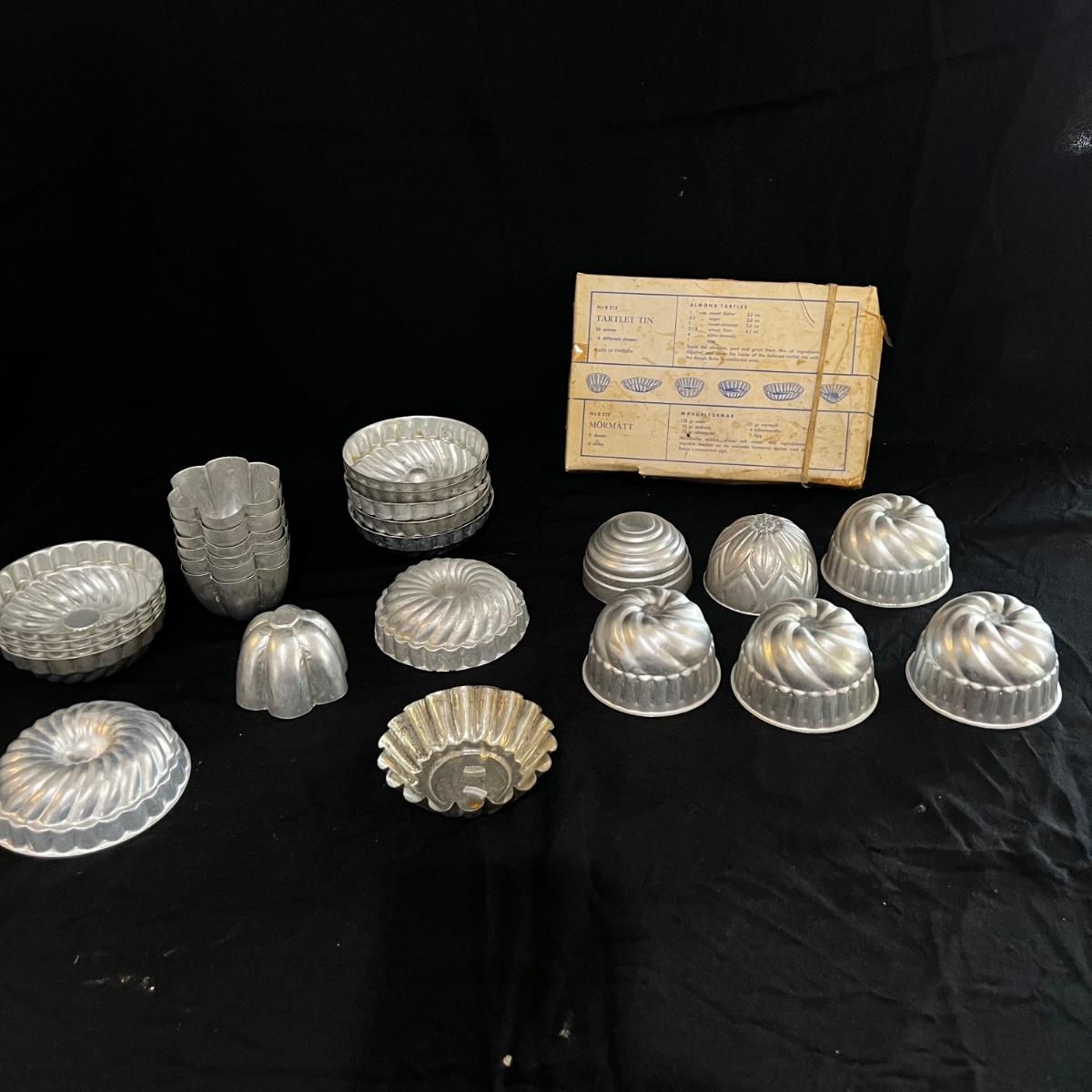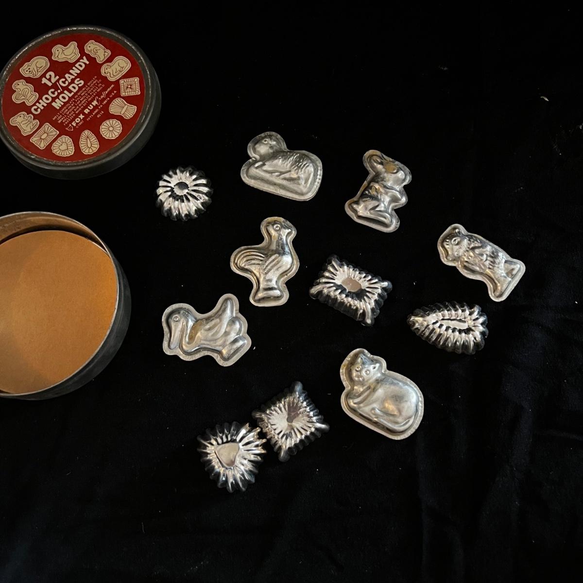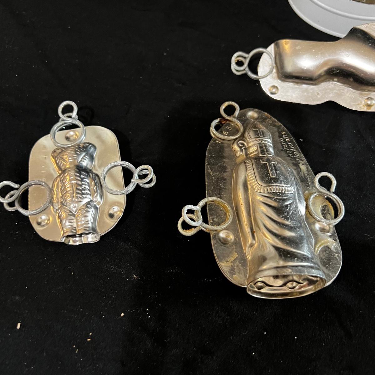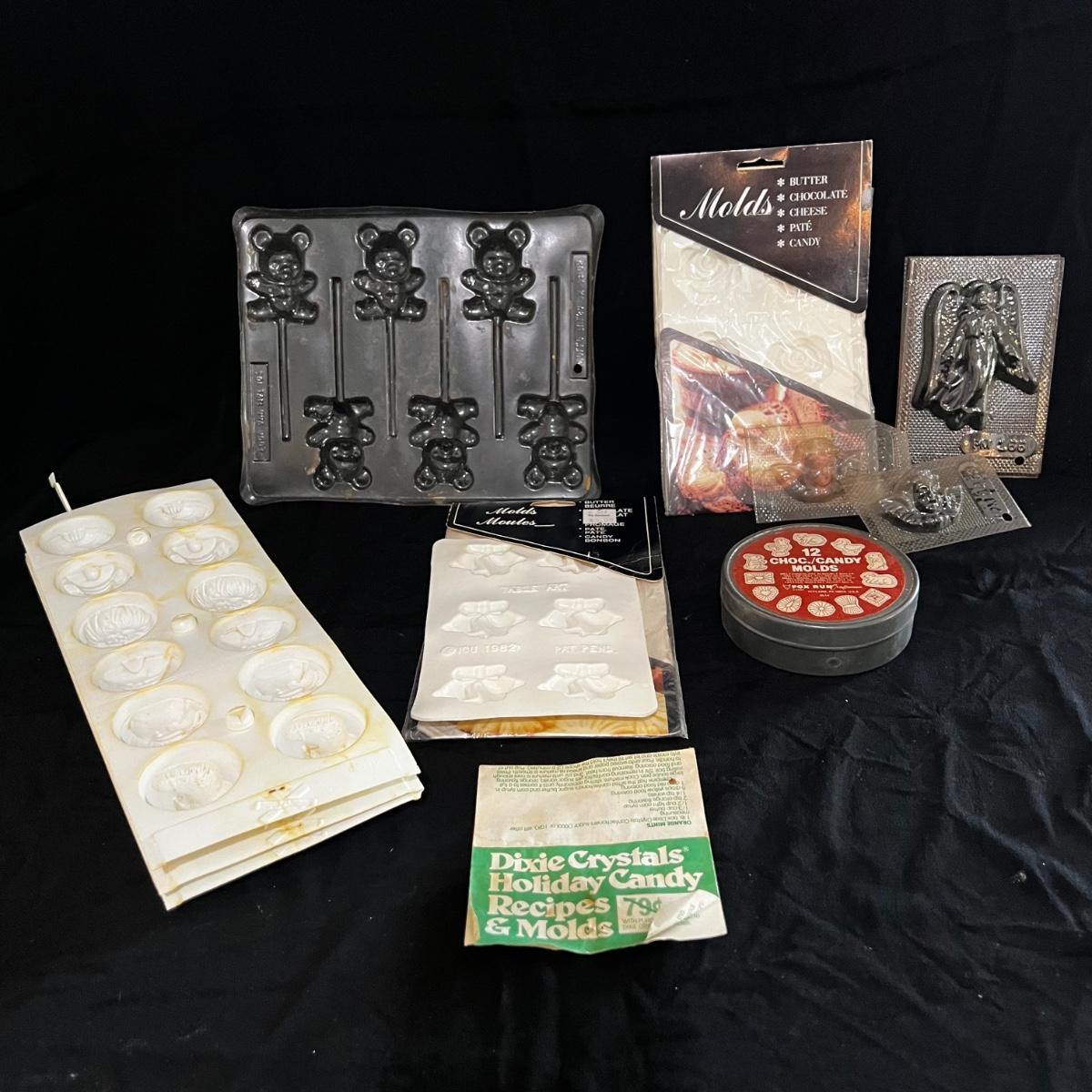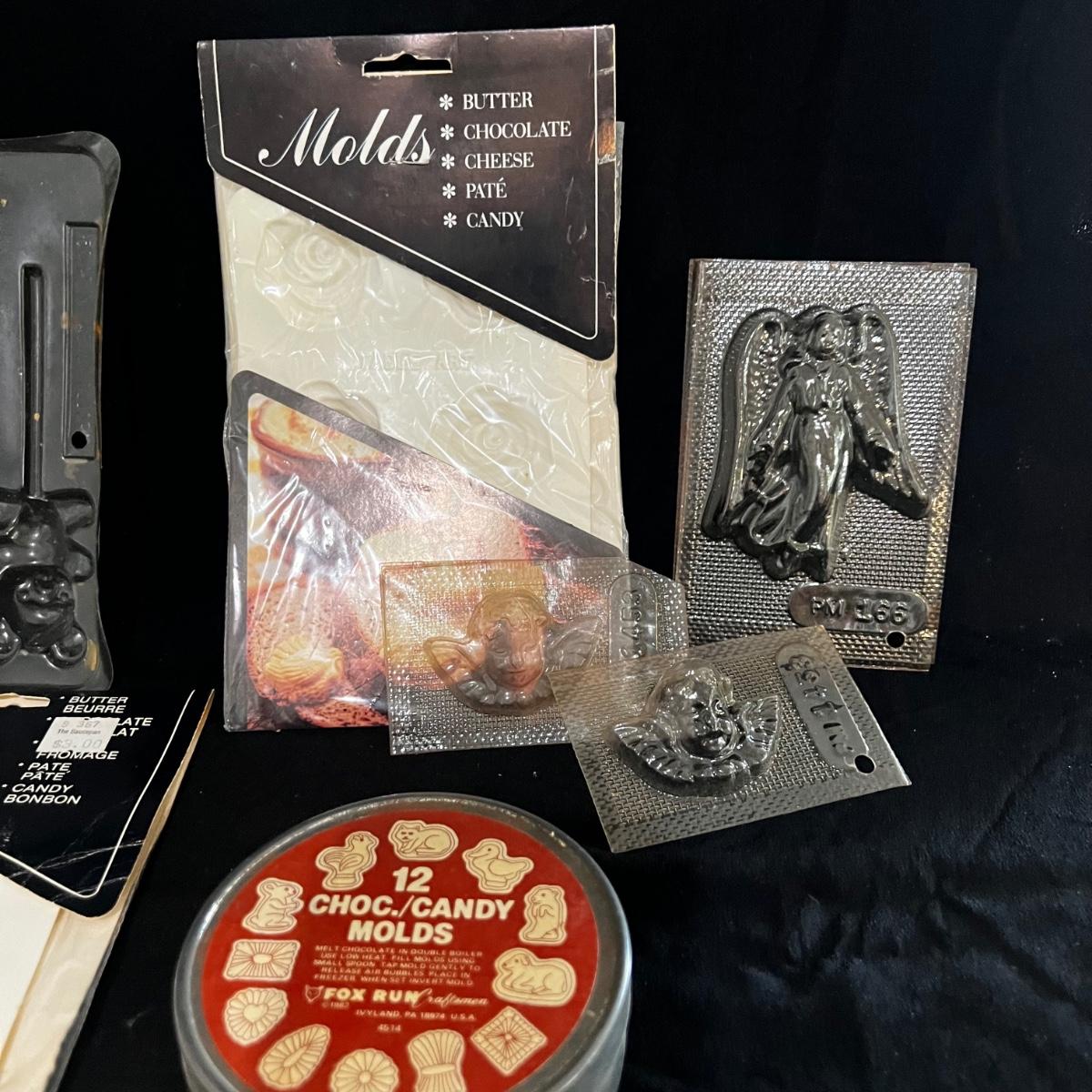 130+ vintage cookie cutters of all sizes, for all occasions and many, many shapes. Three piping cookie presses with 11 shapes and eight tips as well as a bag. Also included are 60+ tartlet tins. Butter molds and candy molds as shown.