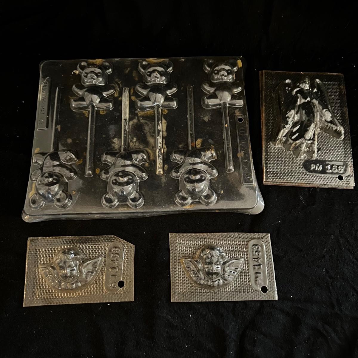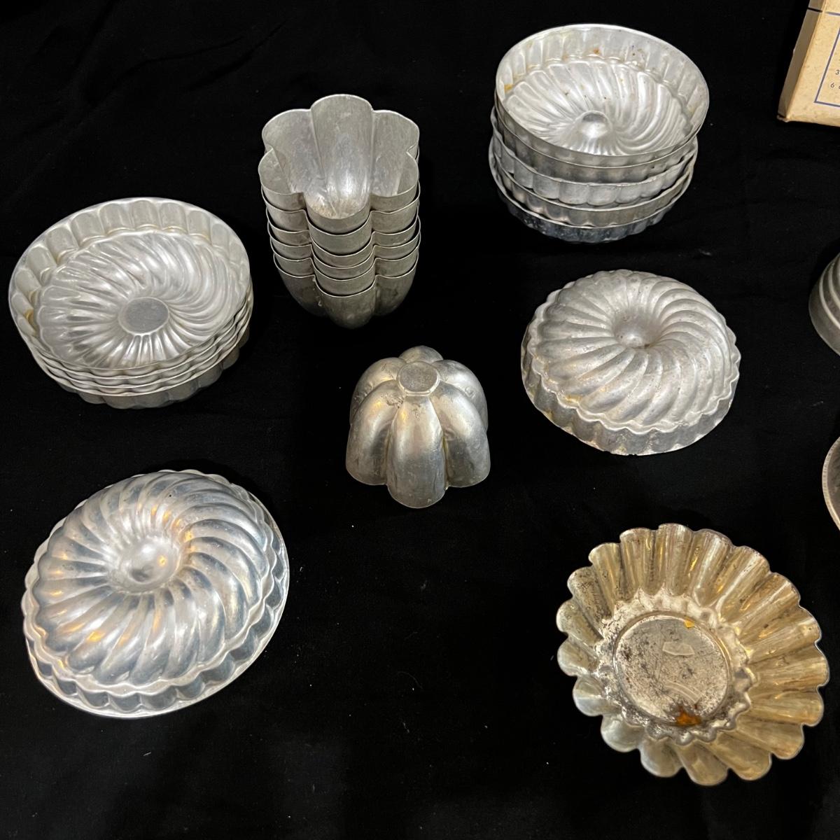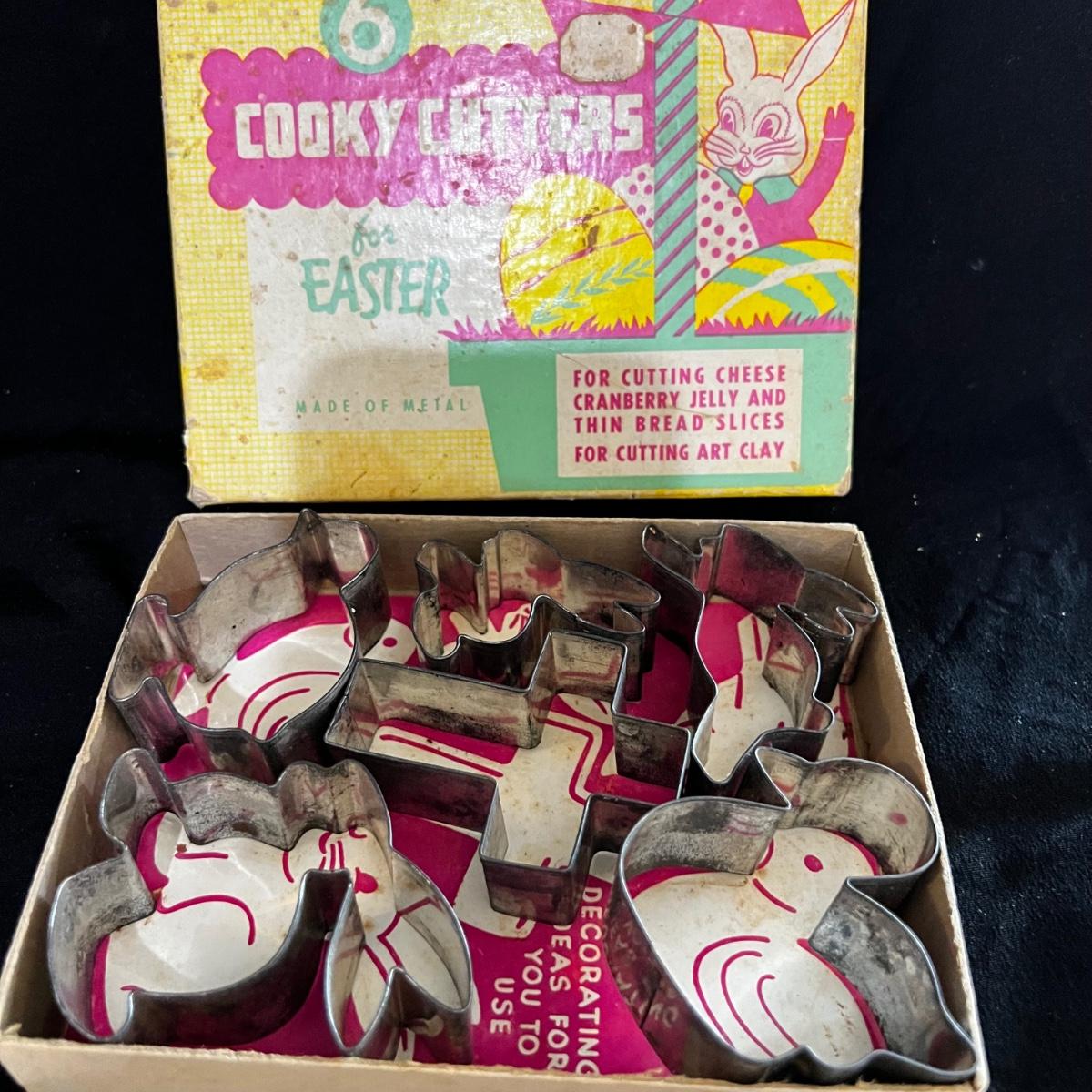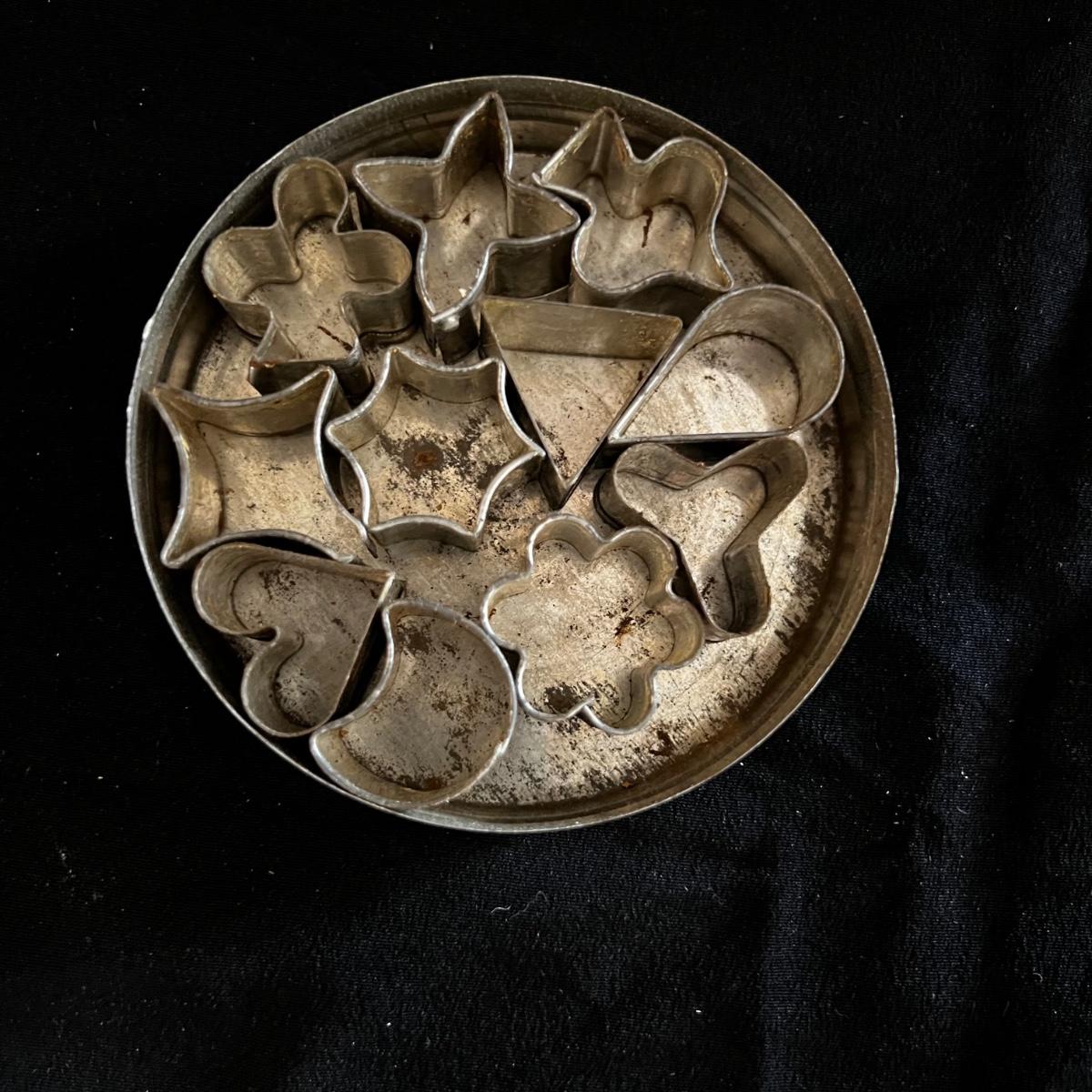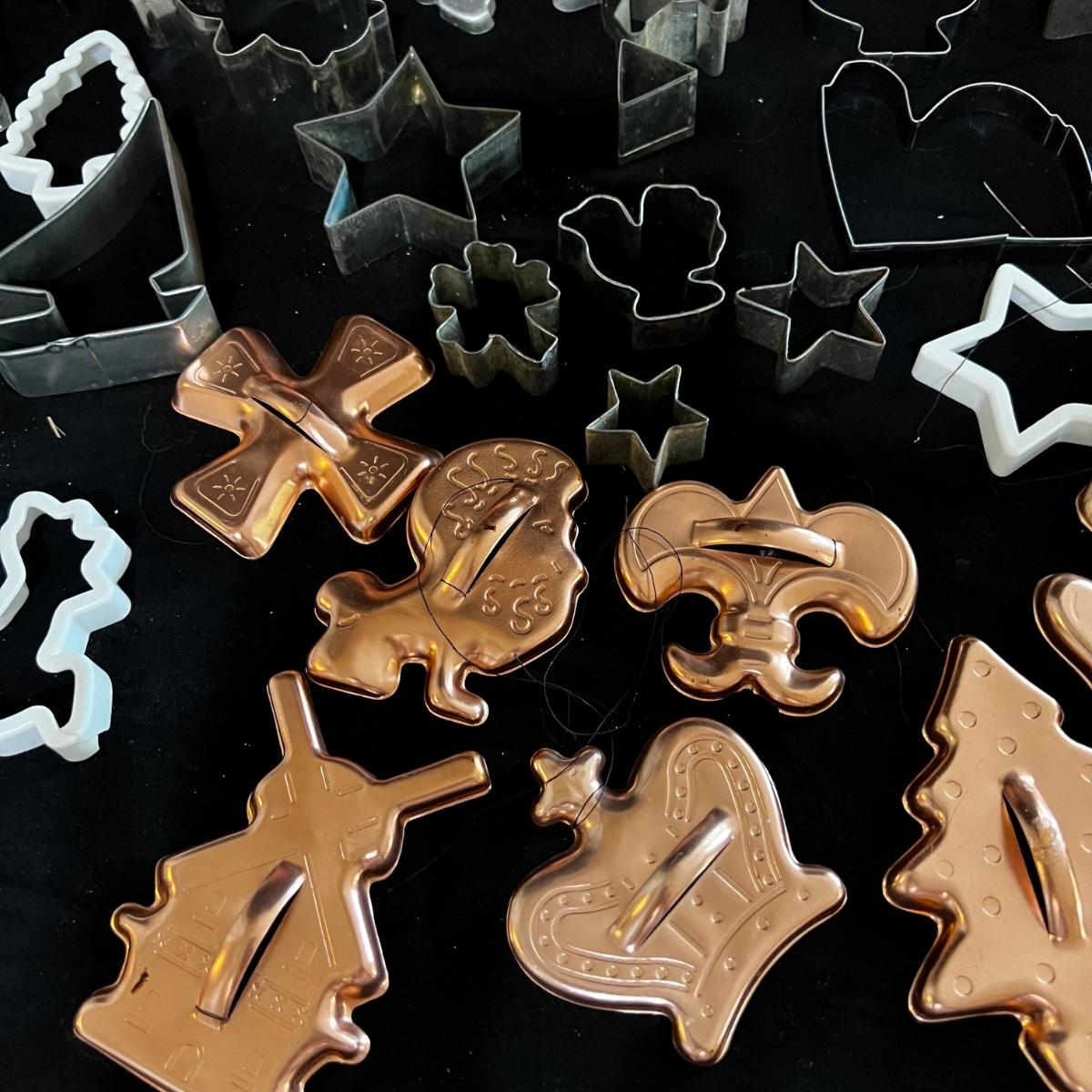 130+ vintage cookie cutters of all sizes, for all occasions and many, many shapes. Three piping cookie presses with 11 shapes and eight tips as well as a bag. Also included are 60+ tartlet tins. Butter molds and candy molds as shown.