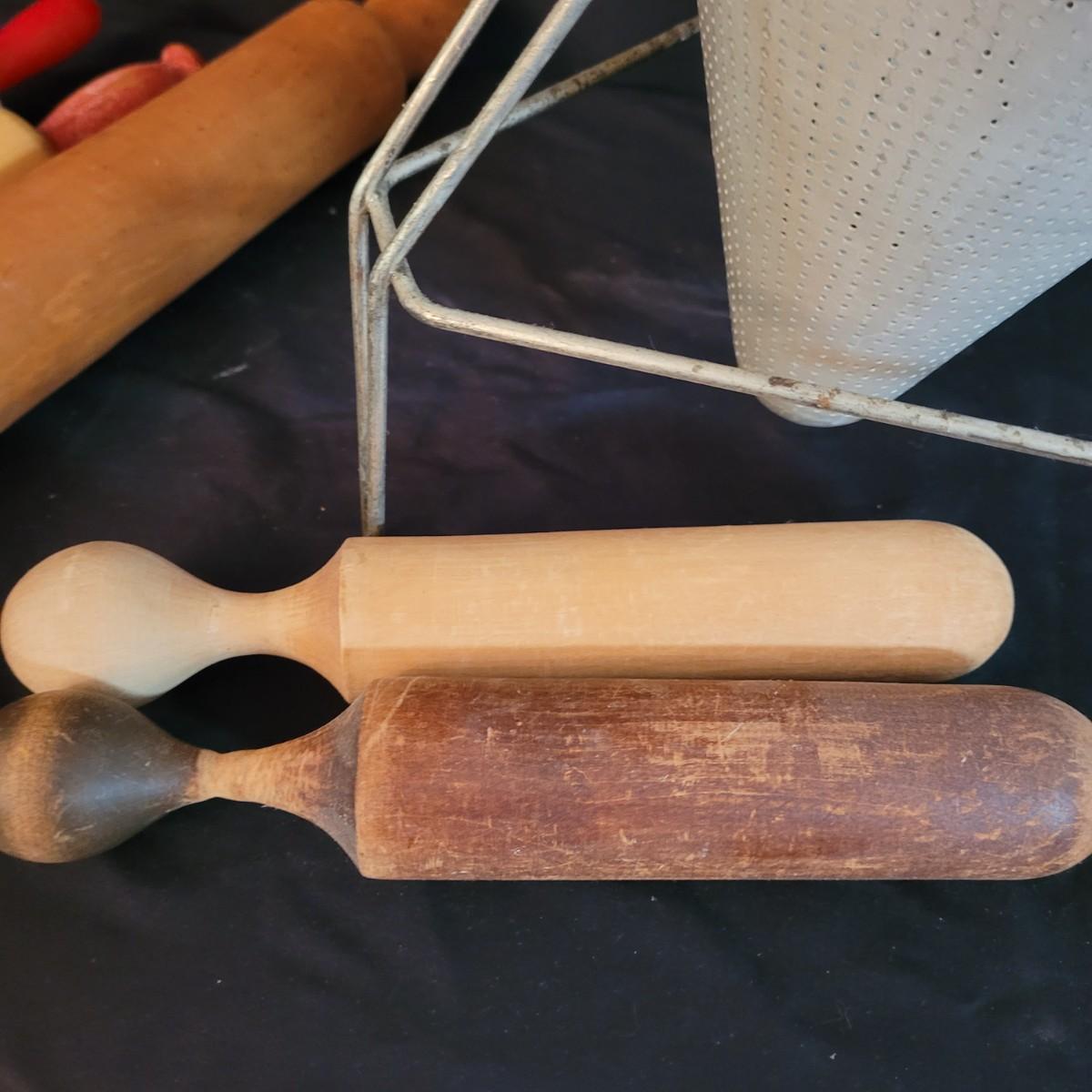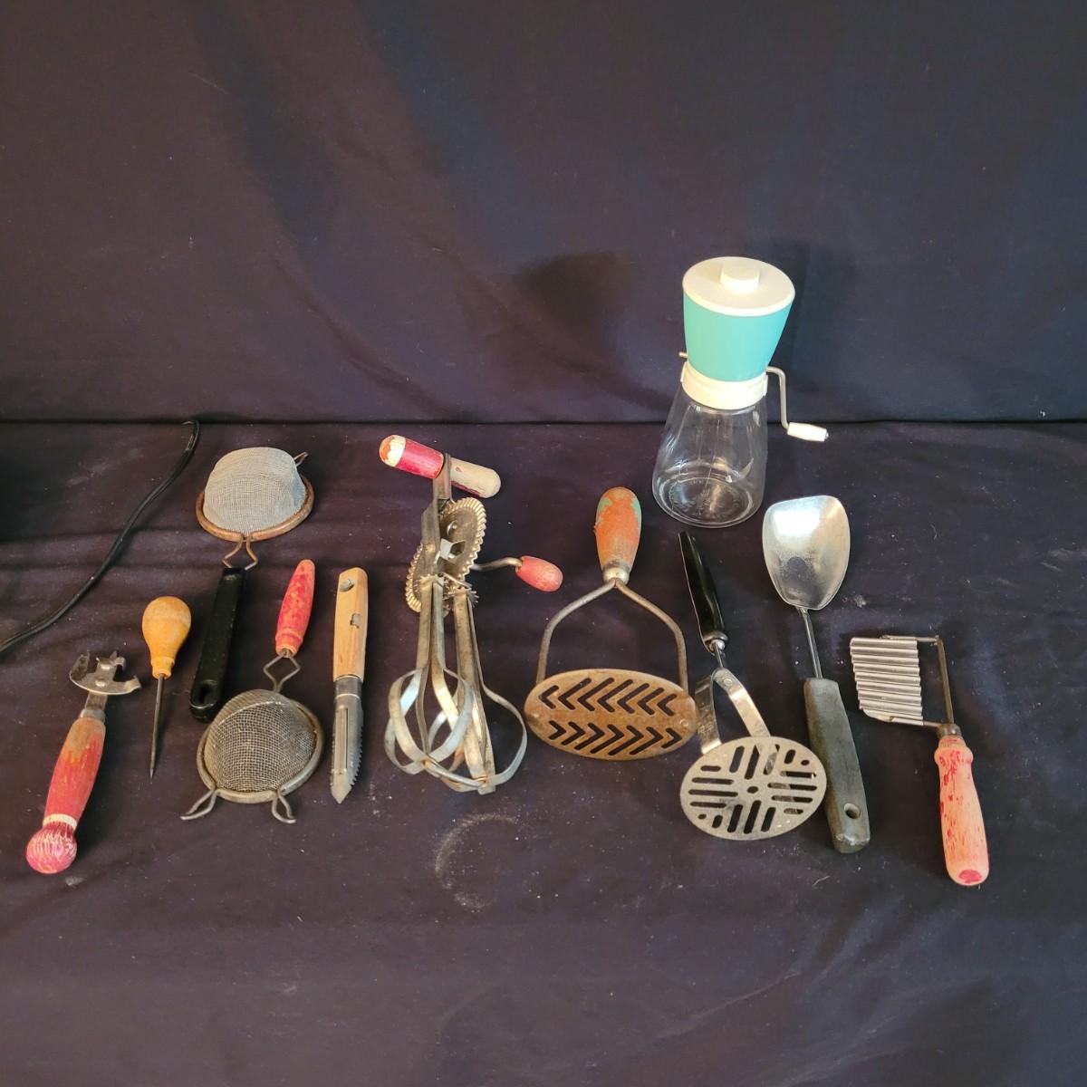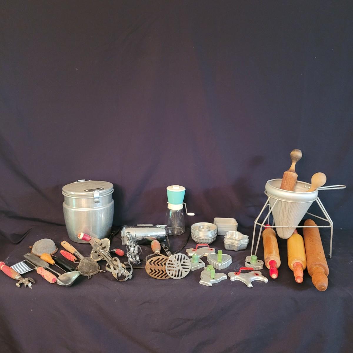 This large assortment of vintage kitchen supplies includes cookie cutters, electric mixer, handheld mixer, sieve, rolling pins, a canister and many small tools. Electric mixer powers on when plugged in. Shipping available.