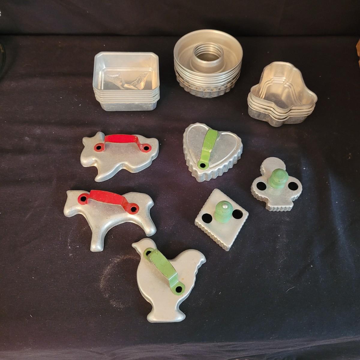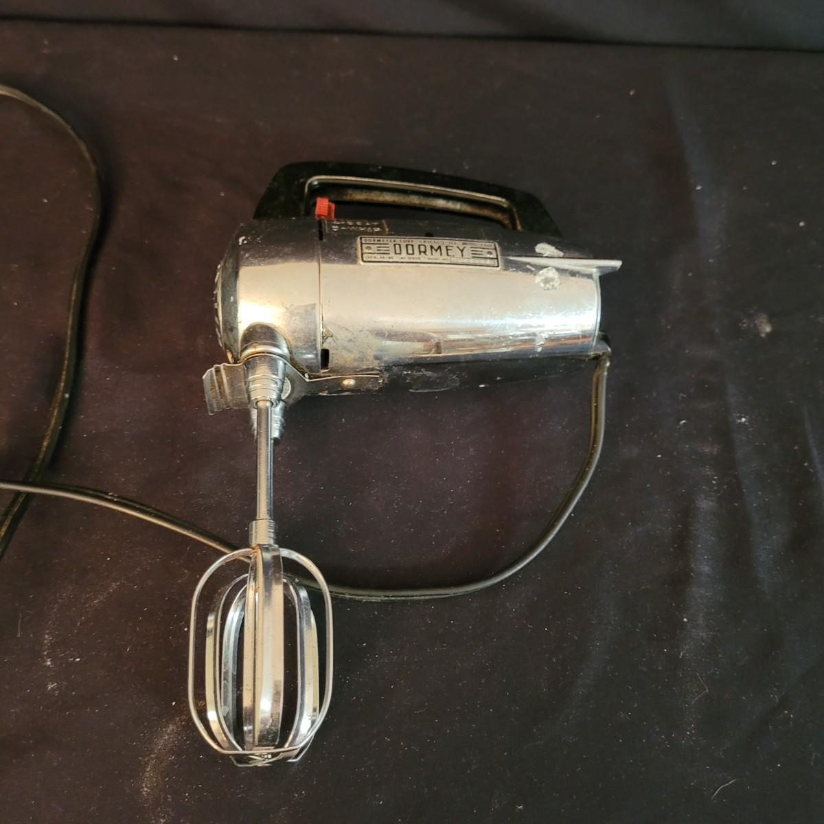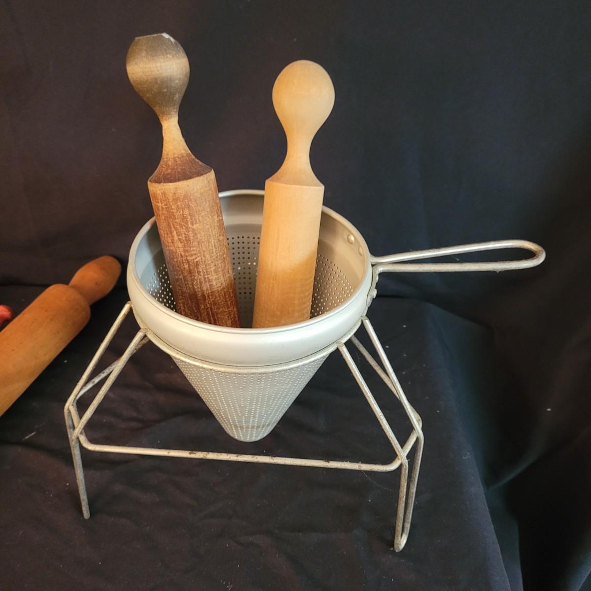 This large assortment of vintage kitchen supplies includes cookie cutters, electric mixer, handheld mixer, sieve, rolling pins, a canister and many small tools. Electric mixer powers on when plugged in. Shipping available.