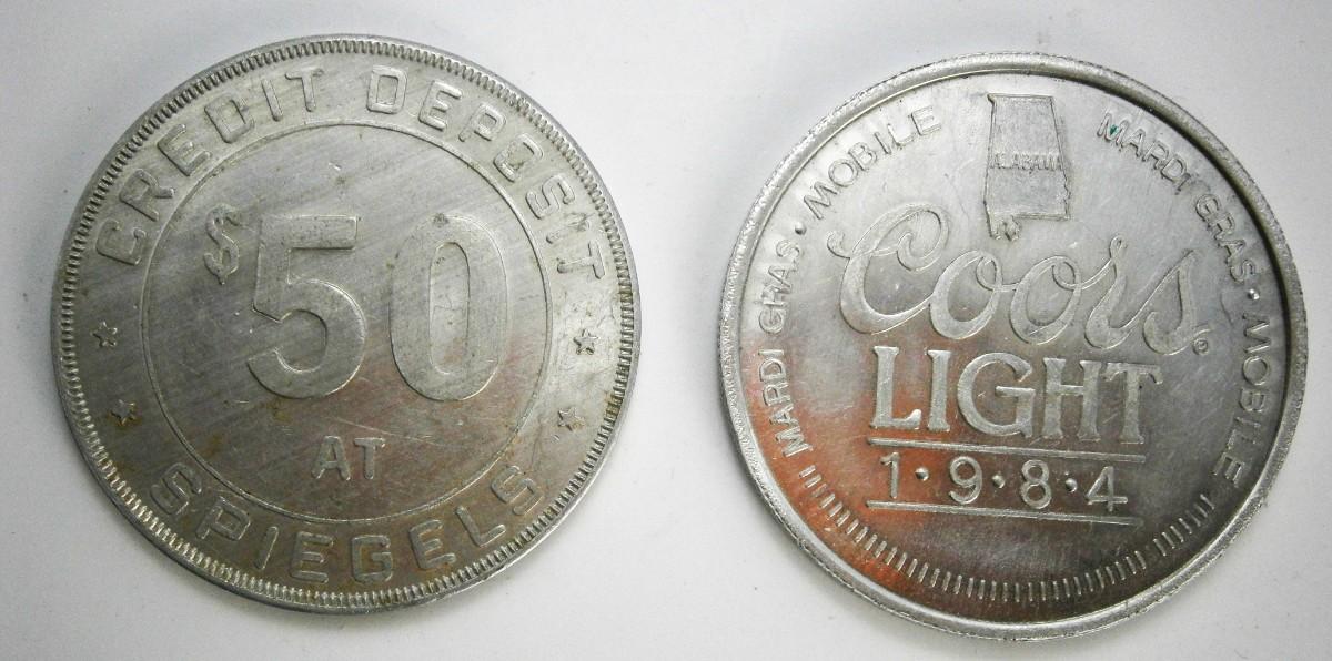 Vintage Coors Beer & Spiegels Advertising Tokens, 1 1/2 diameter, aluminum.