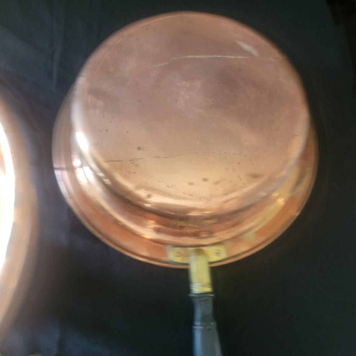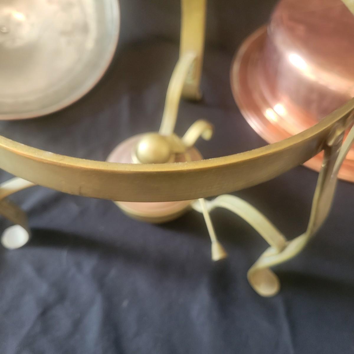 A beautiful vintage chafing dish with a brass stand, copper double boiler and pot. Main dish has a wooden handle and a beautiful patina. Boiler is bright copper with one small dent, but otherwise in great condition. Set has original alcohol burner also made of copper and brass. Measures approximately 10" x 11" and the pot has a 7" handle. Shipping Available.