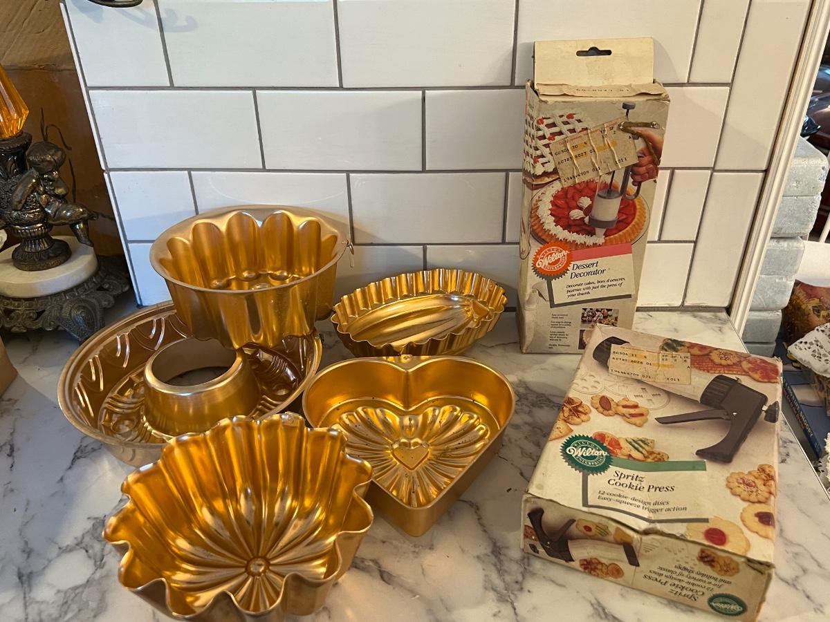 Vintage Copper Baking Pans, Decorating Kit, and Cookie Press