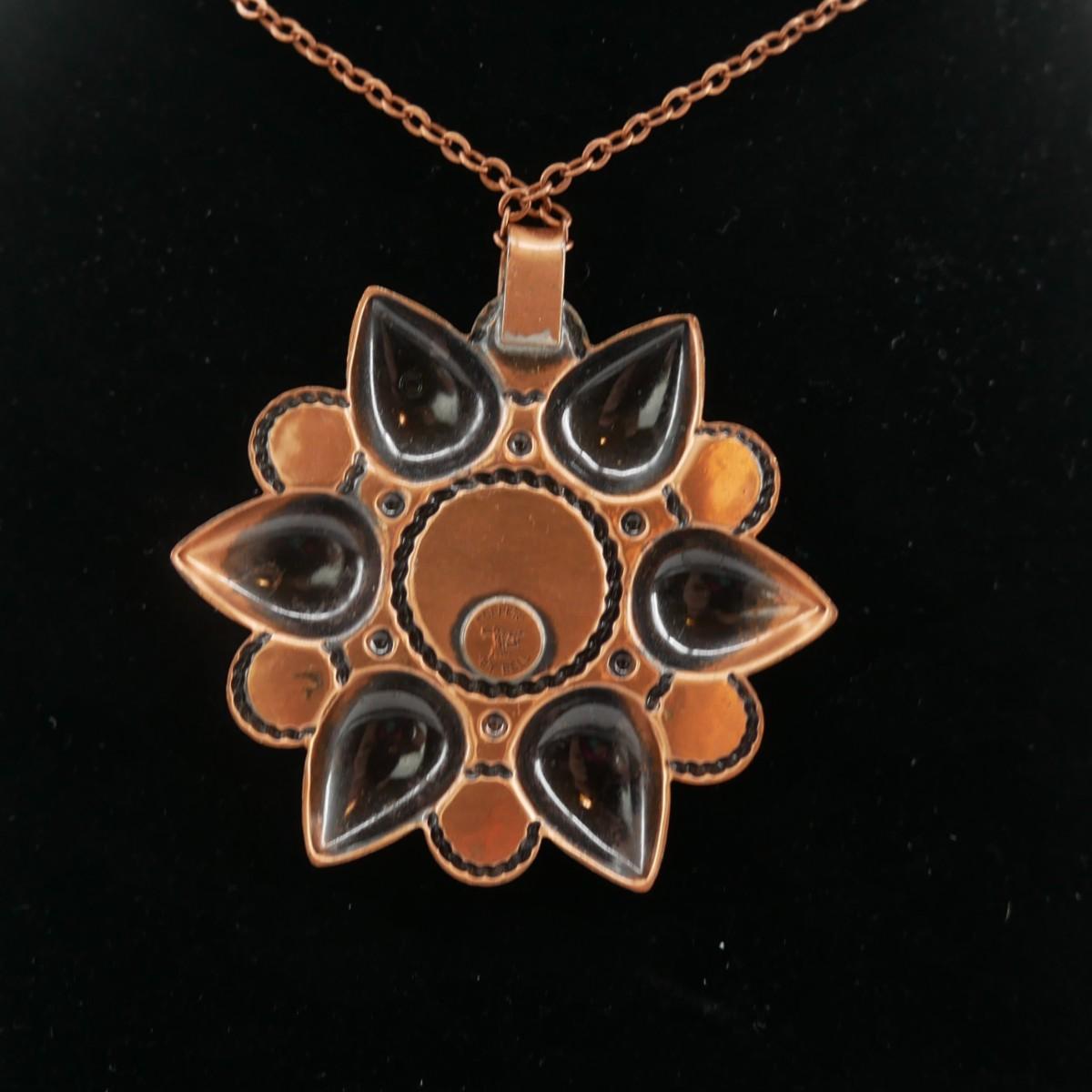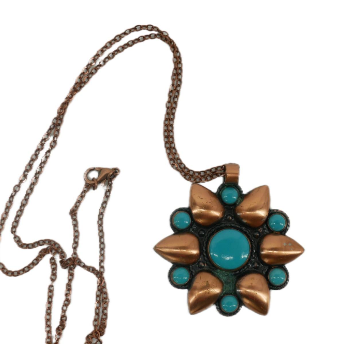 Vintage Copper by Bell copper and blue sun flower pendant necklace. Pendant is copper and necklace is replacement copper toned chain measuring approximately 24". Pendant measures approximately 2" x 2", total weight is 18g.