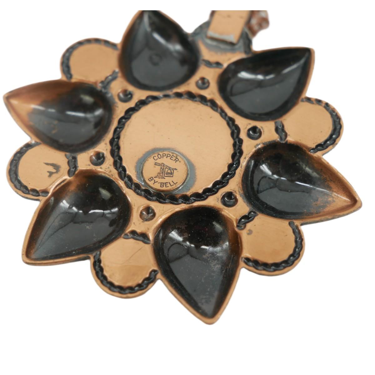 Vintage Copper by Bell copper and blue sun flower pendant necklace. Pendant is copper and necklace is replacement copper toned chain measuring approximately 24". Pendant measures approximately 2" x 2", total weight is 18g.