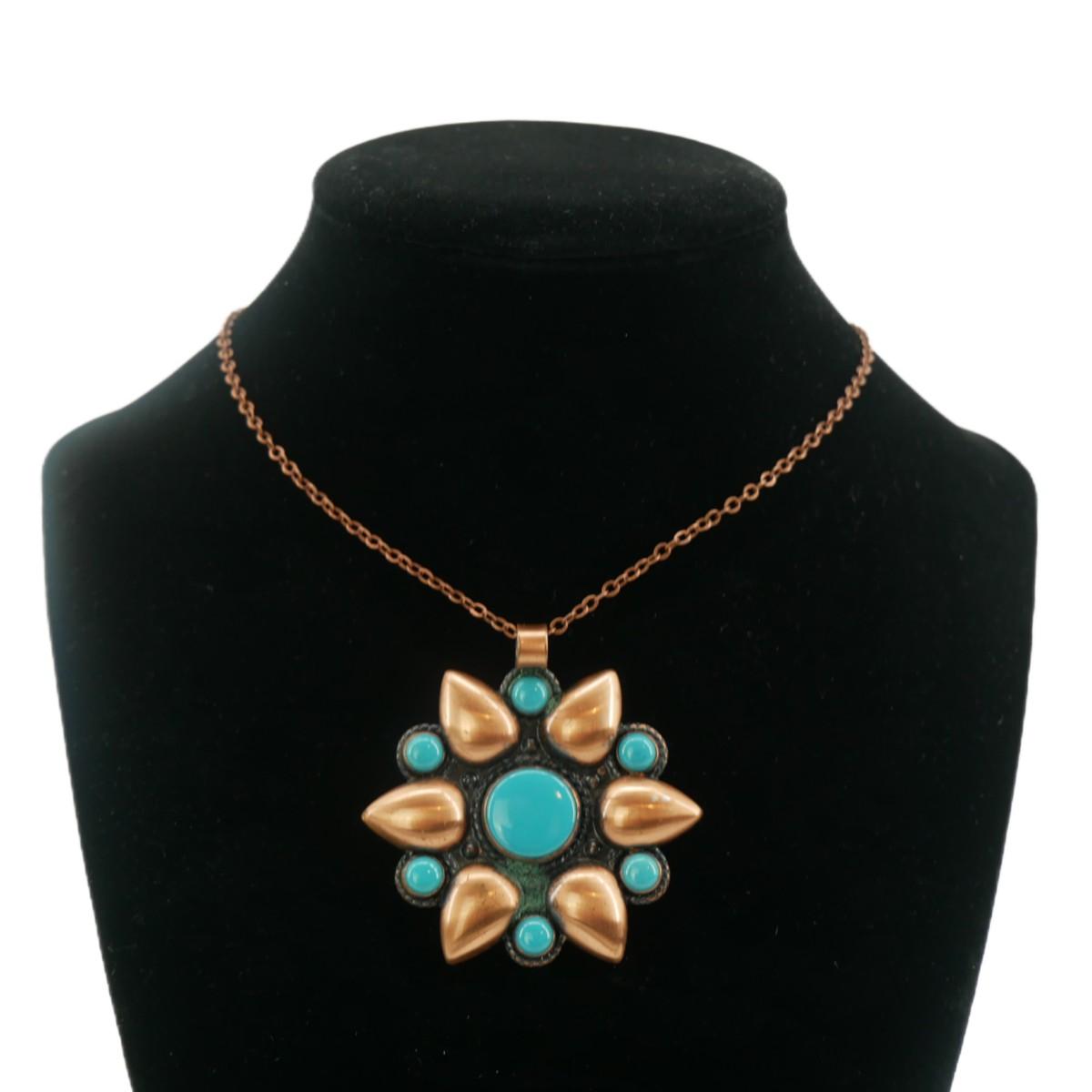 Vintage Copper by Bell copper and blue sun flower pendant necklace. Pendant is copper and necklace is replacement copper toned chain measuring approximately 24". Pendant measures approximately 2" x 2", total weight is 18g.