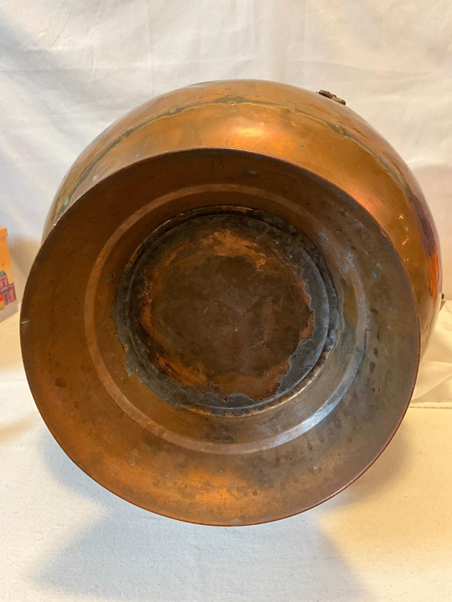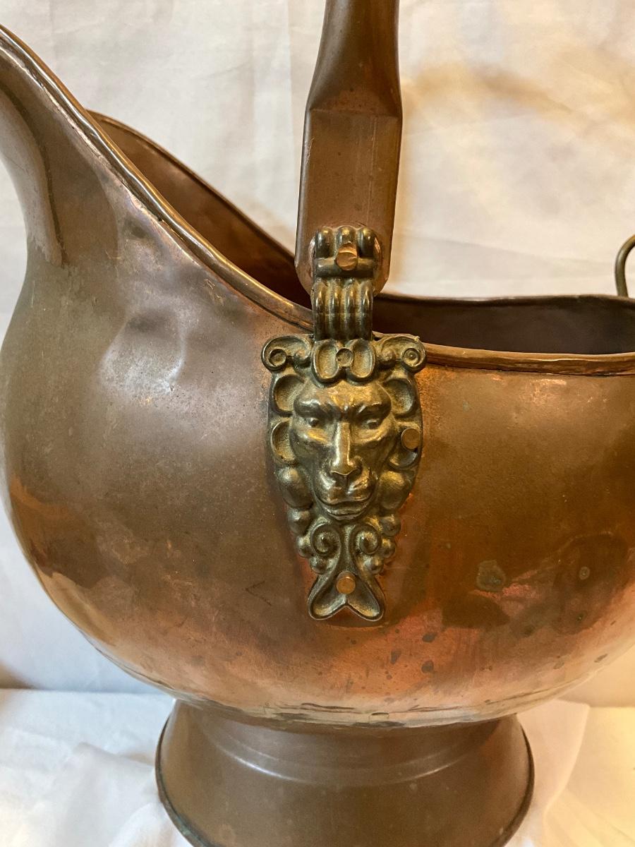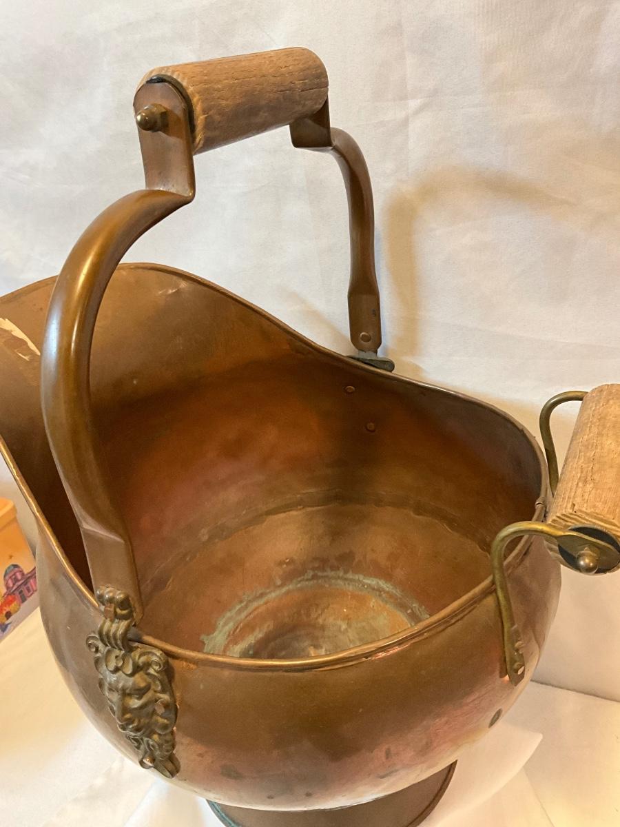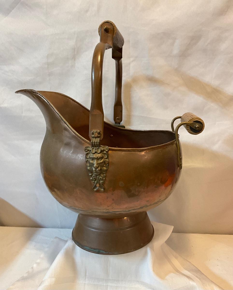 Vintage Copper coal scuttles adorned with Lion Head/wood handles