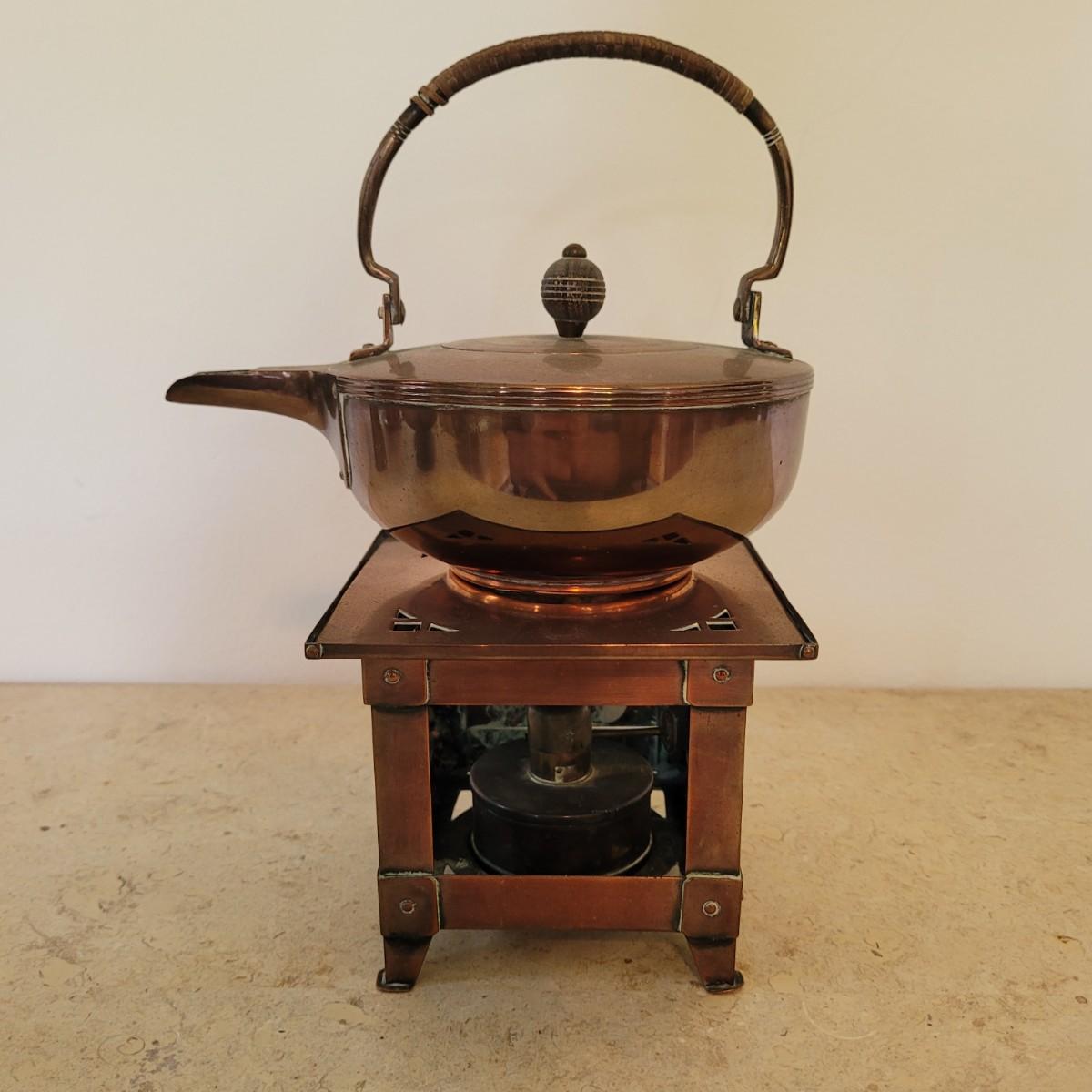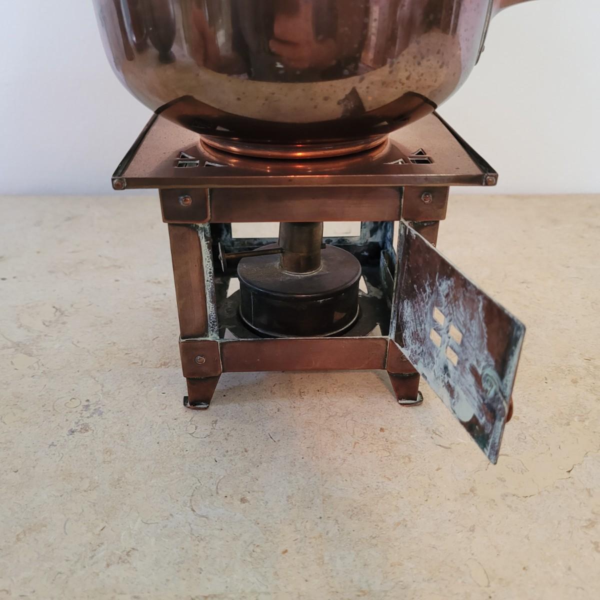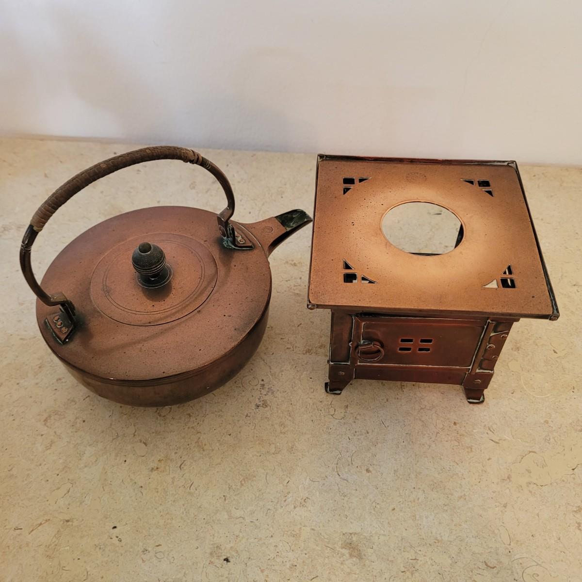 This lot includes four individual pieces of copper cookware and two brass. The first item is a copper tea kettle on a floor stand designed for heating and holding hot drinks. The second item is a cezve or ibrik for making Turkish coffee. The third item is a brass bowl with peacock handles. The last items are three copper clad camping pots and pans with wooden handles.