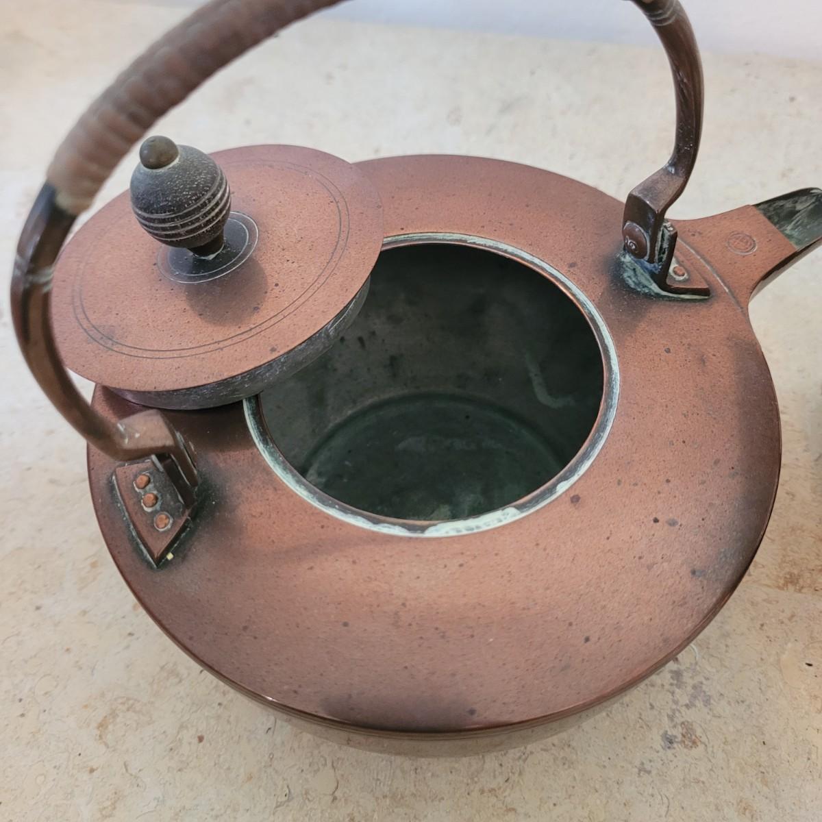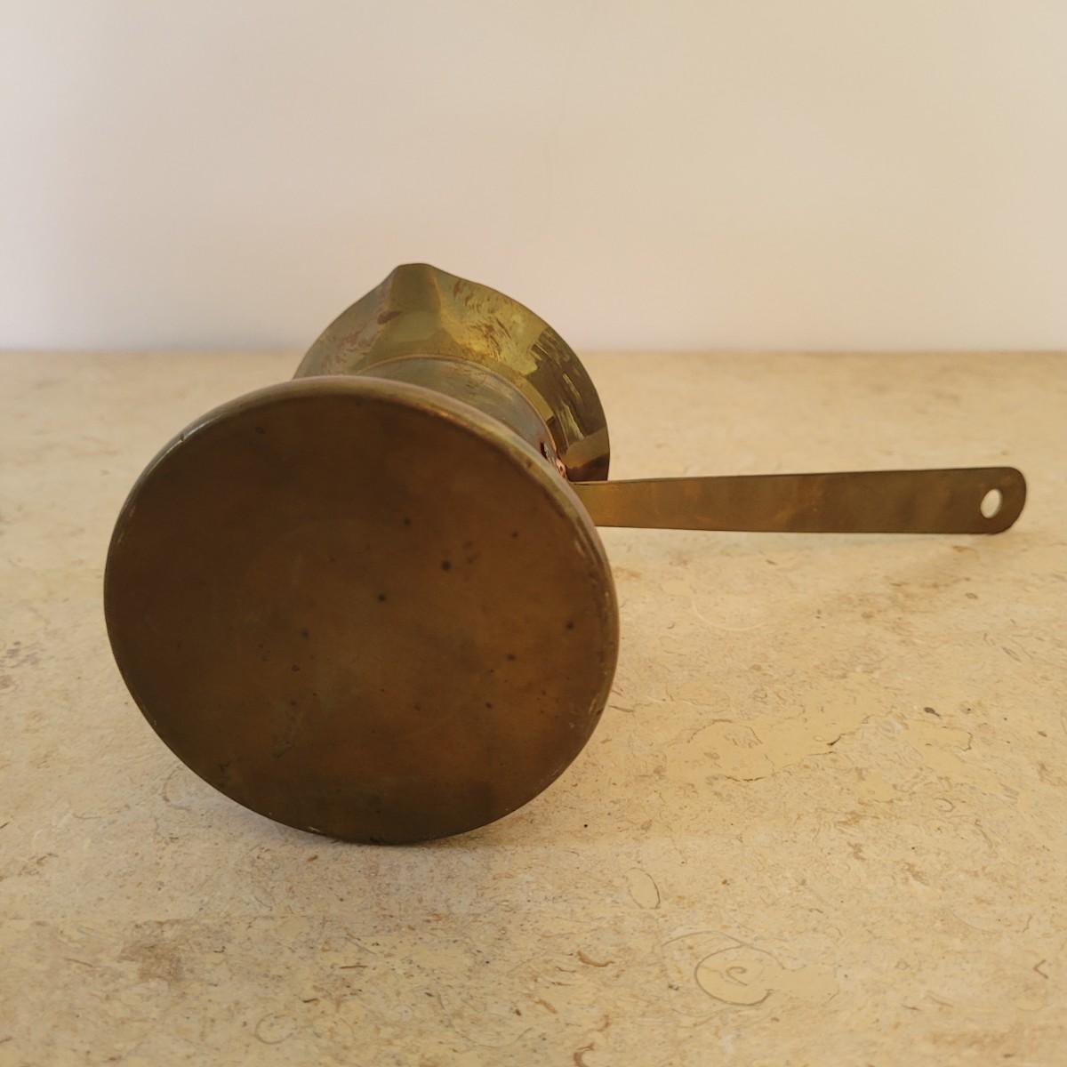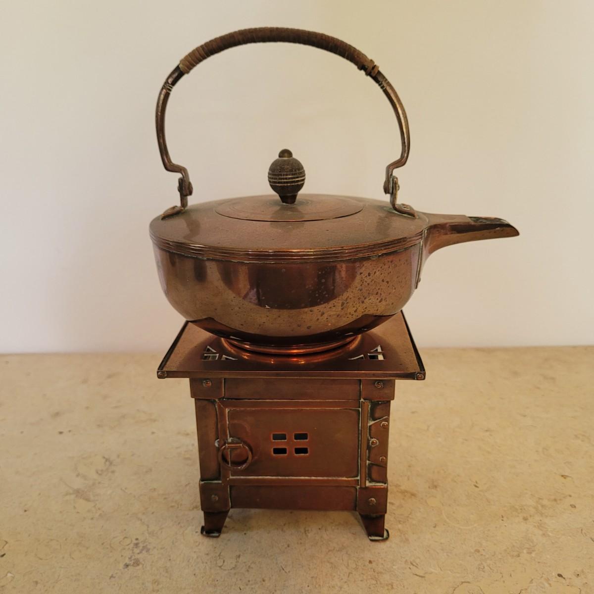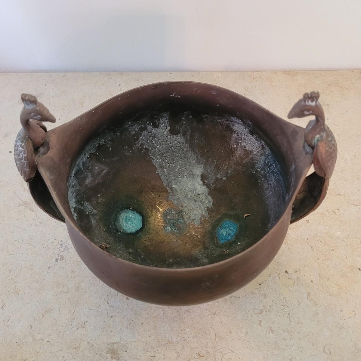 This lot includes four individual pieces of copper cookware and two brass. The first item is a copper tea kettle on a floor stand designed for heating and holding hot drinks. The second item is a cezve or ibrik for making Turkish coffee. The third item is a brass bowl with peacock handles. The last items are three copper clad camping pots and pans with wooden handles.