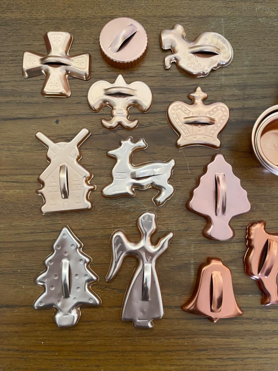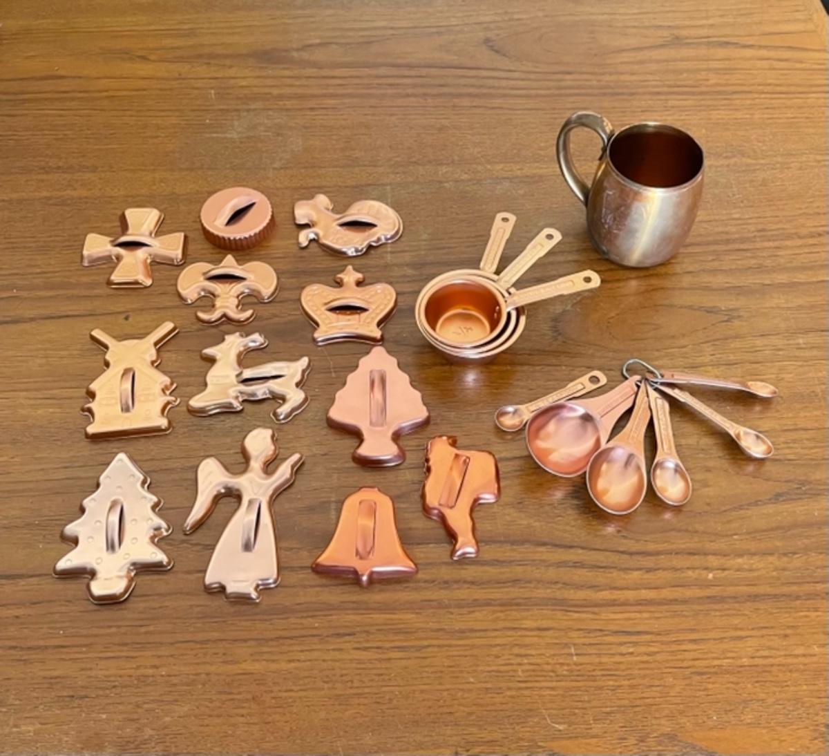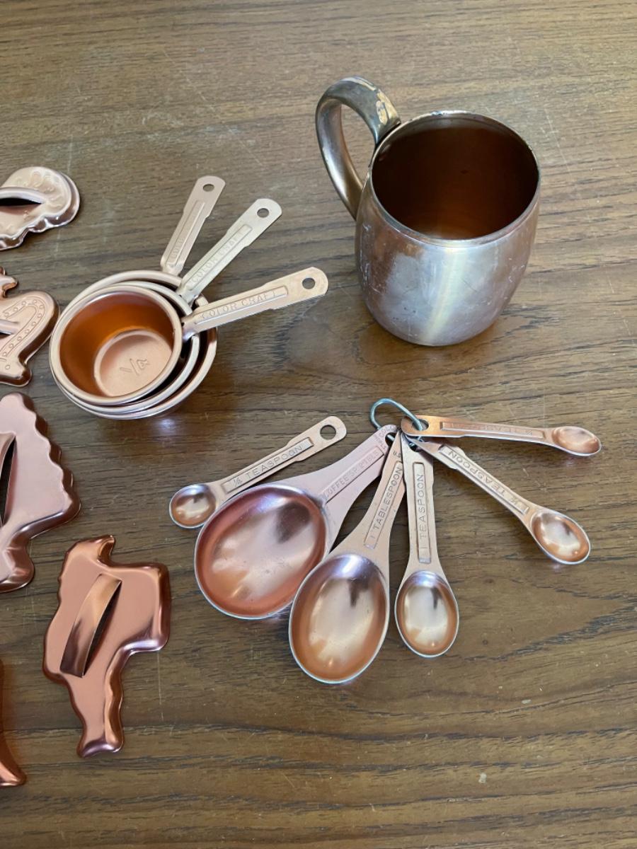 22 pieces, includes Westbend solid copper mug (typical wear and discoloration for age), 3 pc Color Craft measuring cups (unused), 4 pc US STD measuring spoons, plus extra 1/4 tsp (unused), Color Craft 2 TBSP coffee spoon, 12 cookie cutters (unused). Shipping available.