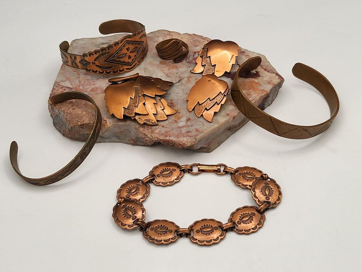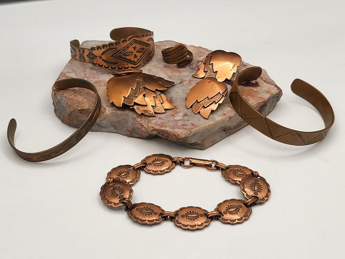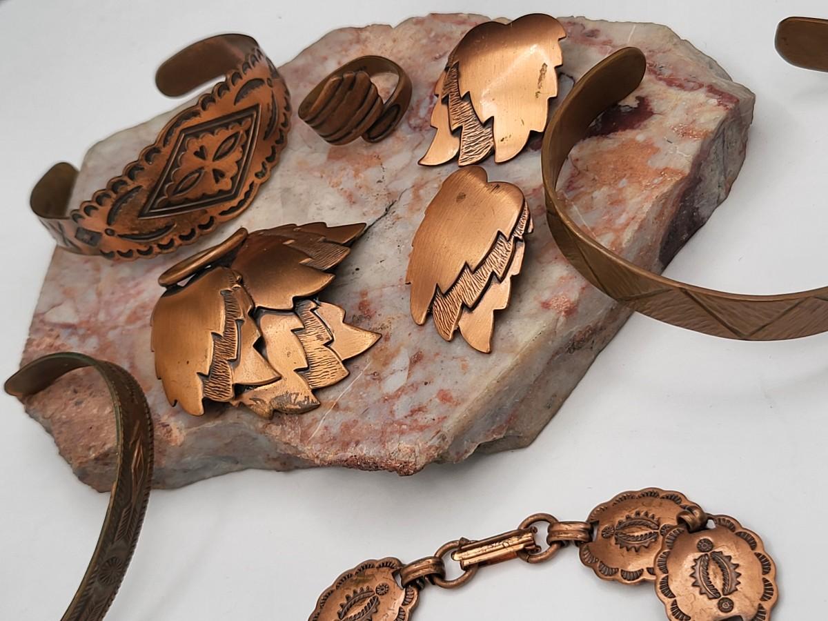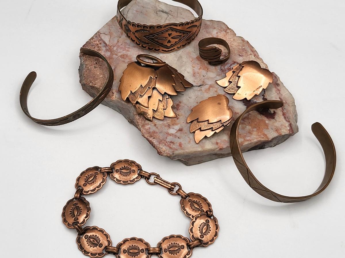 Three etched cuffs, 7.5" long etched link bracelet with fold over clasp, bypass ring, matching leaf pin and clip earrings. Solid copper.