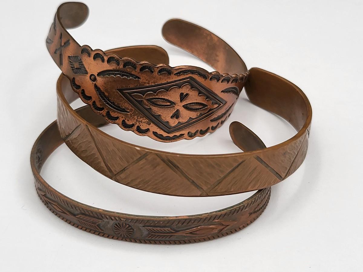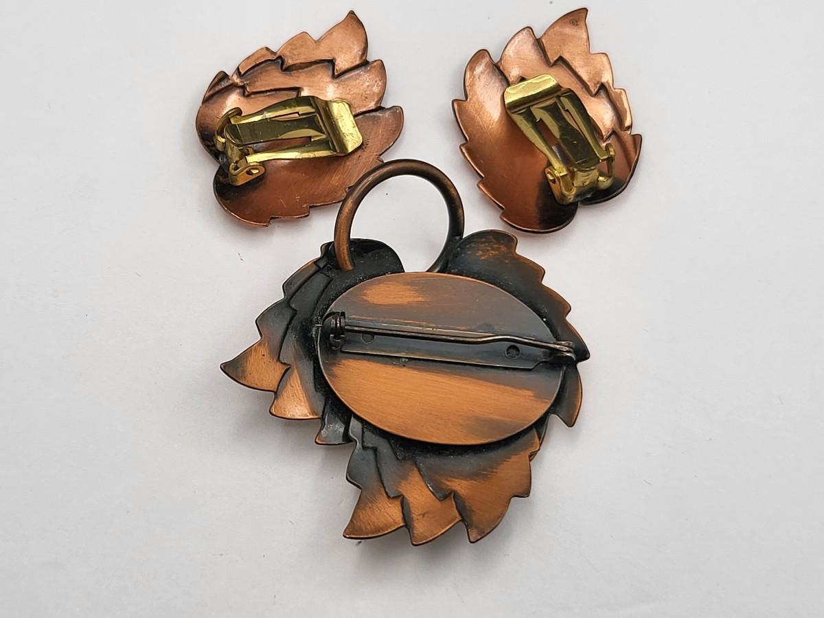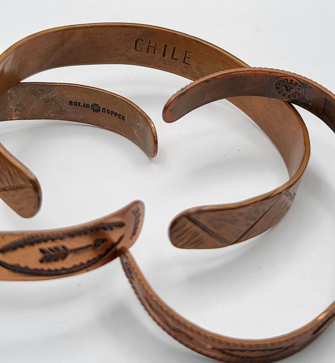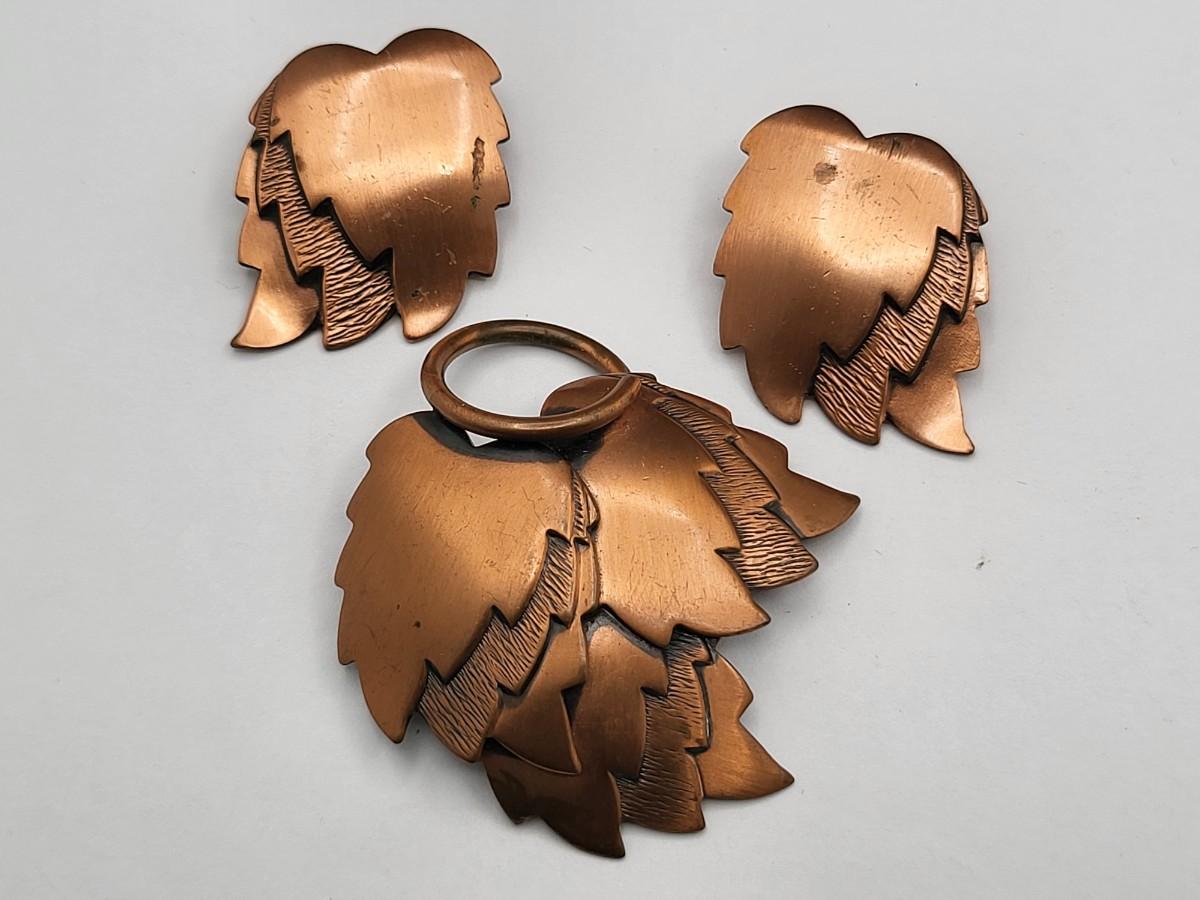 Three etched cuffs, 7.5" long etched link bracelet with fold over clasp, bypass ring, matching leaf pin and clip earrings. Solid copper.