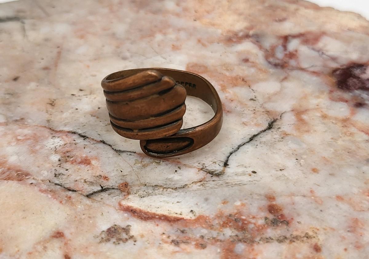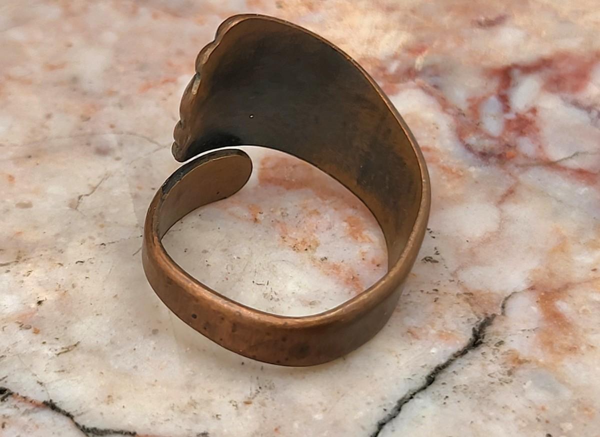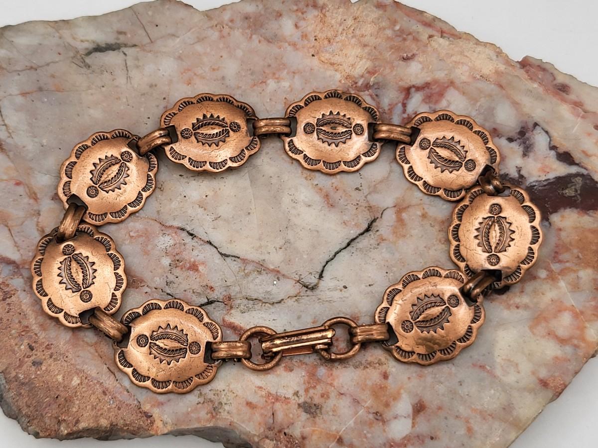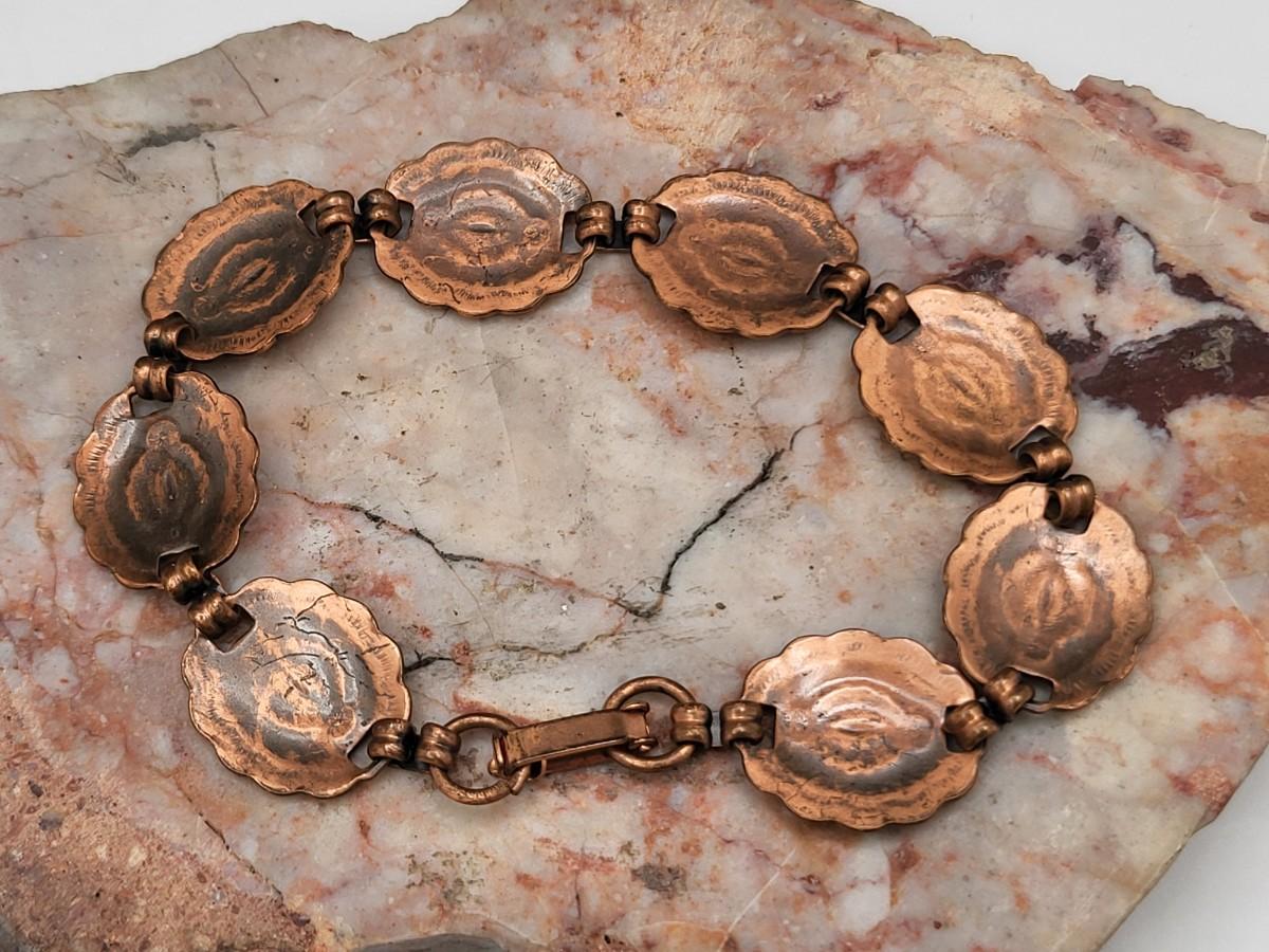 Three etched cuffs, 7.5" long etched link bracelet with fold over clasp, bypass ring, matching leaf pin and clip earrings. Solid copper.