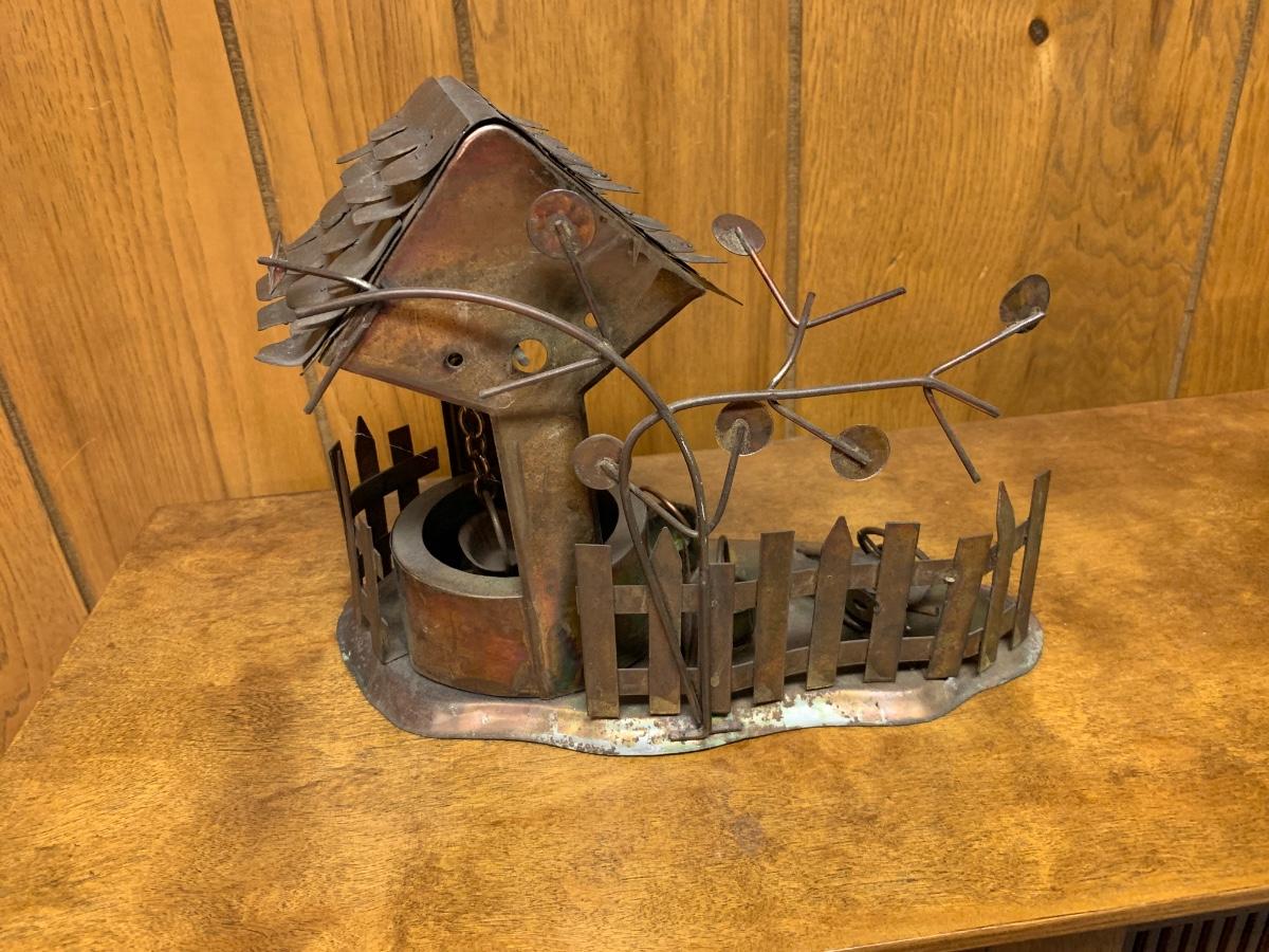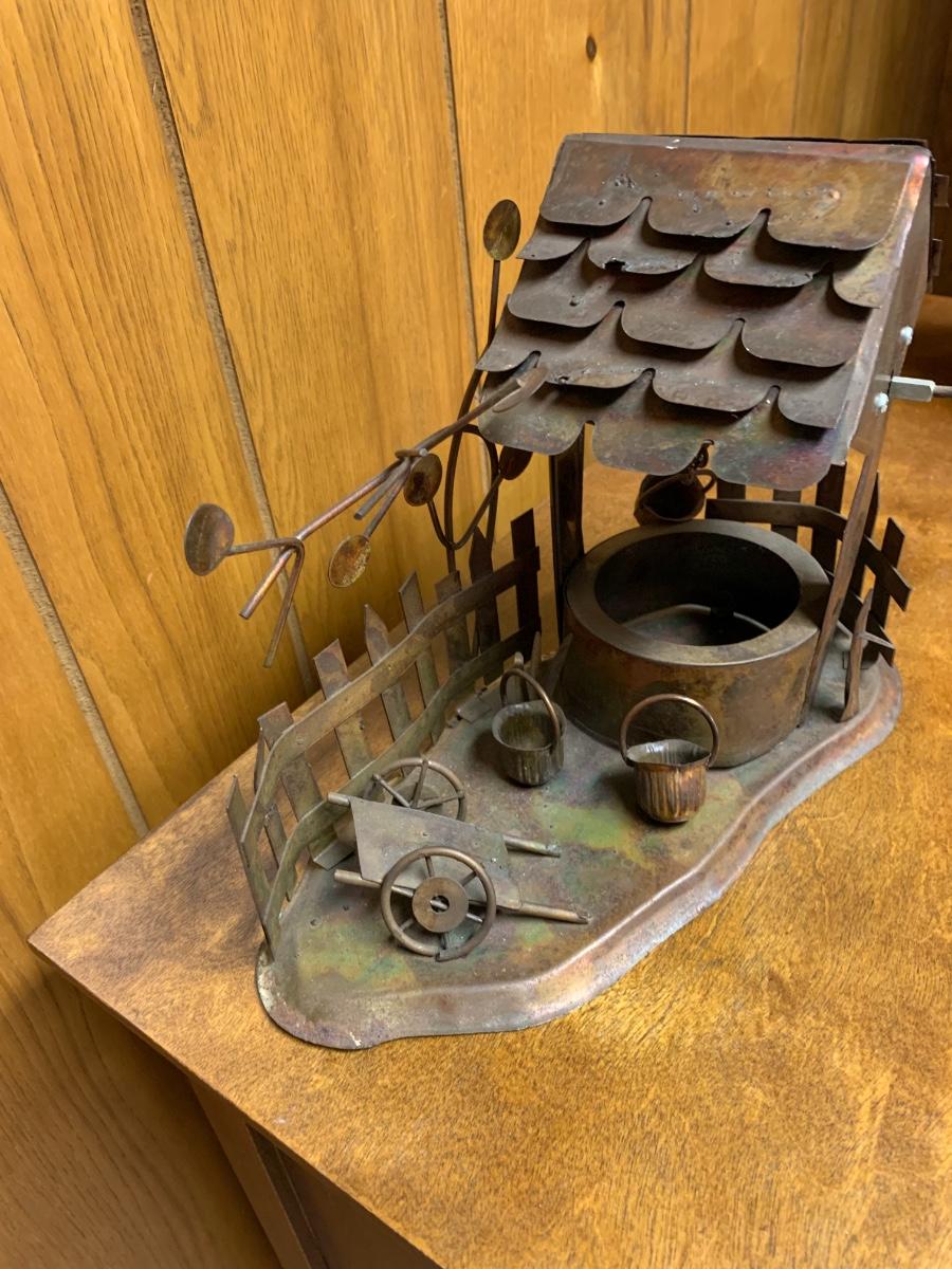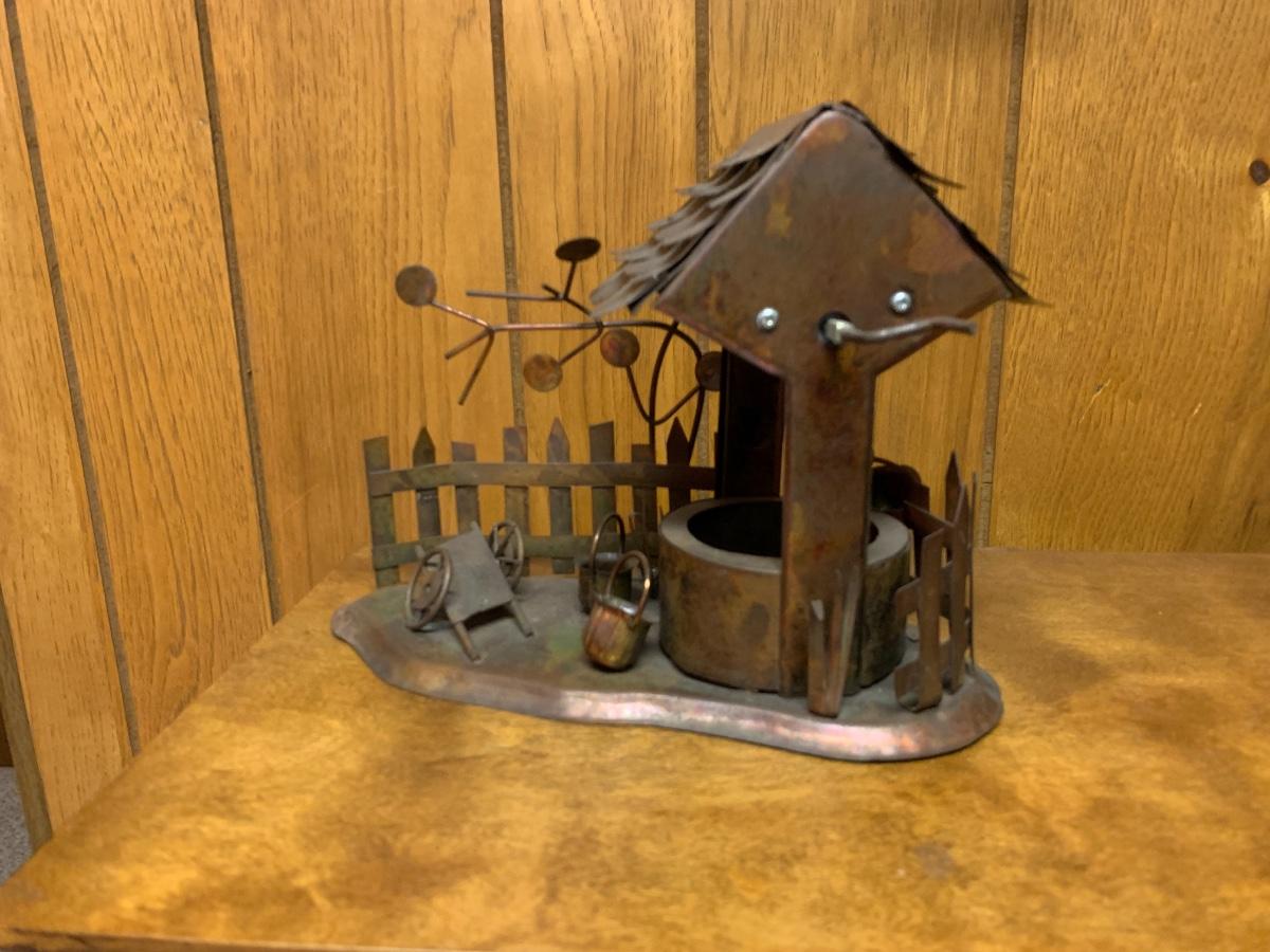Awesome mid century metal table sculpture, a little tableau of a wishing well with a hanging bucket on a chain, a very stylish tree, and a fence in the back with an assortment of buckets and a small wagon strewn about