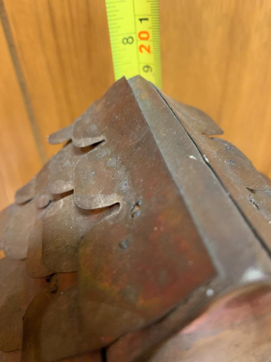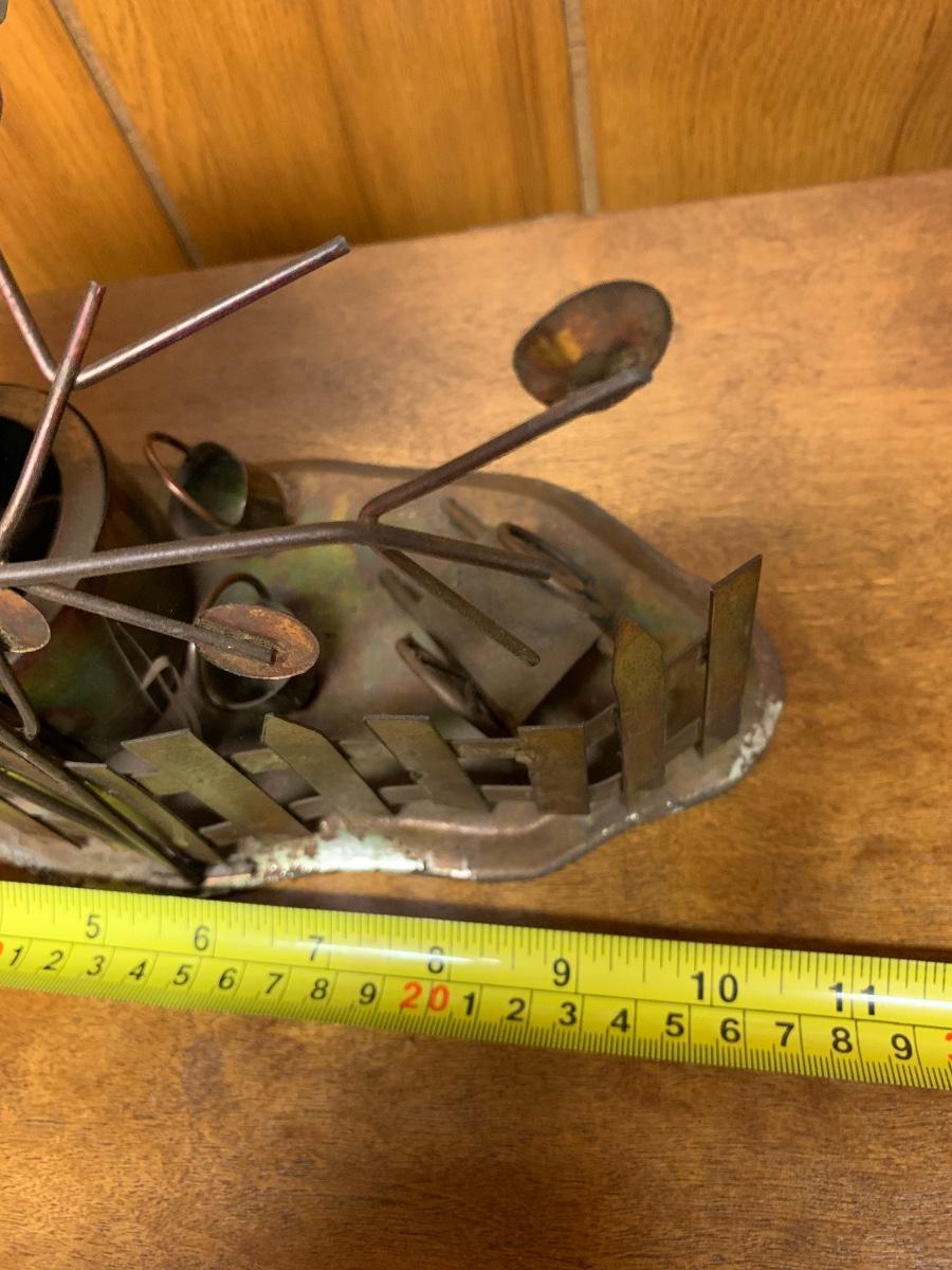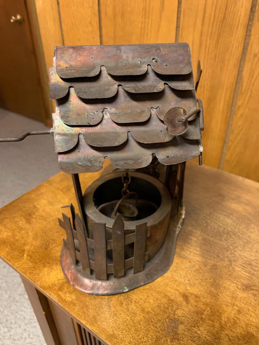 Awesome mid century metal table sculpture, a little tableau of a wishing well with a hanging bucket on a chain, a very stylish tree, and a fence in the back with an assortment of buckets and a small wagon strewn about