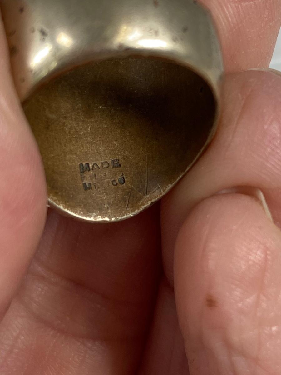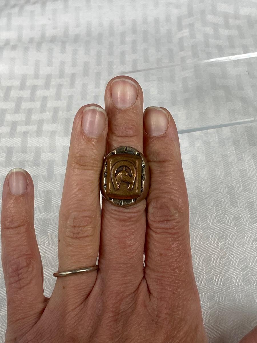 Vintage Copper & Silver Horse Head Shoe Ring. Has signs of age, wear. Made in Mexico. No sterling marks. Large ring face but small size, fits like a 7.