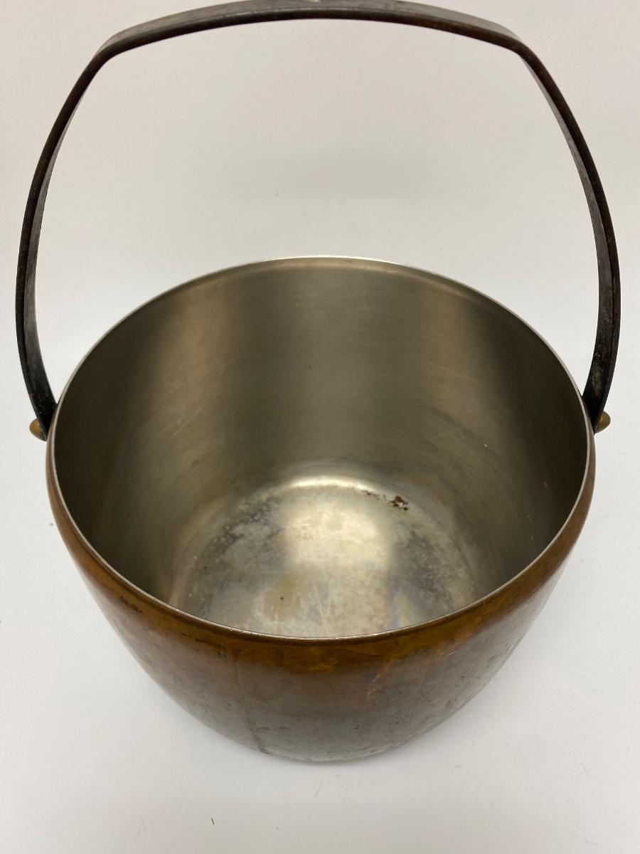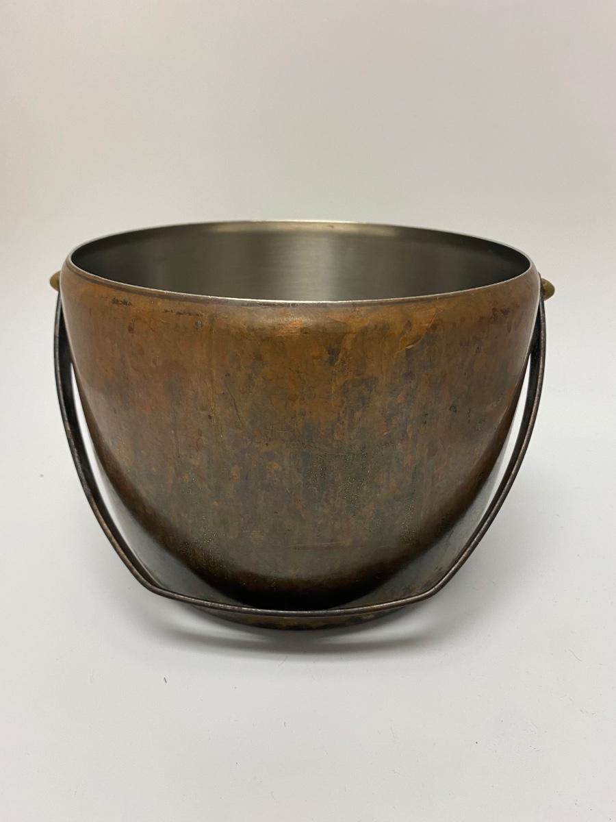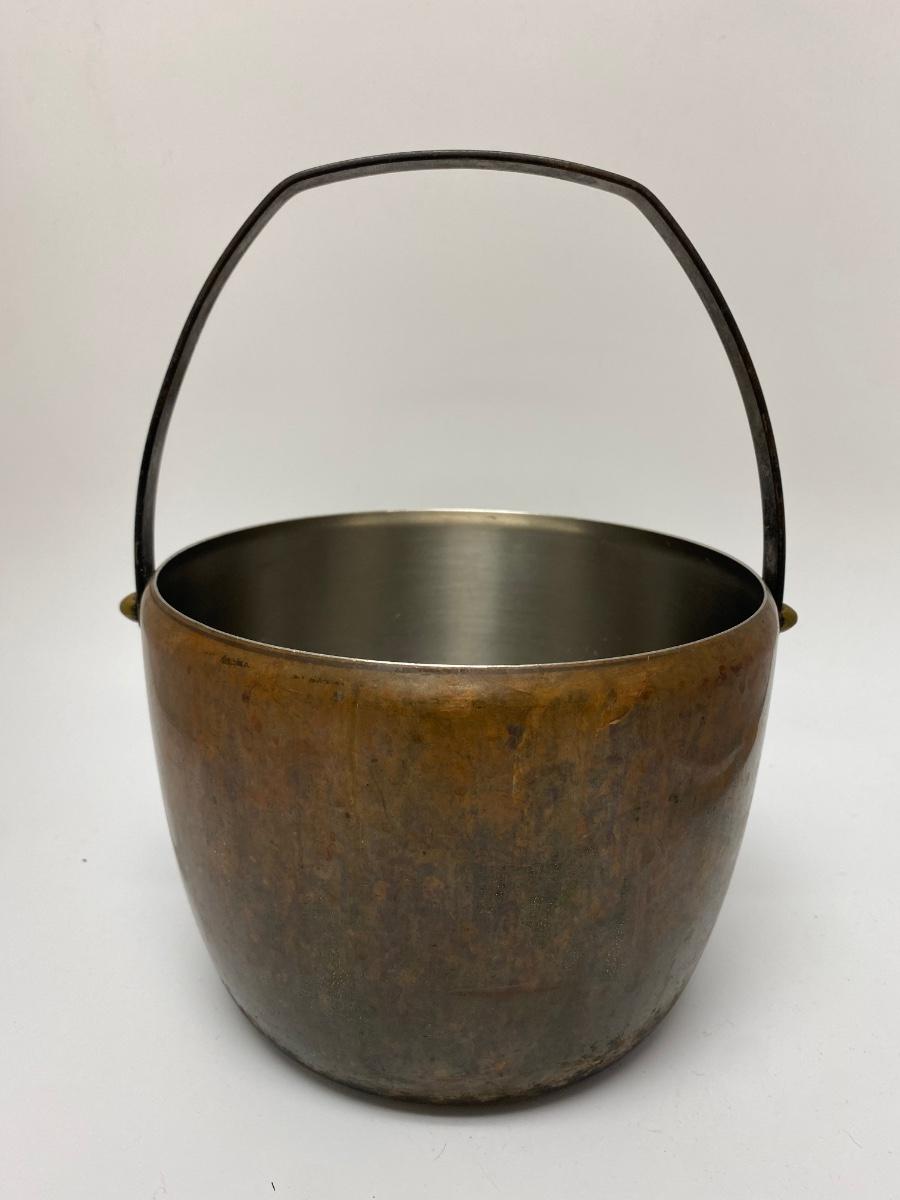 Vintage handled ice bucket pail. Stainless steel inside with a copper outside. Some patina to the copper but in otherwise good condition. About 6" tall and 9" wide. Looks like it may have been used as a cooking pot possibly based on the bottom.