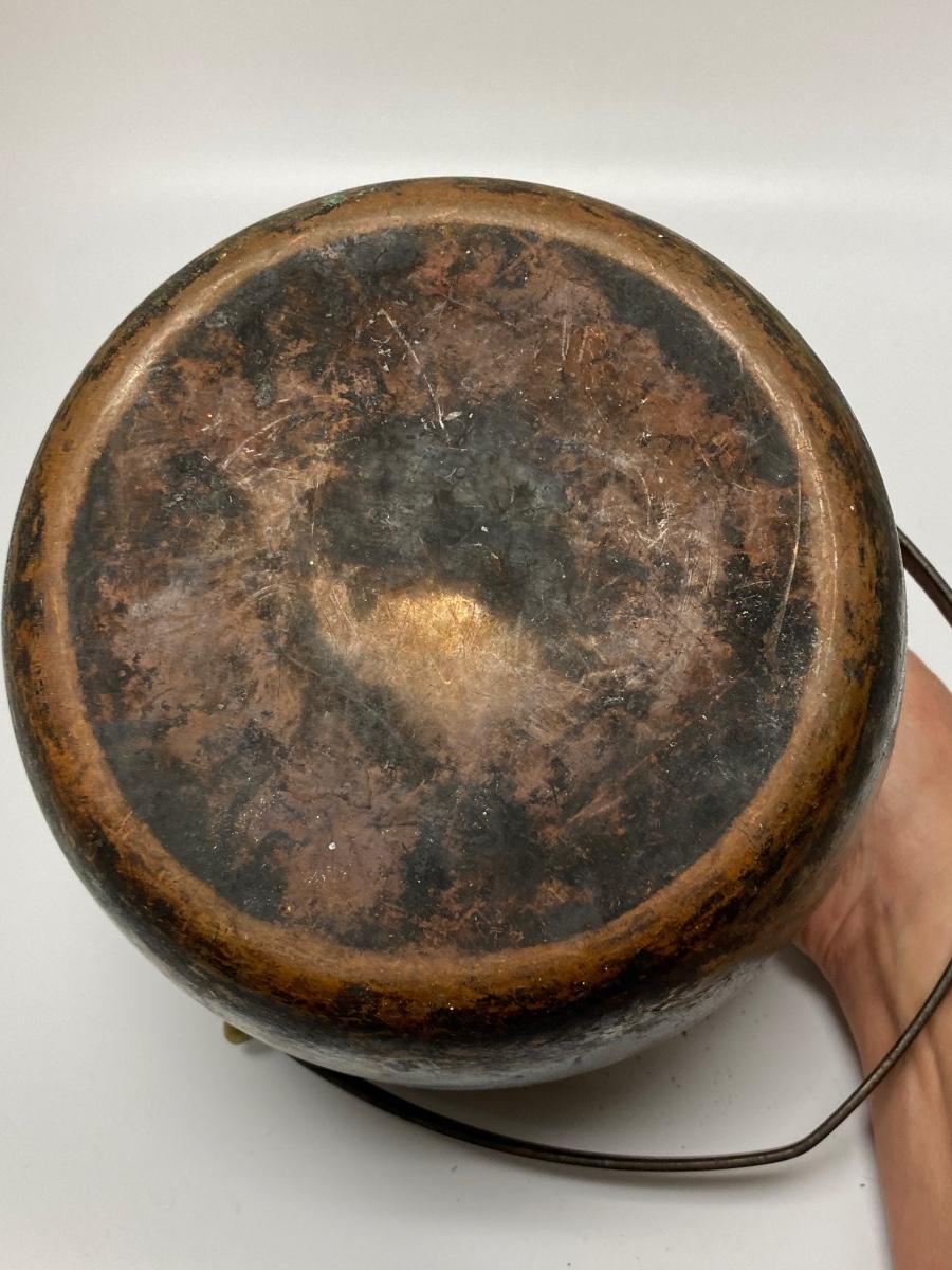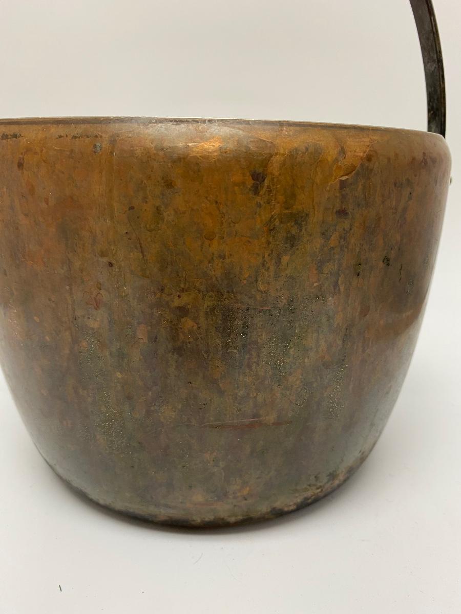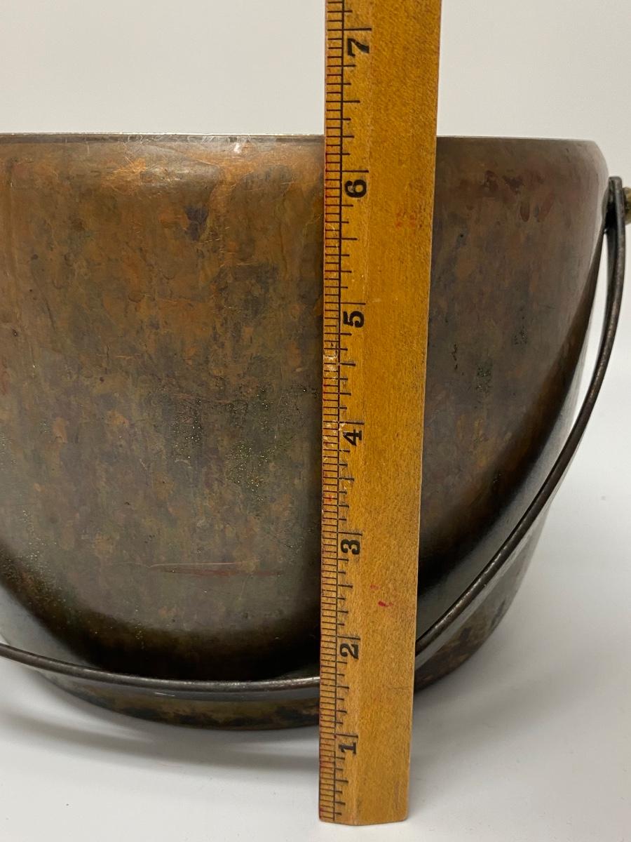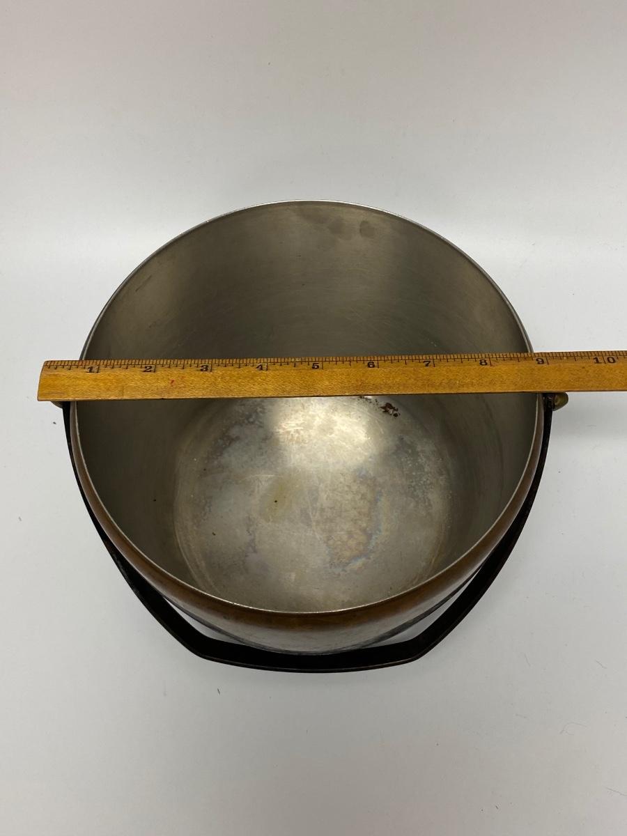 Vintage handled ice bucket pail. Stainless steel inside with a copper outside. Some patina to the copper but in otherwise good condition. About 6" tall and 9" wide. Looks like it may have been used as a cooking pot possibly based on the bottom.