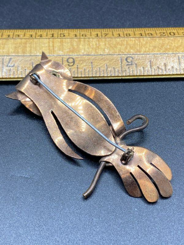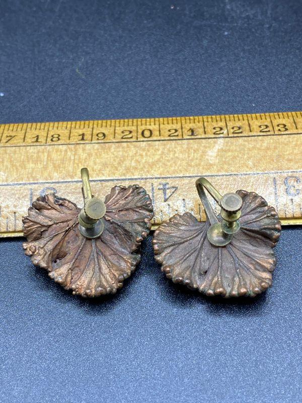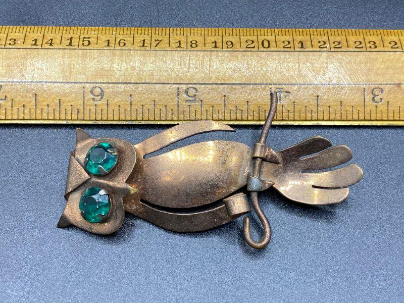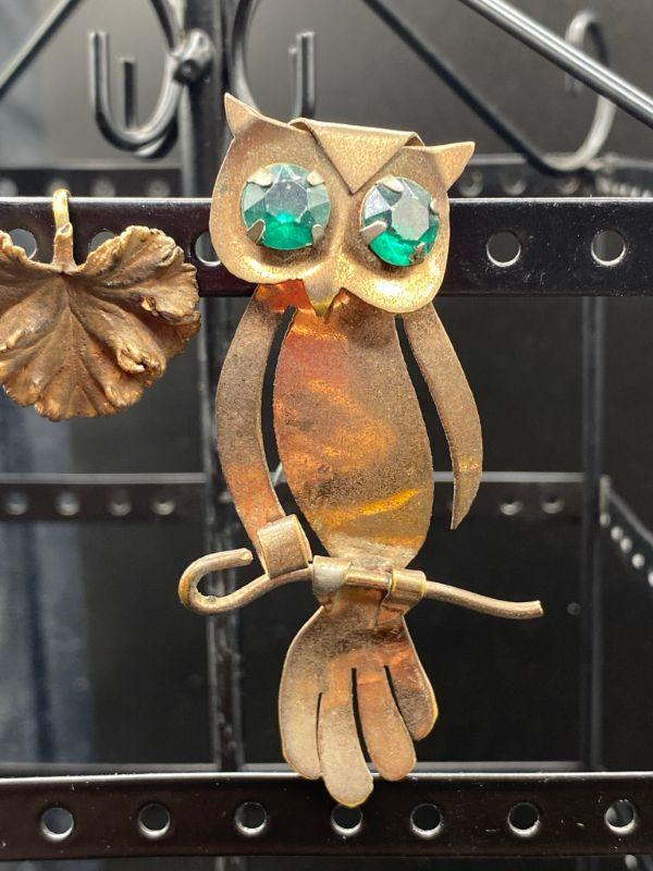 Vintage owl and leaf earrings. Copper tone. Owl has green rhinestone eyes and is almost 3" in length. The leaves are clip style earrings. They look like they might have been real leaves that were bronzed. Both are in vintage condition.