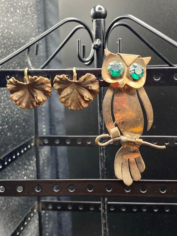 Vintage Copper Tone Owl Pin and Leaf Earrings