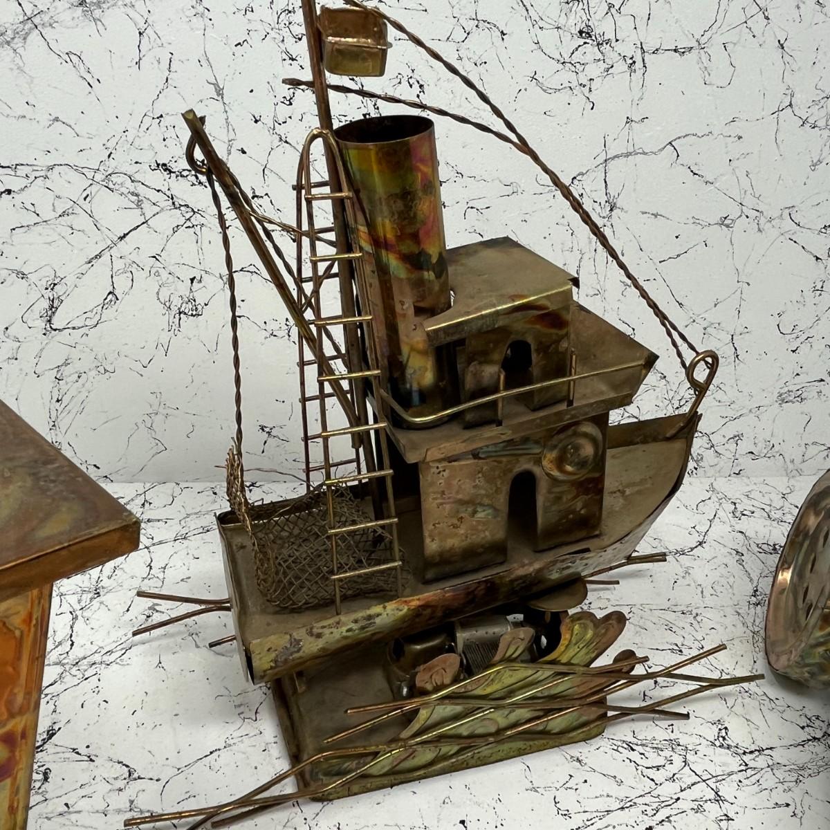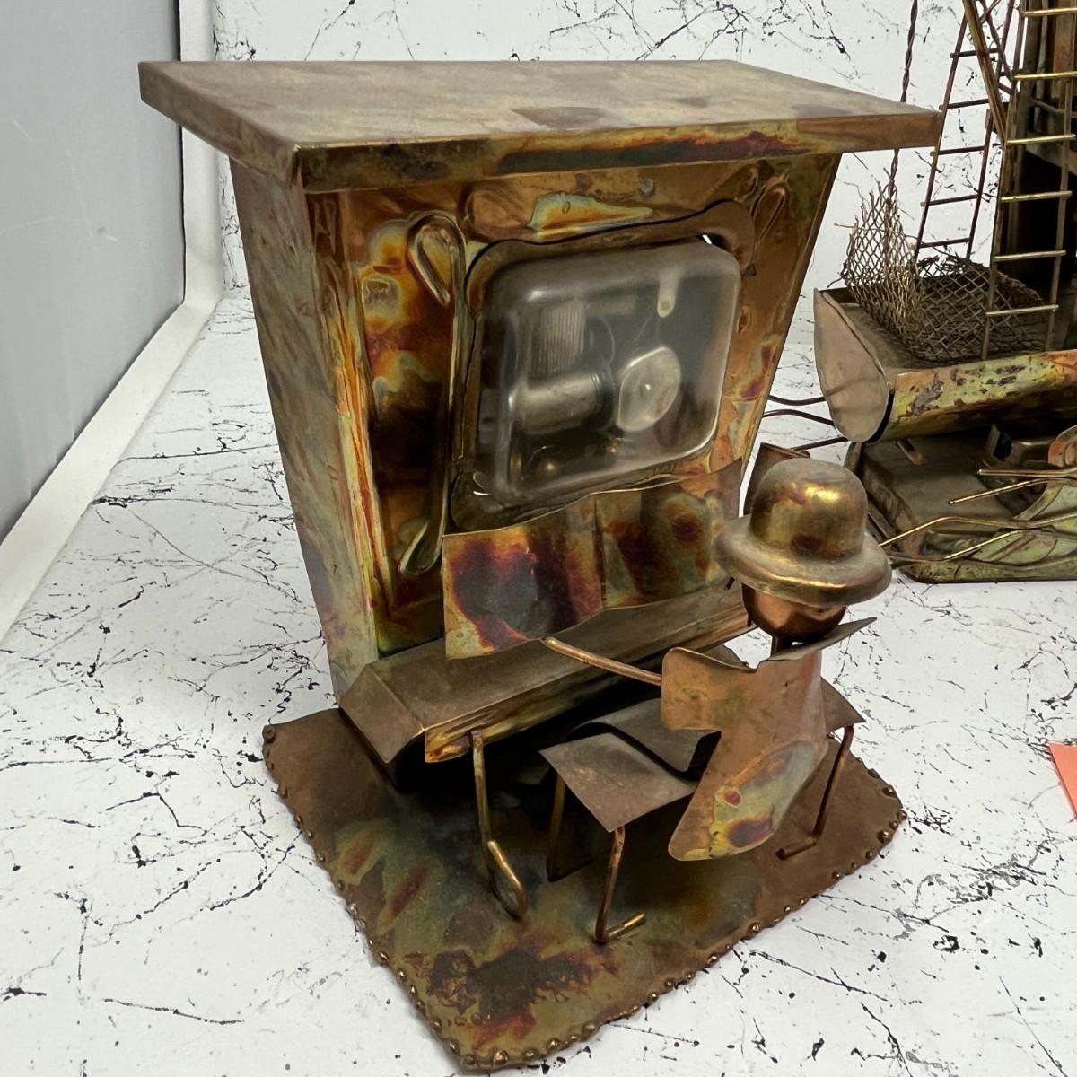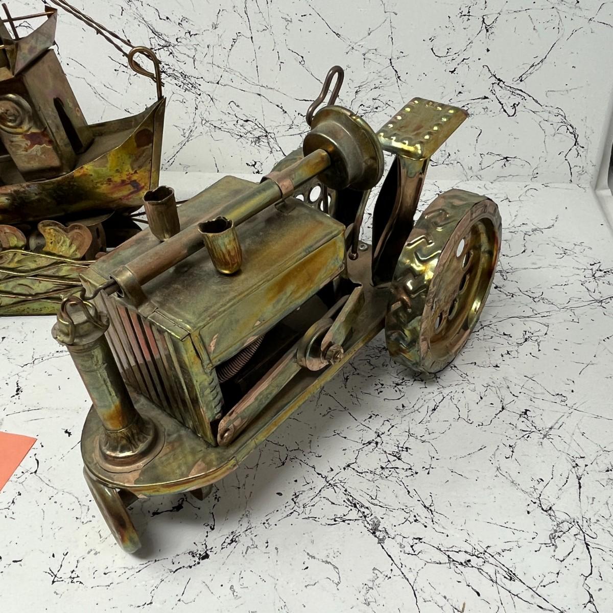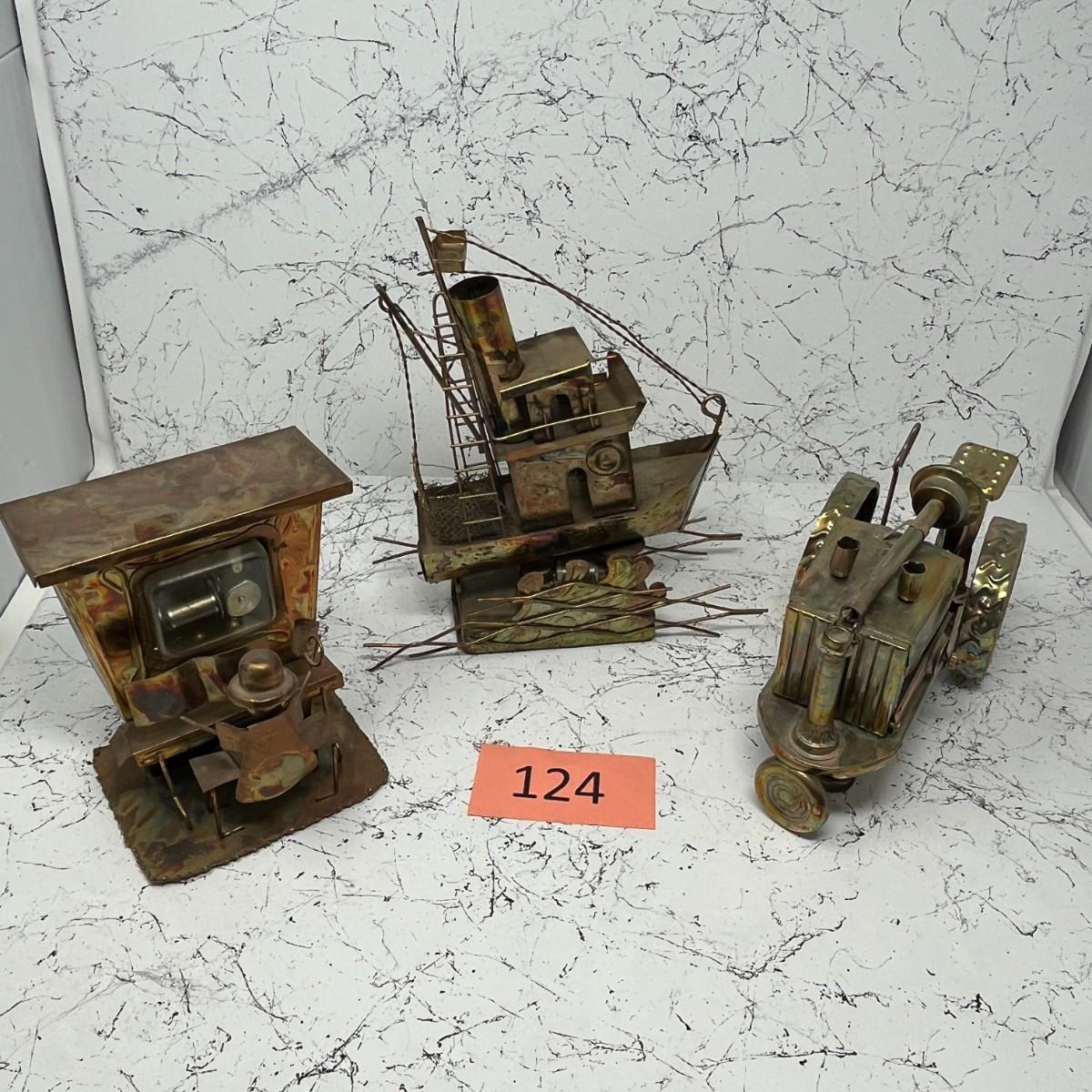 Vintage Copper Wind up Musical Figures, man at piano, Rocking boat, Tractor