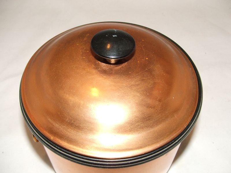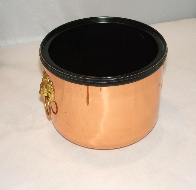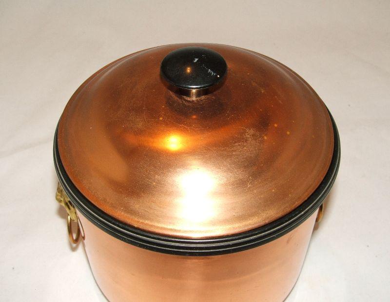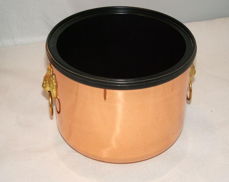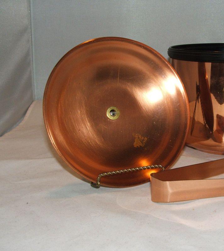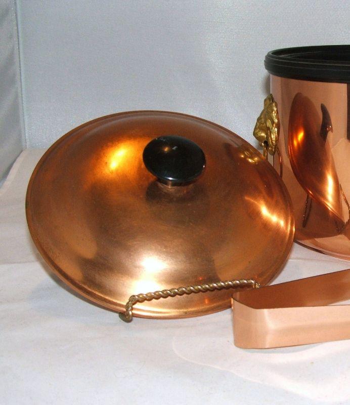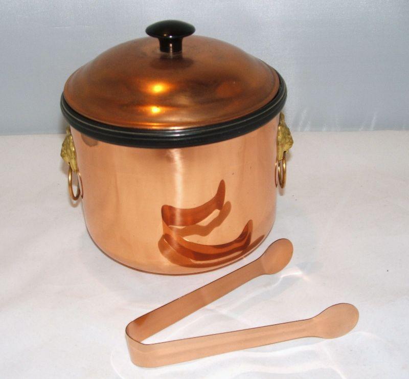 Nice vintage Coppercraft Guild copper ice bucket with brass lion head handles and 6.5" copper ice tongs. Insulated with a black plastic liner. Some oxidation marks and wear (that are consistent with vintage items), as shown in photos. I have read Barkeepers Friend works wonders on copper. Bucket and lid are in good condition with no cracks or dents. Approx. 7" high with lid and 7" across. Stand not included.