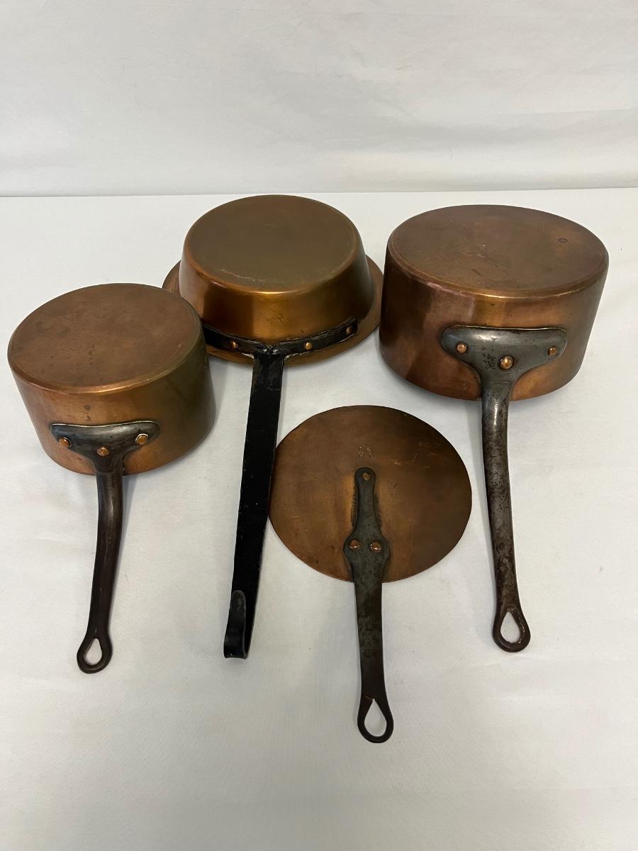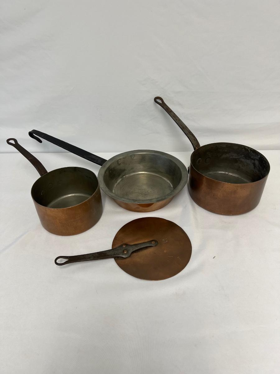Includes 3 pans and one lid. Total of 4 pieces. Measurement of largest: 10" diameter. [LV]
