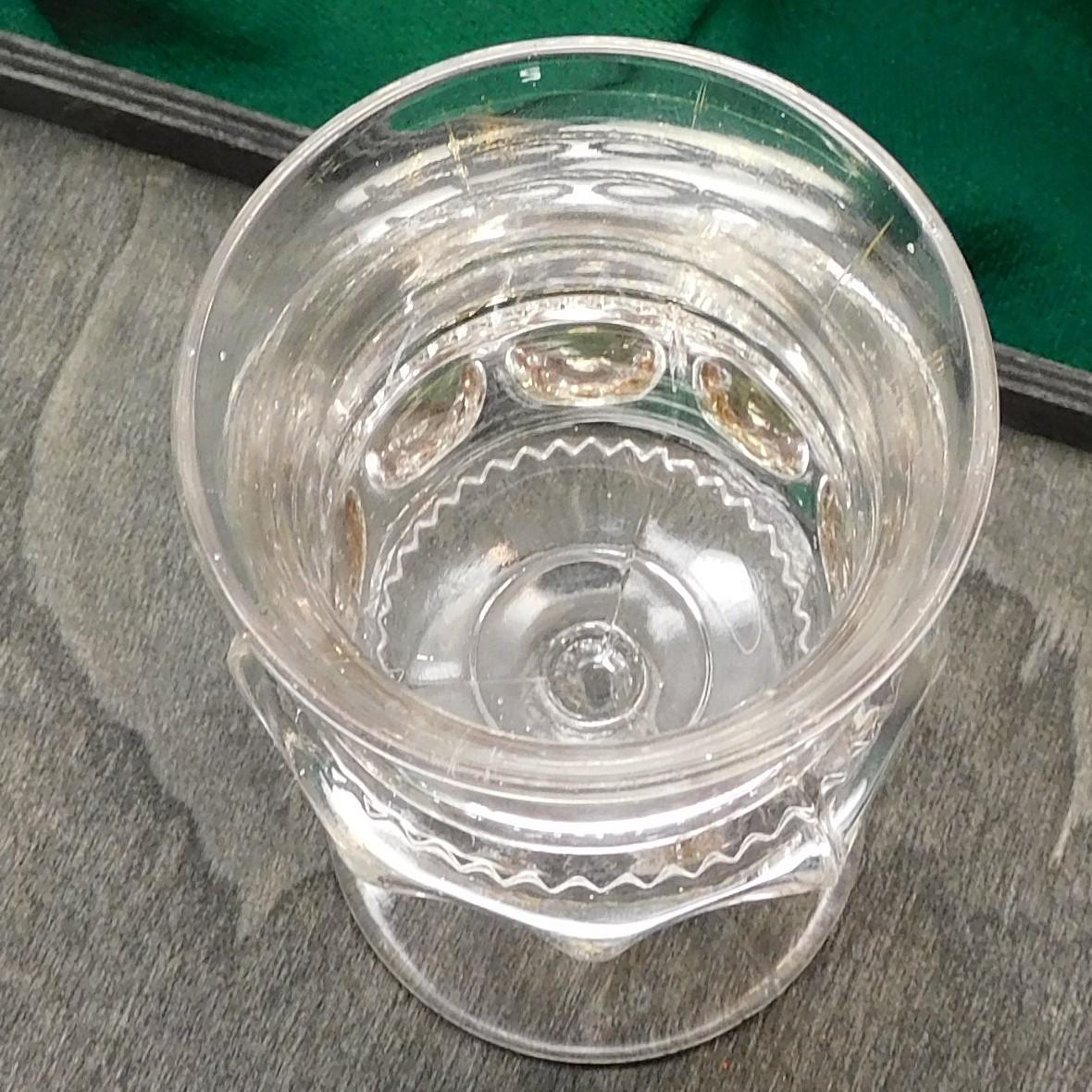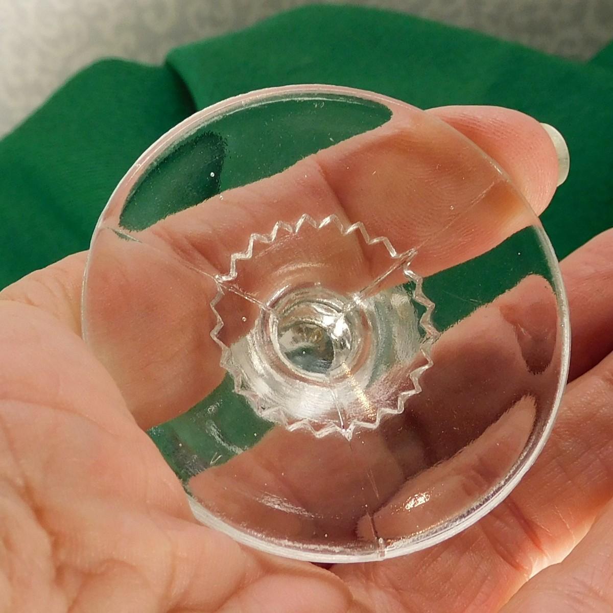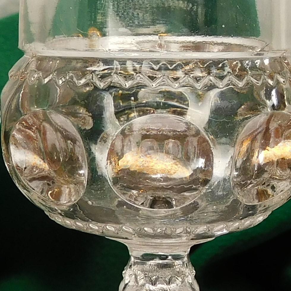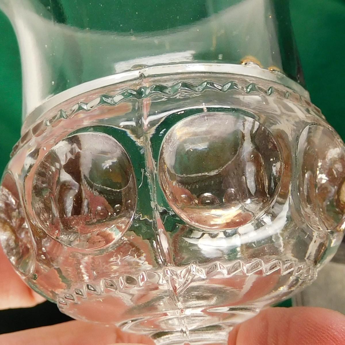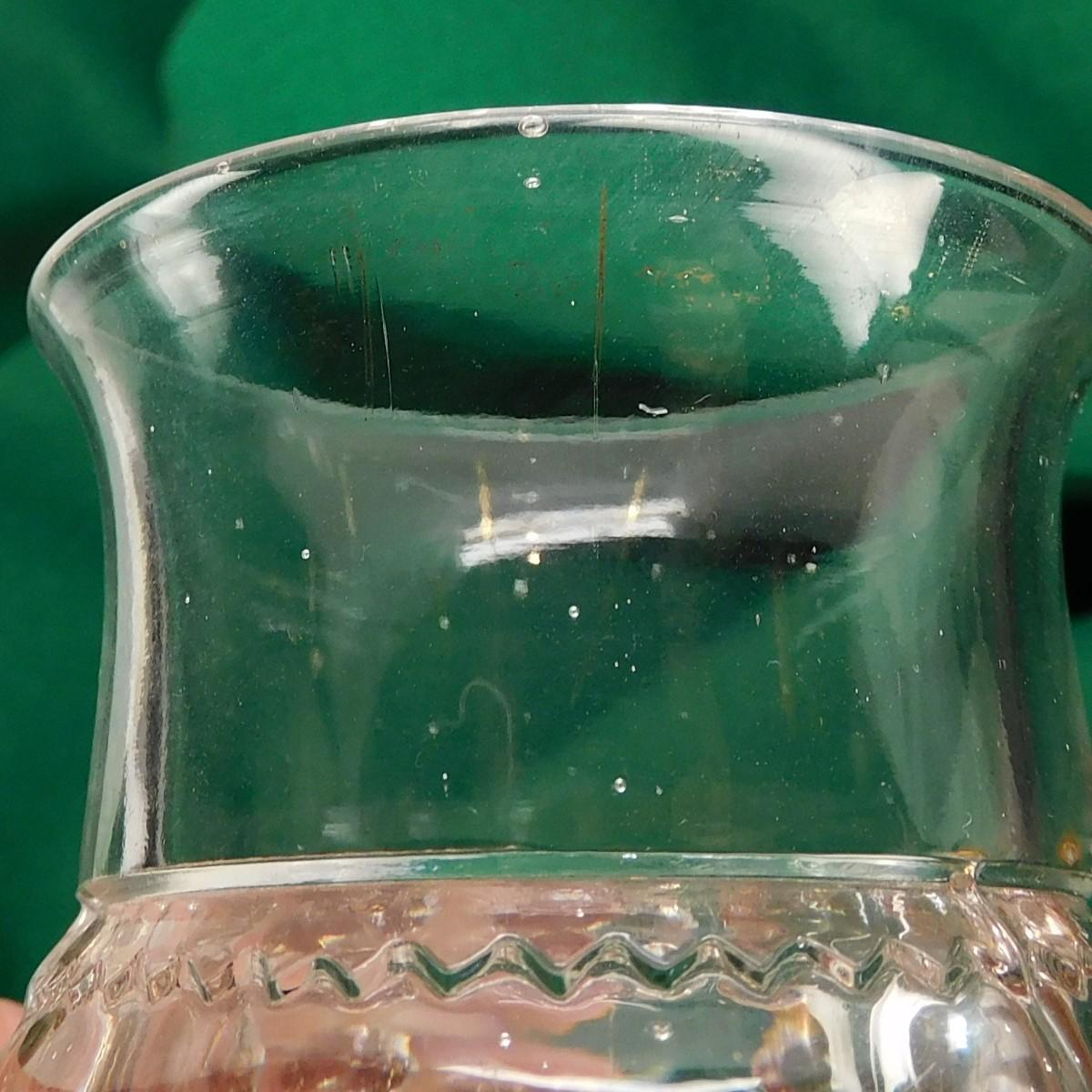 This is vintage cordial or after dinner liqueur glass. This is Colony Crown pattern which was very popular in the 1950's. This one has a pink hue. It also has bubbles in the glass which shows its age. It is about 3 3/4" tall x 2" dia.