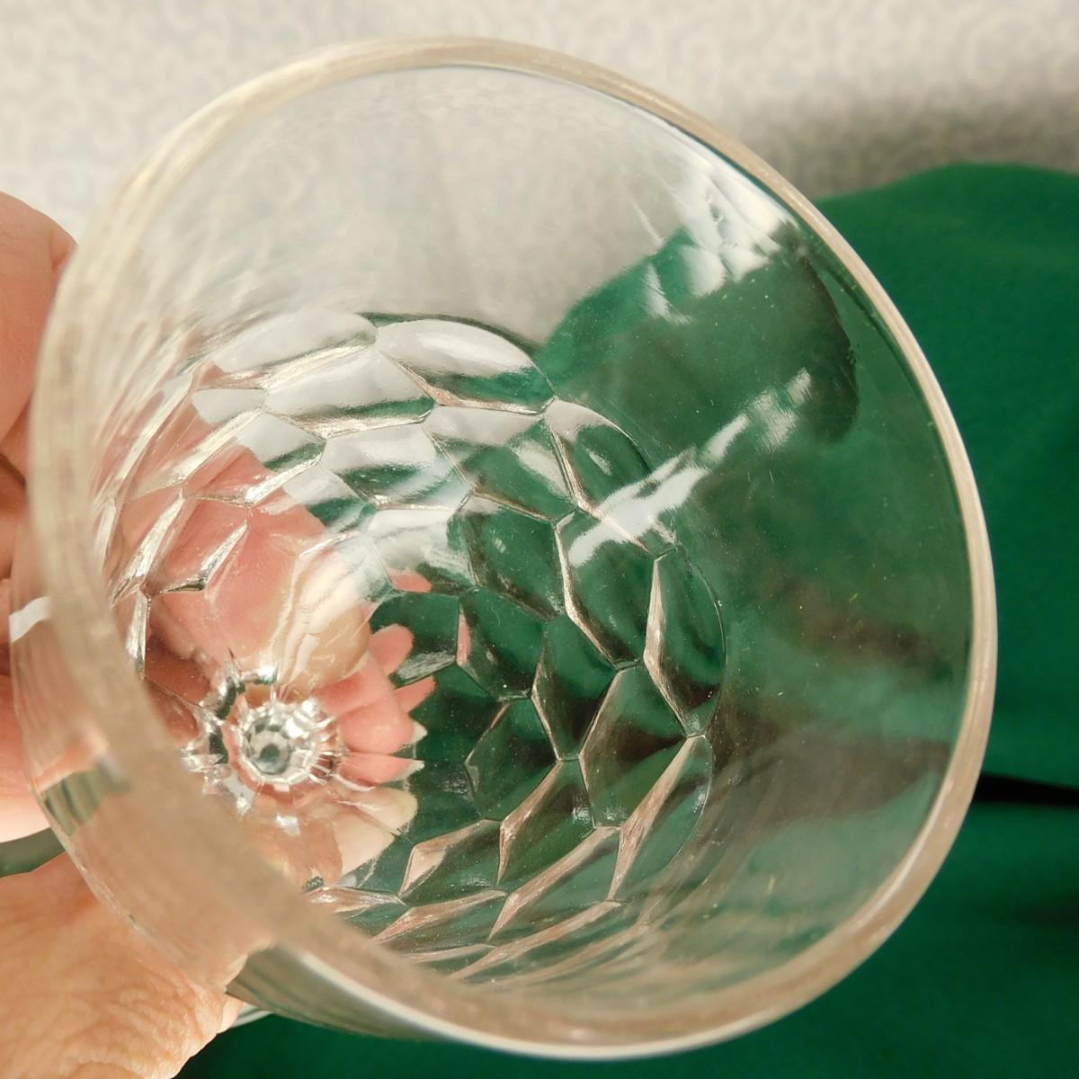 This is vintage cordial or after dinner liqueur glass. This cordial glass has nice geometric pattern. It is about 4" tall x 2" dia.
