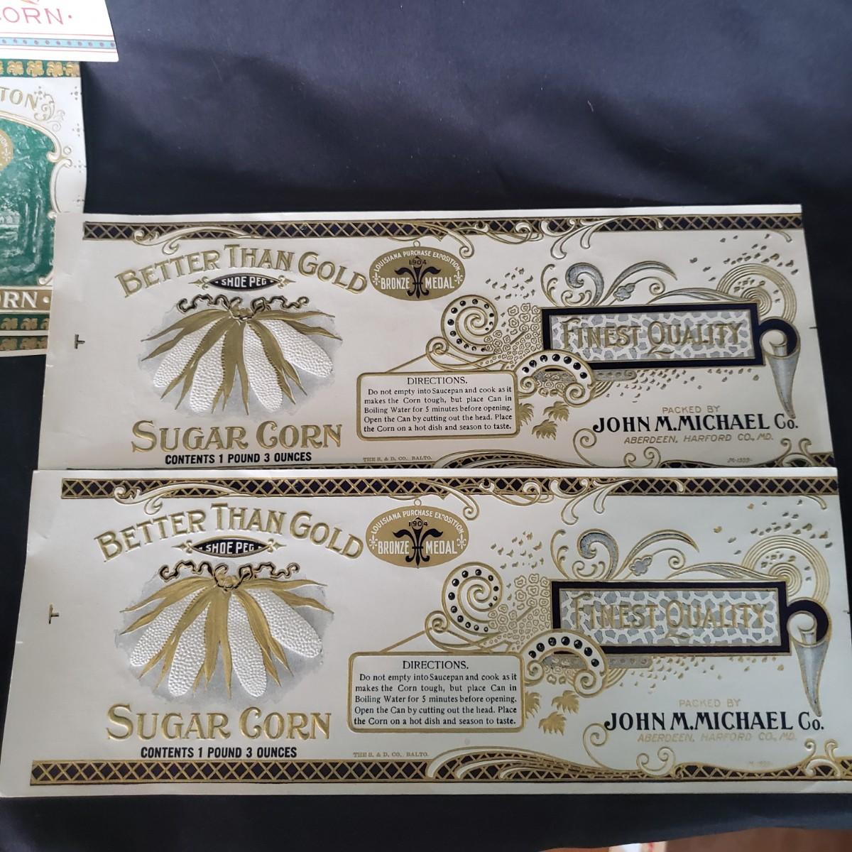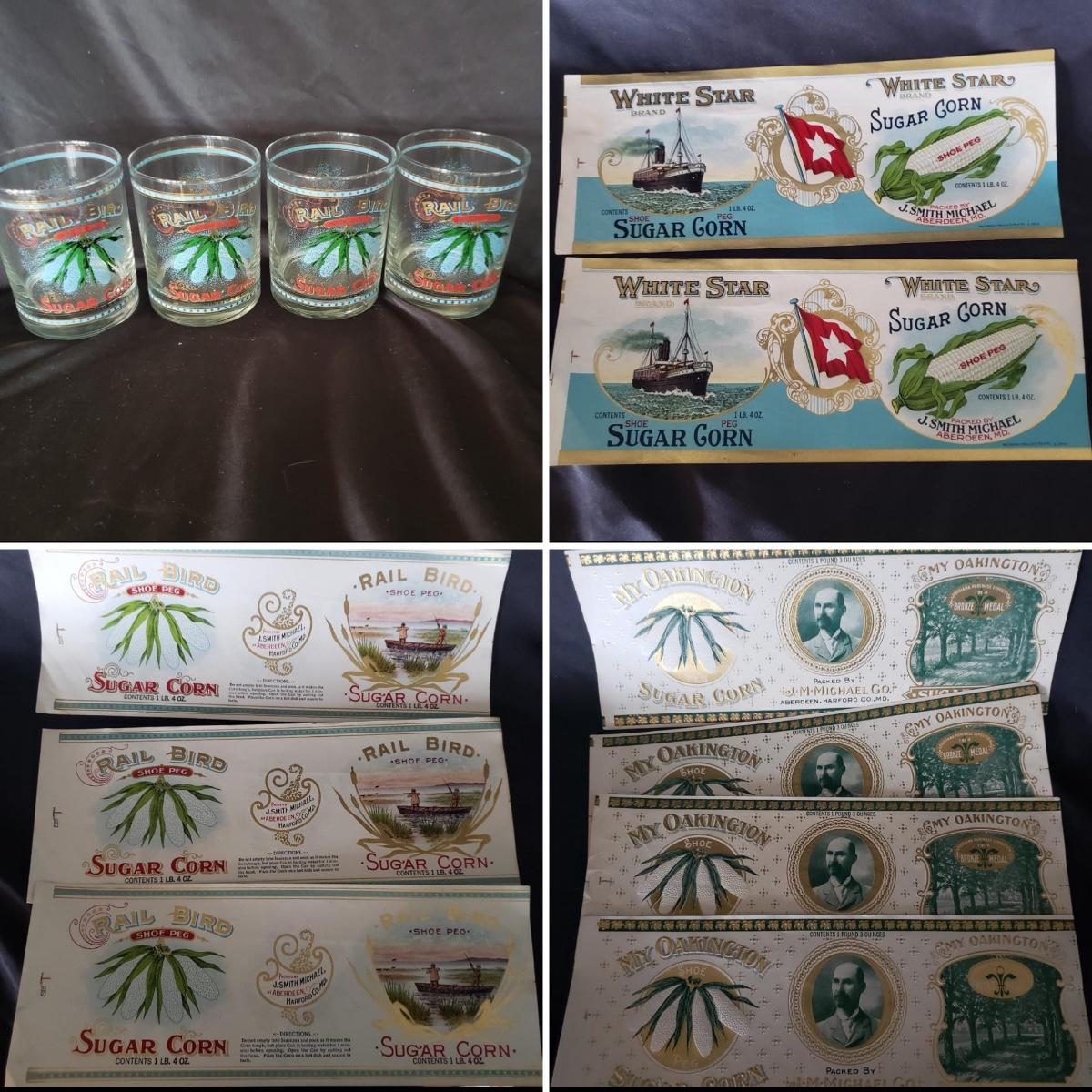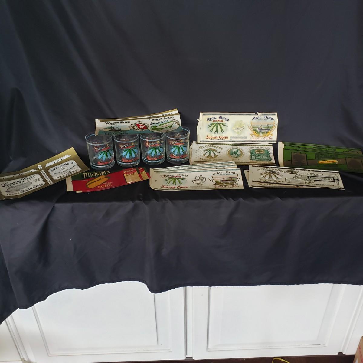 This vintage corn label lot has multiple brand labels and four glasses with a corn label. See pictures for details.