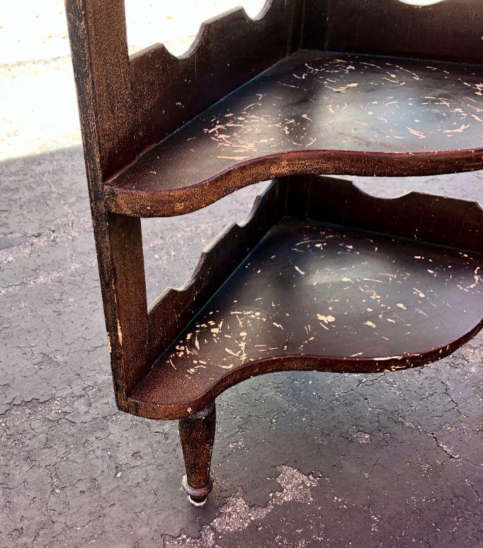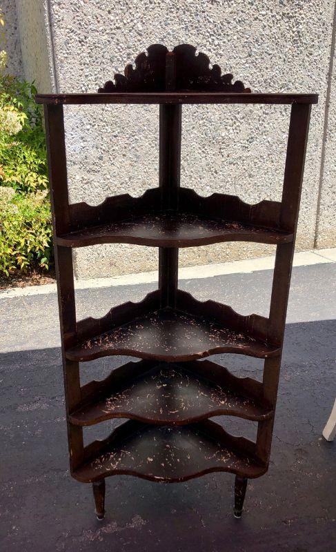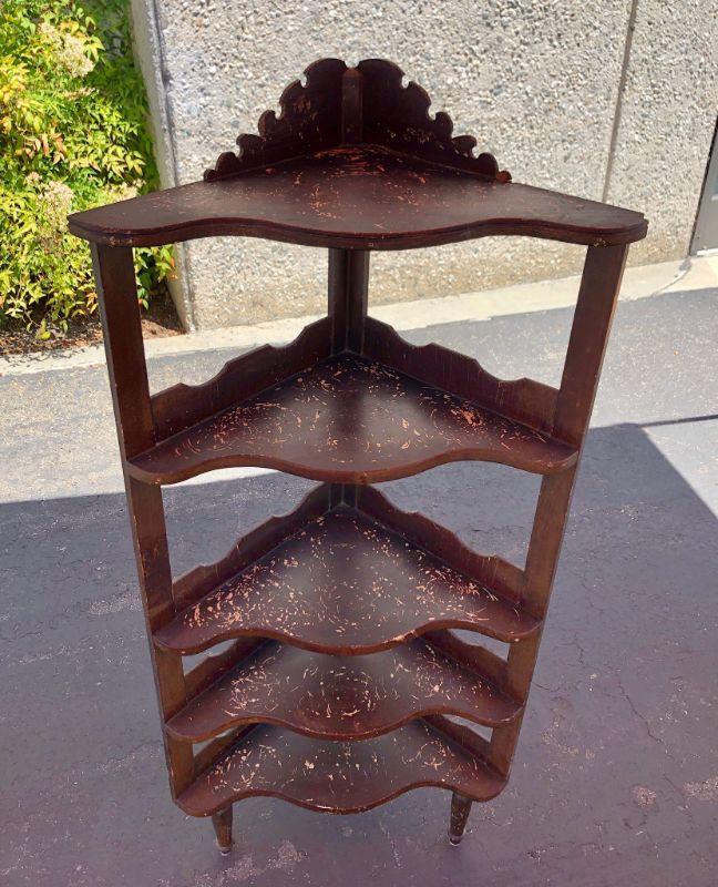 Vintage Corner Display Shelf. Multiple shelves, open back. Has signs or wear. Could be used as is or refinished.