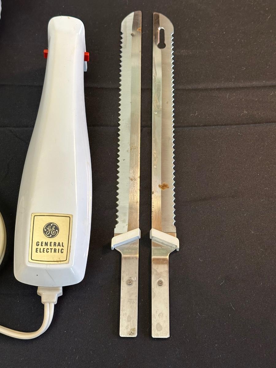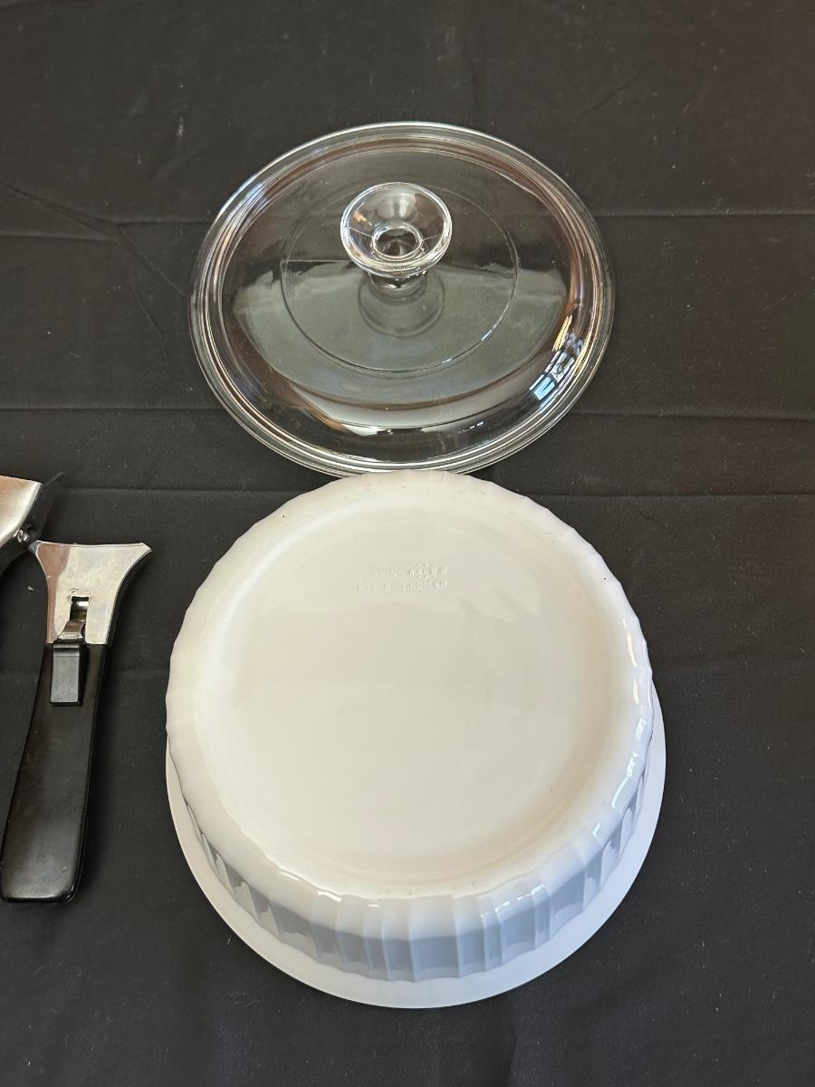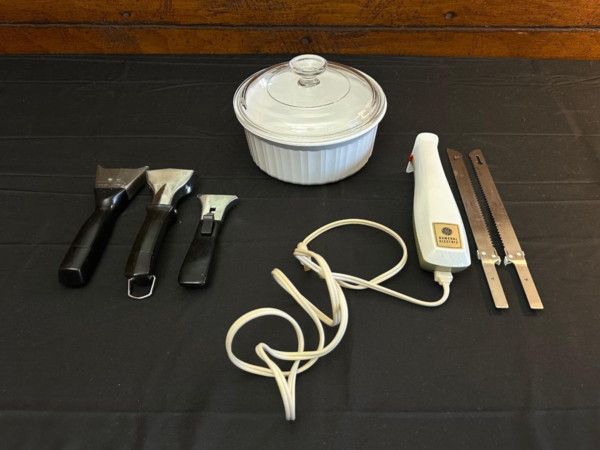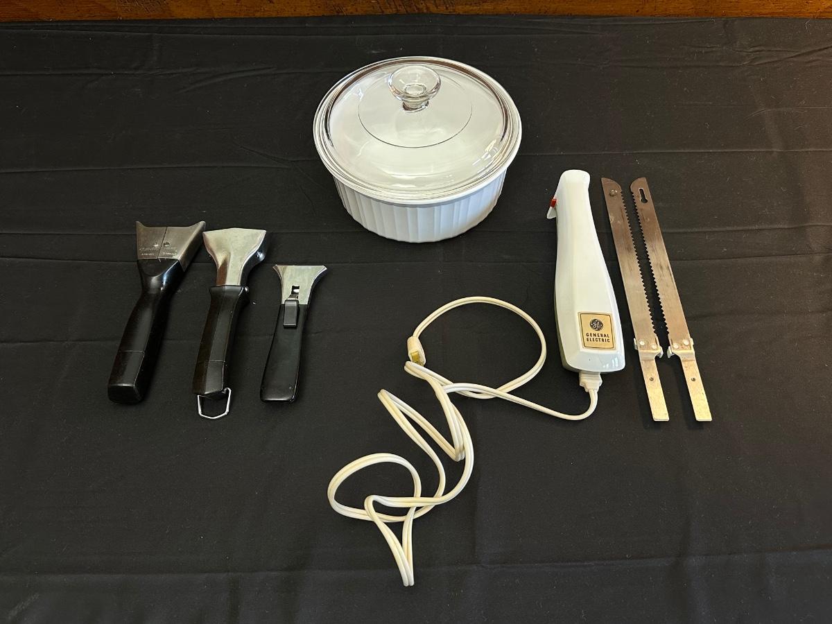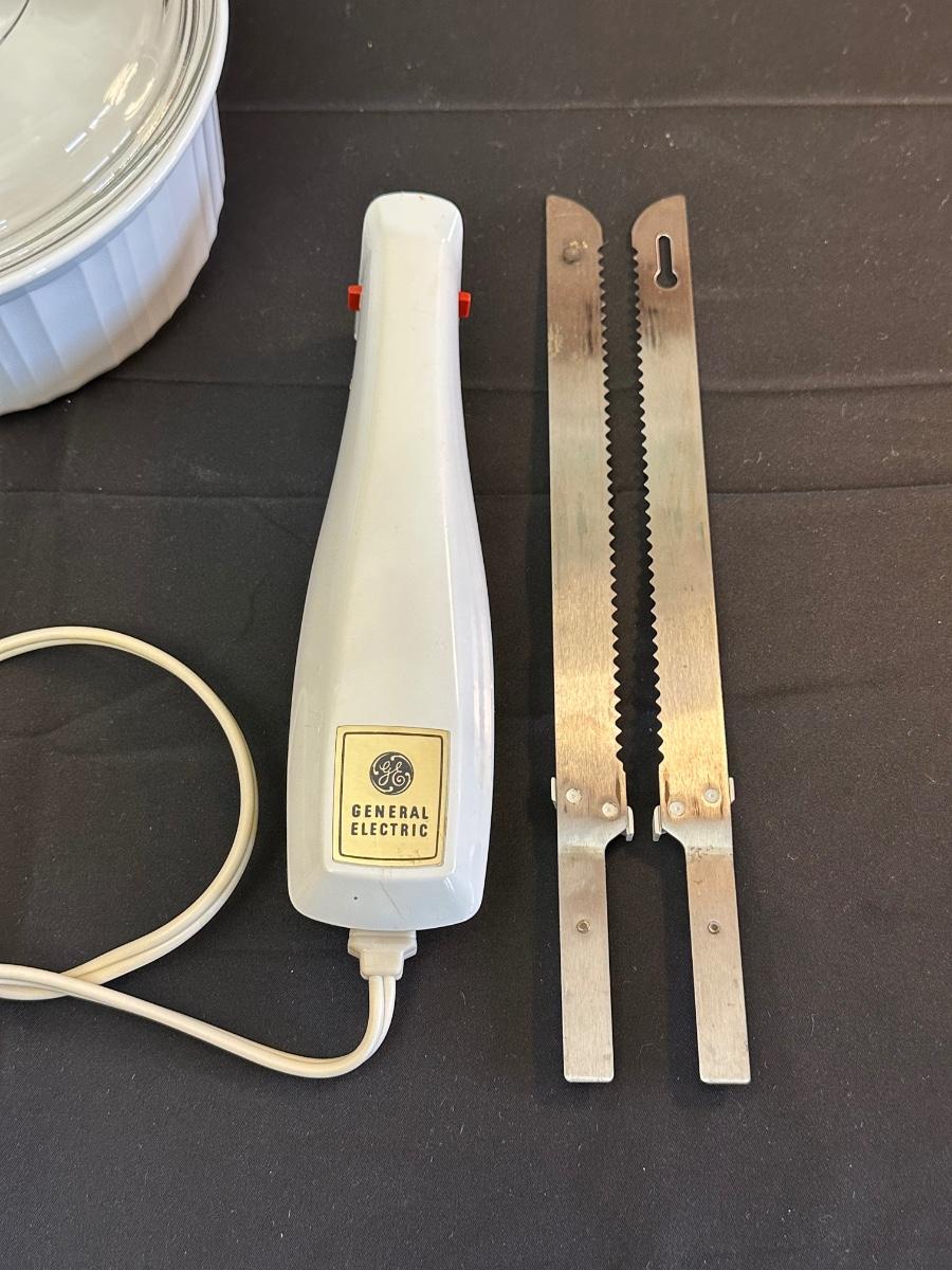 Two Corning Ware Handles and Casserole Dish and a GE Electric Slicing Knife - EK15. The smallest handle is unbranded.