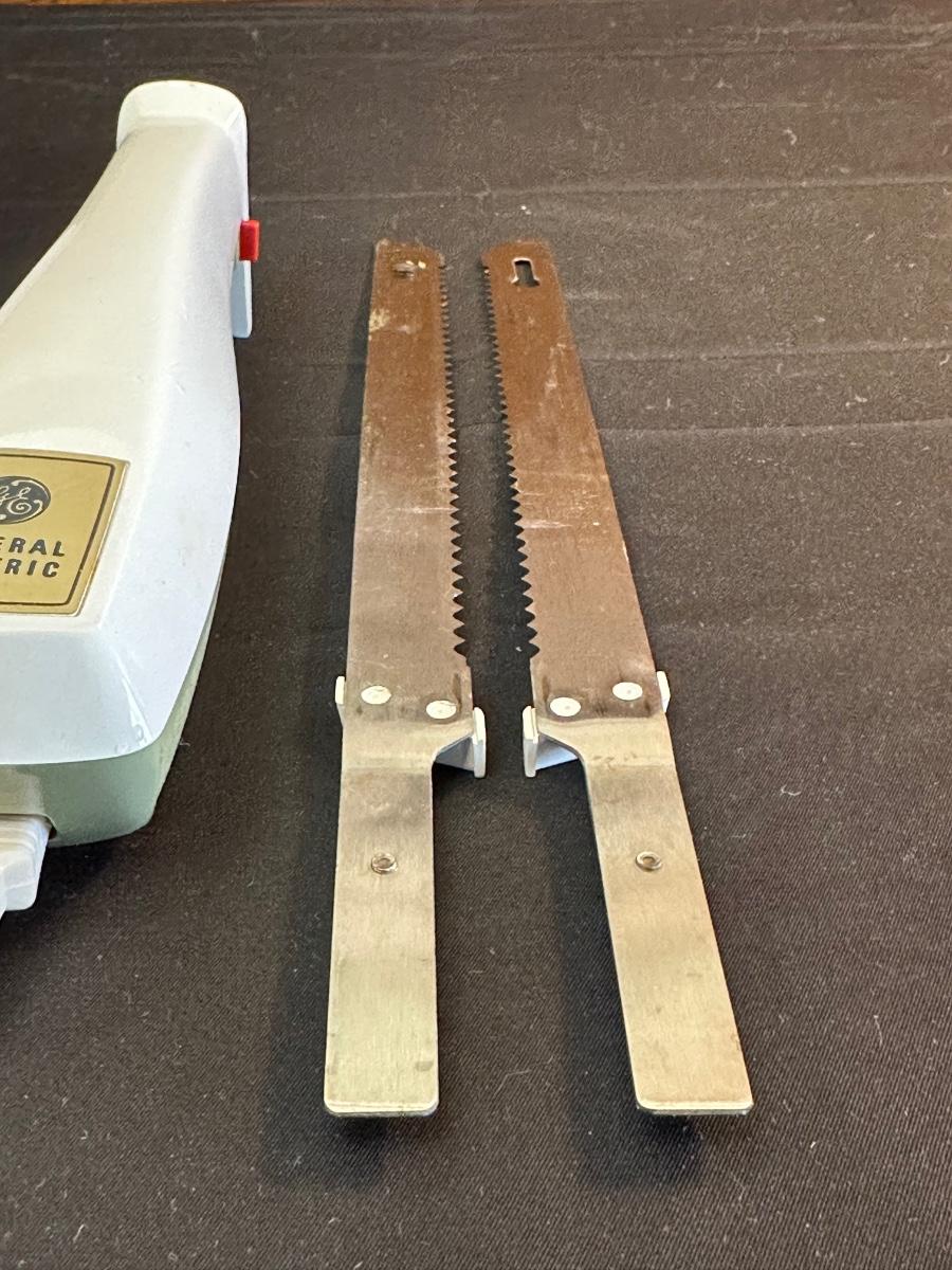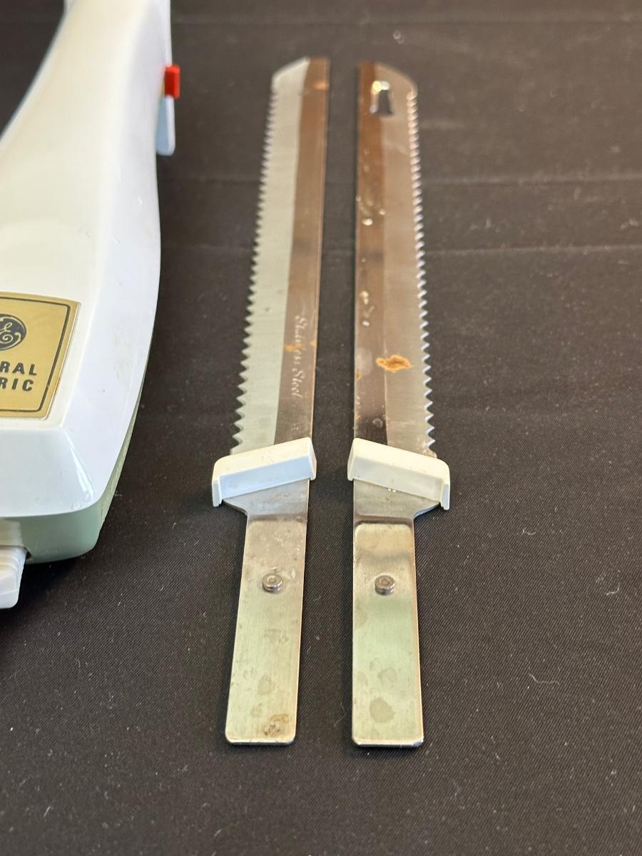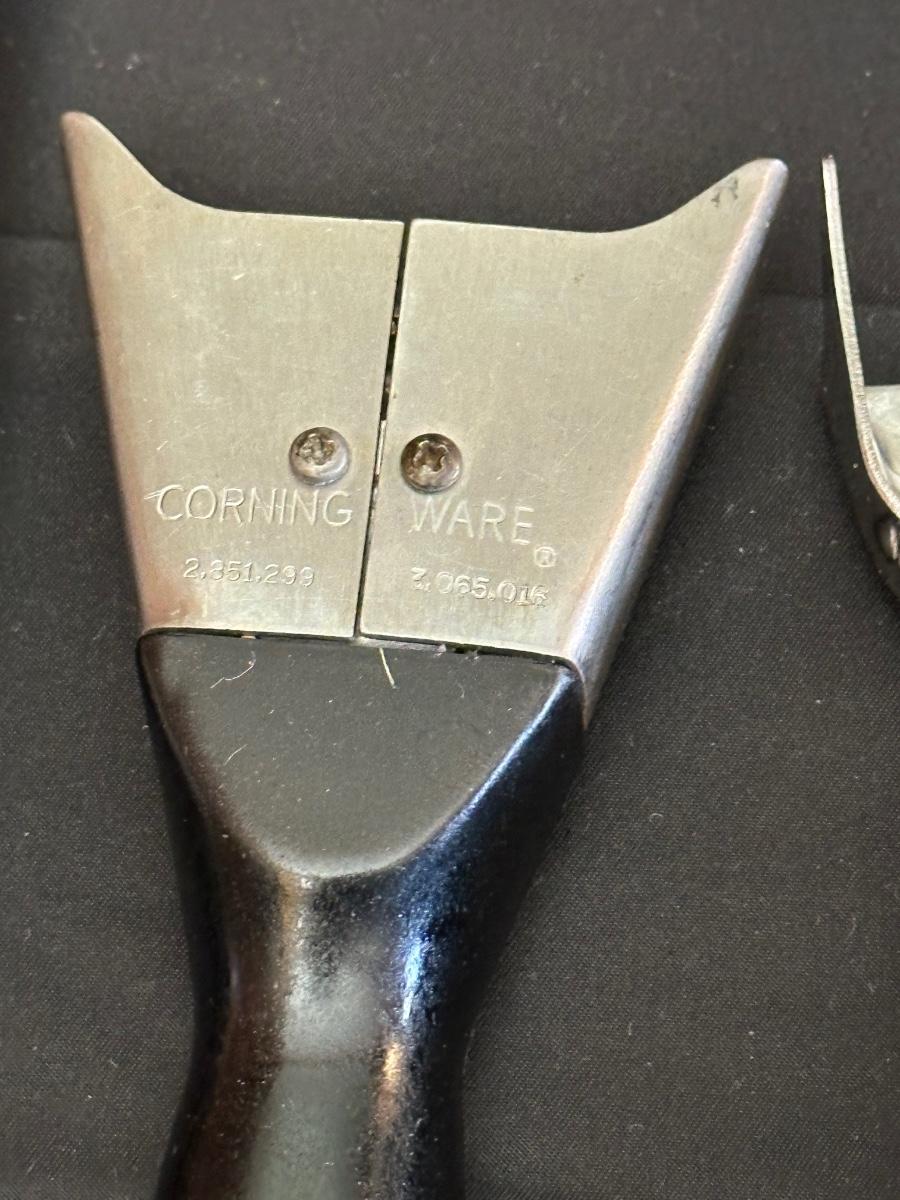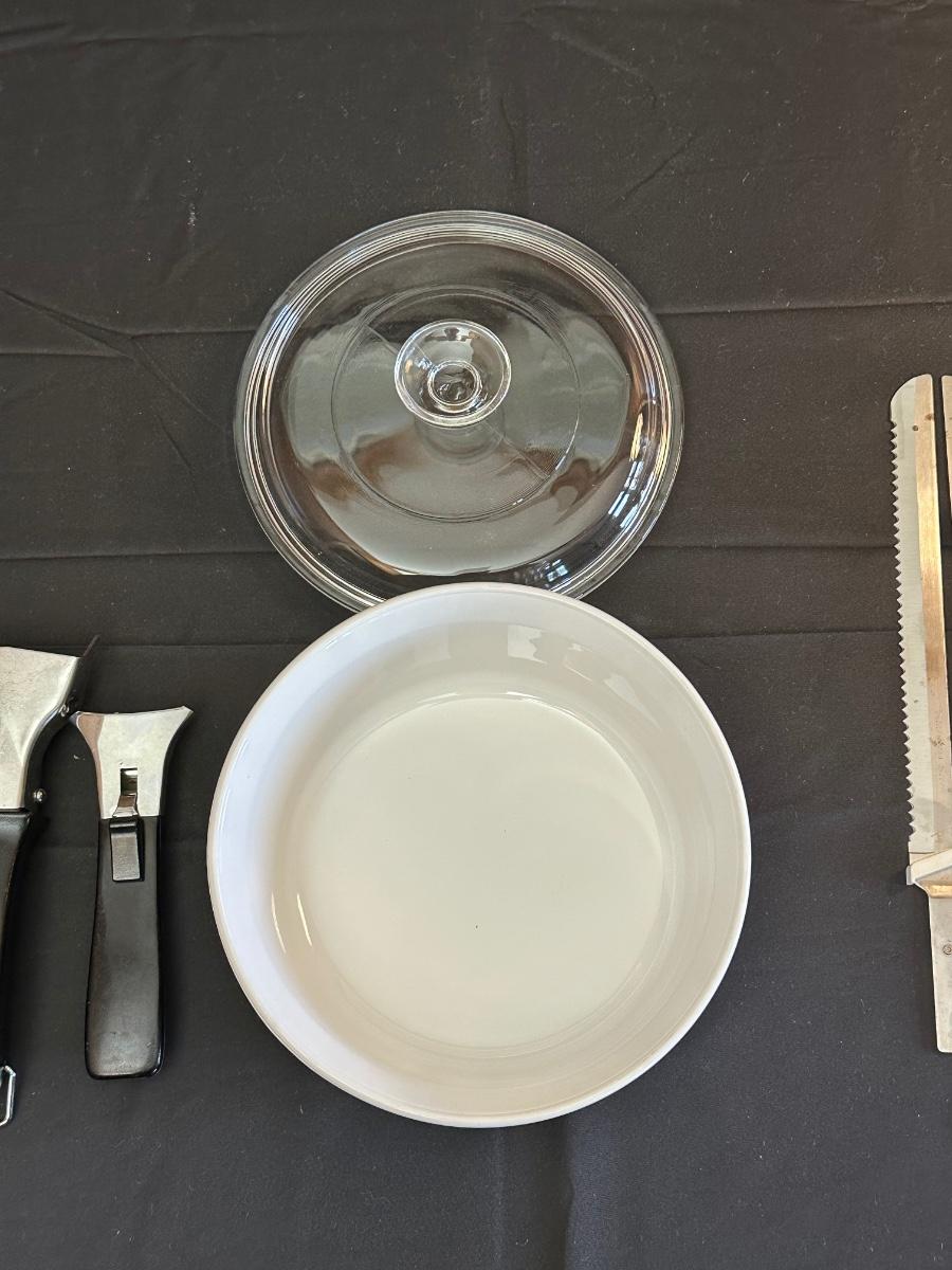 Two Corning Ware Handles and Casserole Dish and a GE Electric Slicing Knife - EK15. The smallest handle is unbranded.