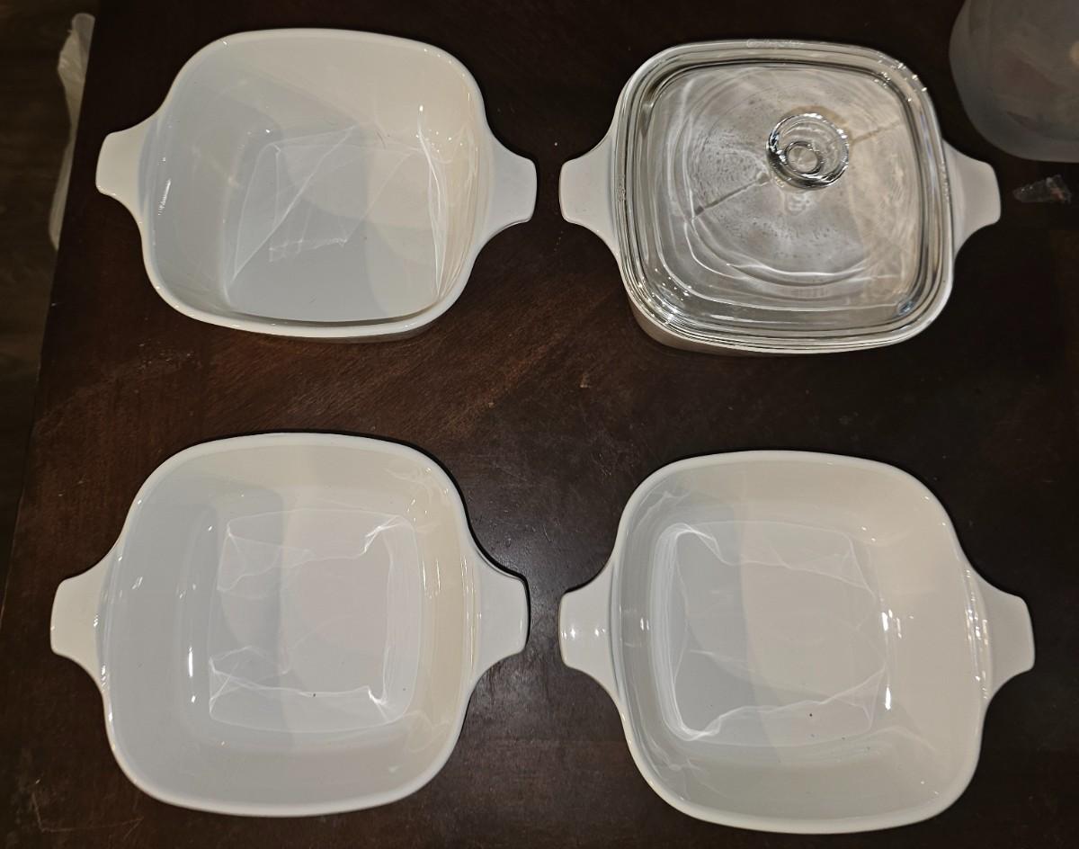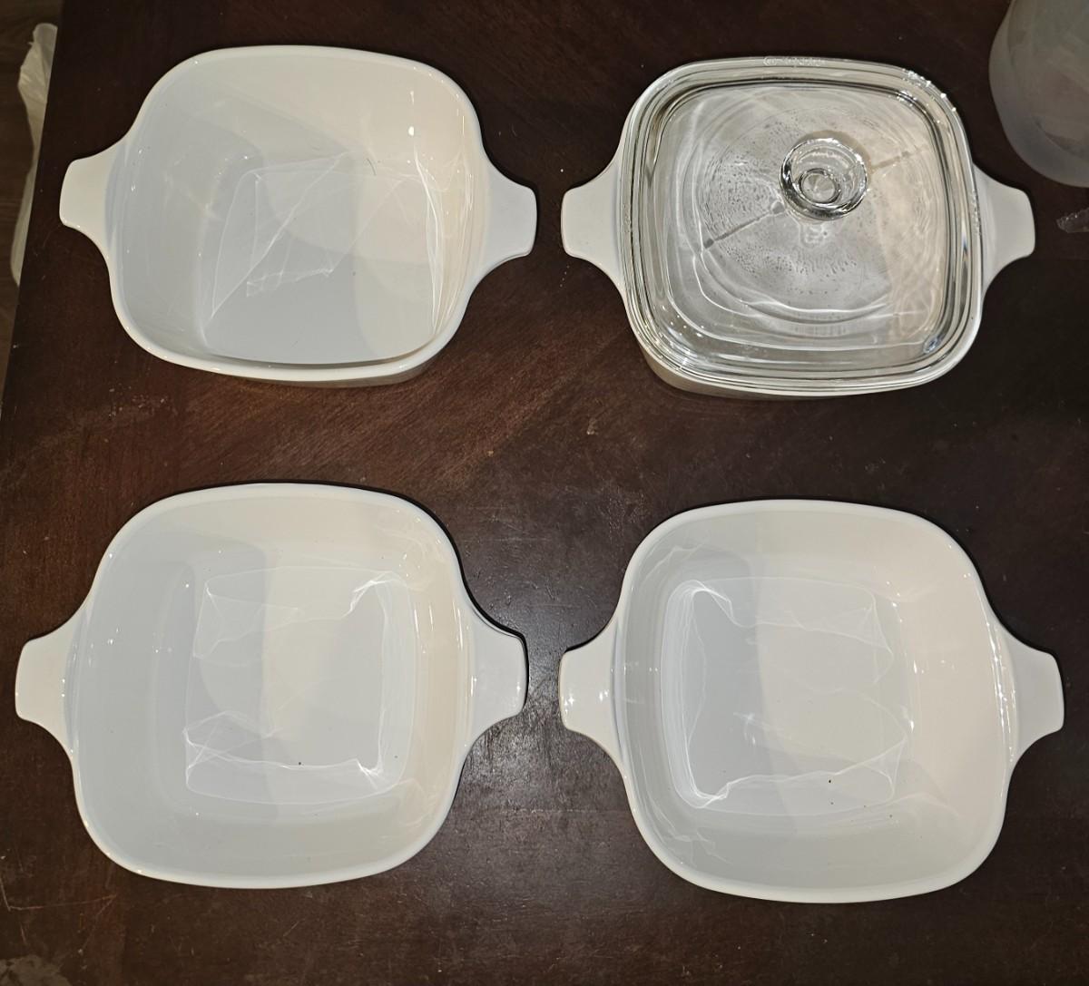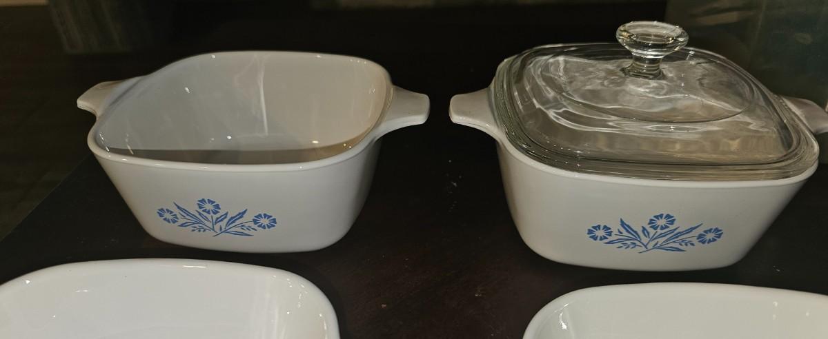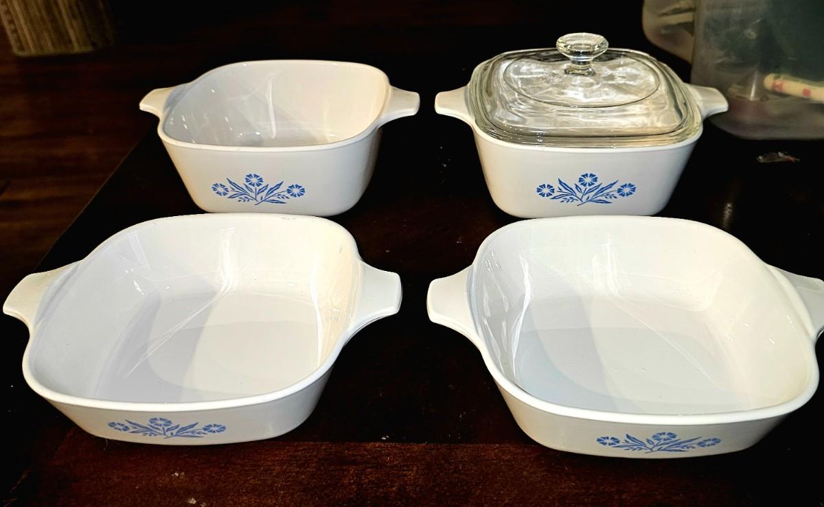 Vintage Corning Ware Blue Cornflower Set of 4 comes with 2- 41 bowl and 2-43 bowls, 1 glass top cover and 3 plastic covers. All 4 pieces excellent condition, no chips, scratches, etc..