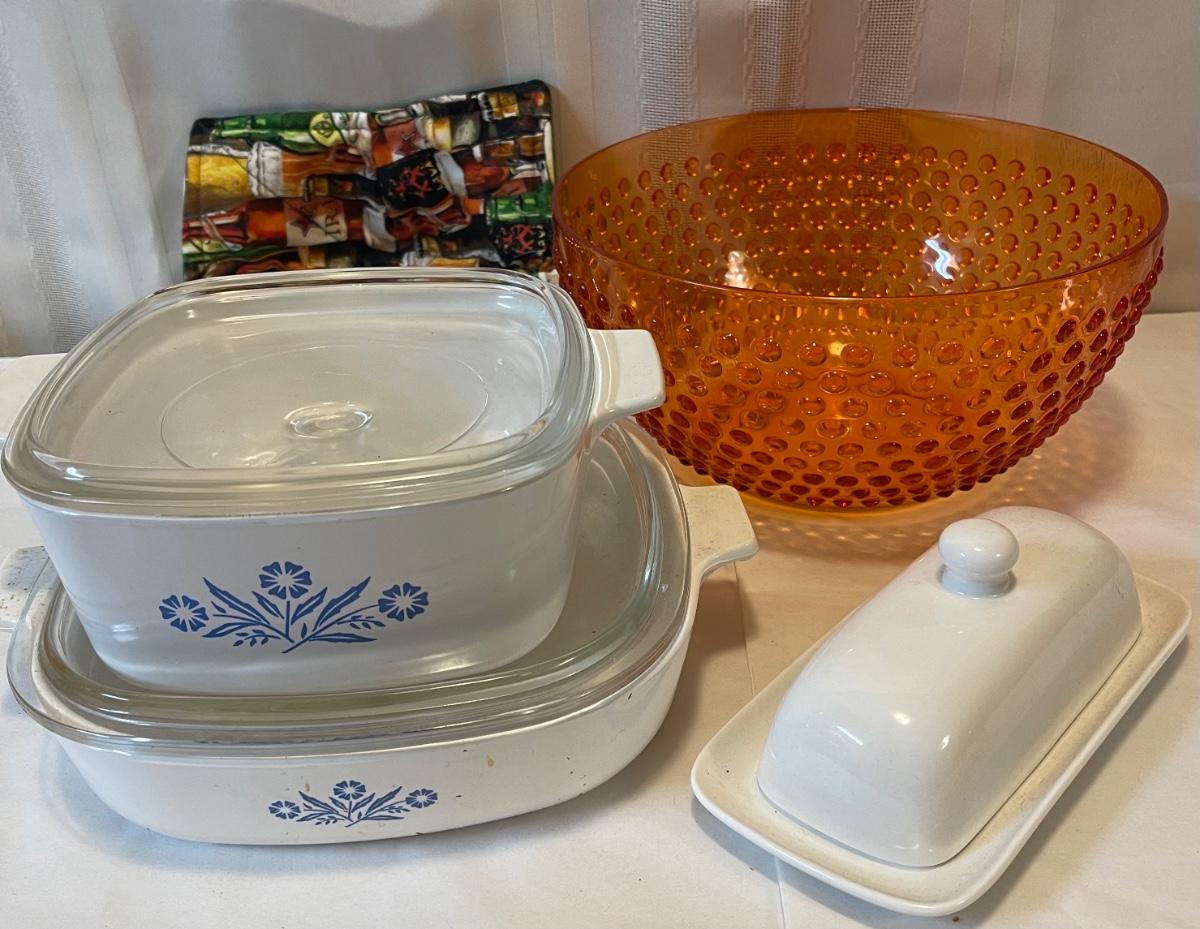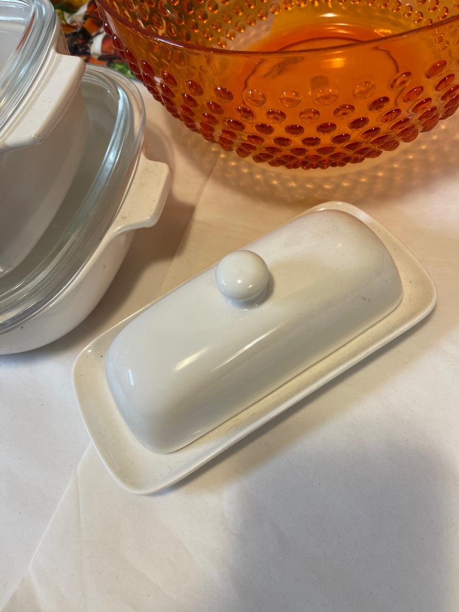 Vintage, corning, ware, butter, dish,, plastic orange bowl