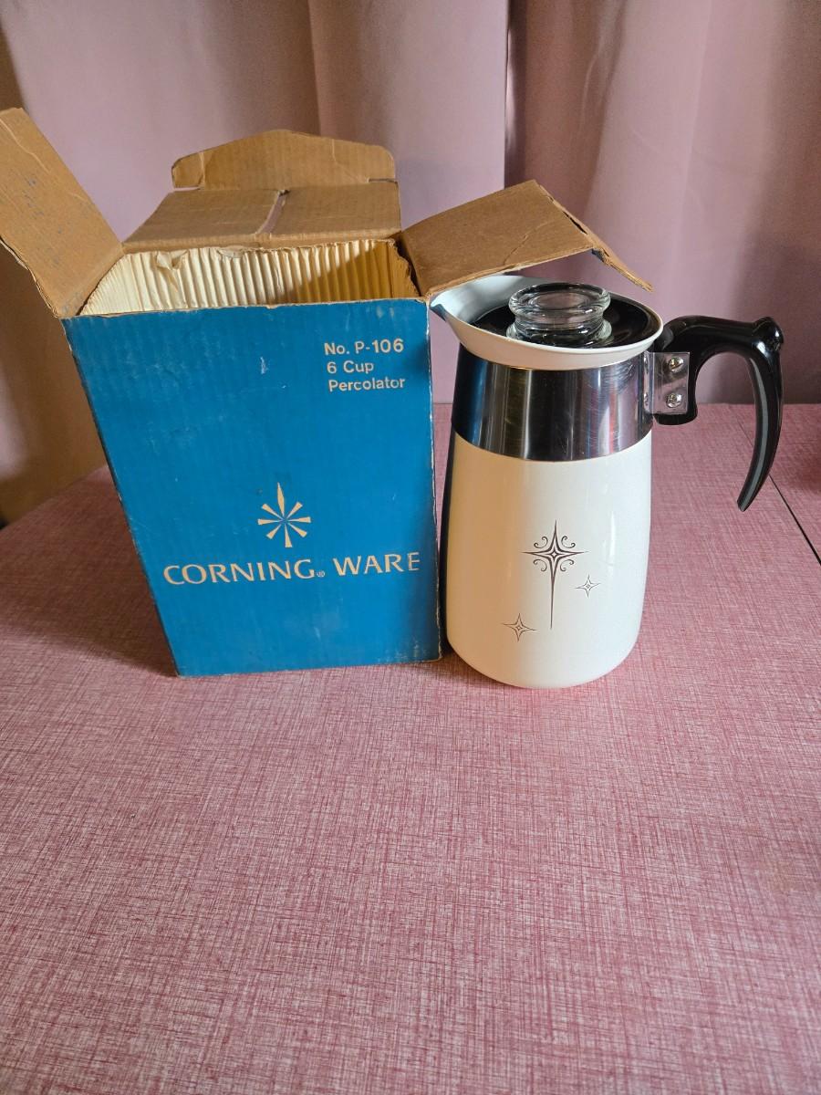 Vintage in original box 6 cup Corning ware percolator. Rare Atomic Starburst design in Black & white non electric.